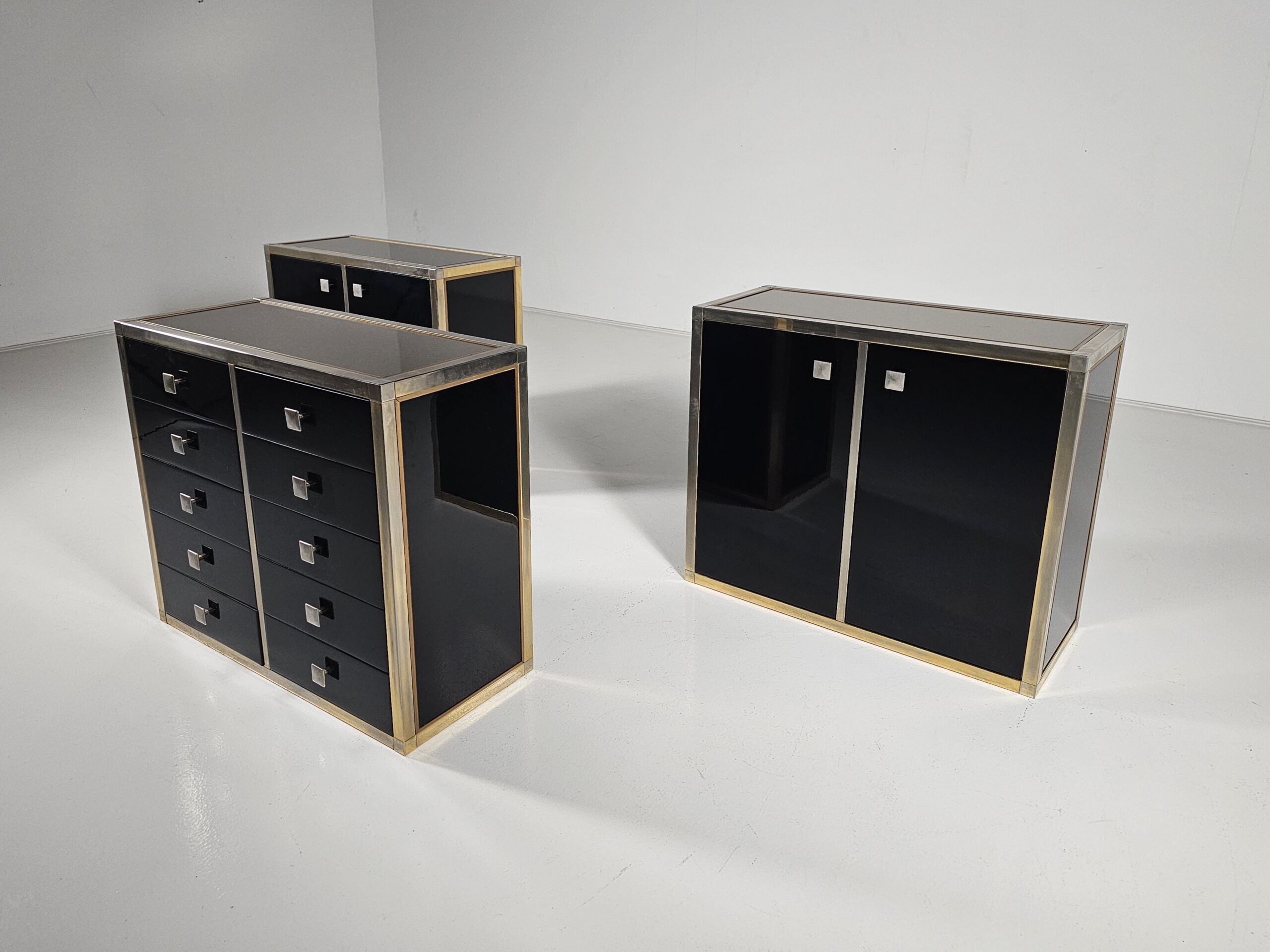 Stunning sideboard designed by Renato Zevi in the 1970s. It can also be separated to make smaller cabinets and a chest of drawers. Each element has a brass framing, black laminated panels, fronts, and opal glass tops. The handles and hinges are made of brass/chrome.