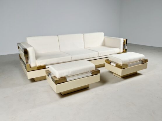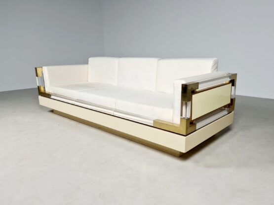 A combination of lacquered wood, Lucite and brass. The construction is very solid. We can also reupholster the sofa if you wish.