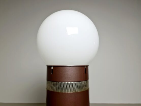 The lamp presents a base in enameled metal and a spherical lampshade in blown opal glass.