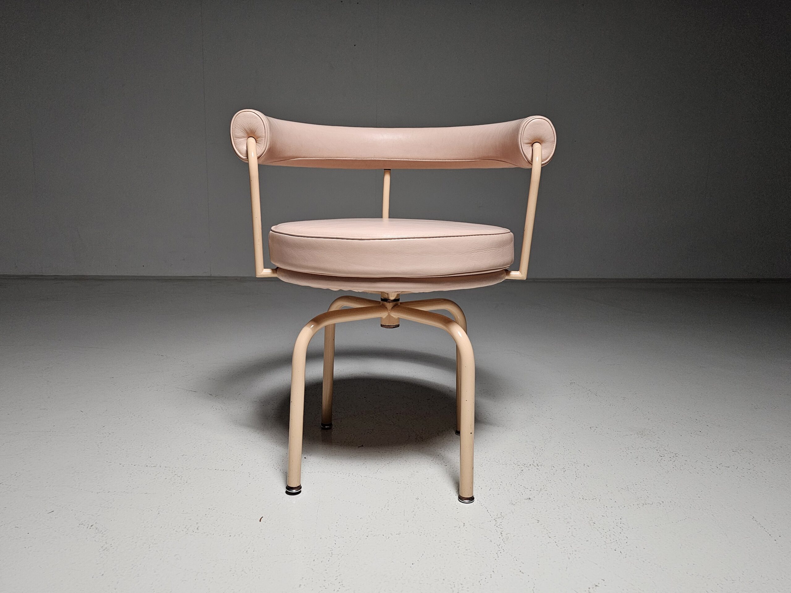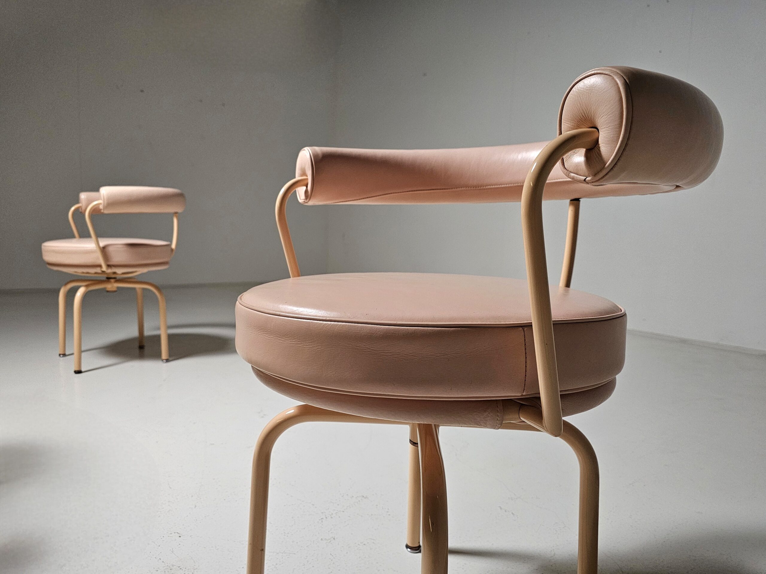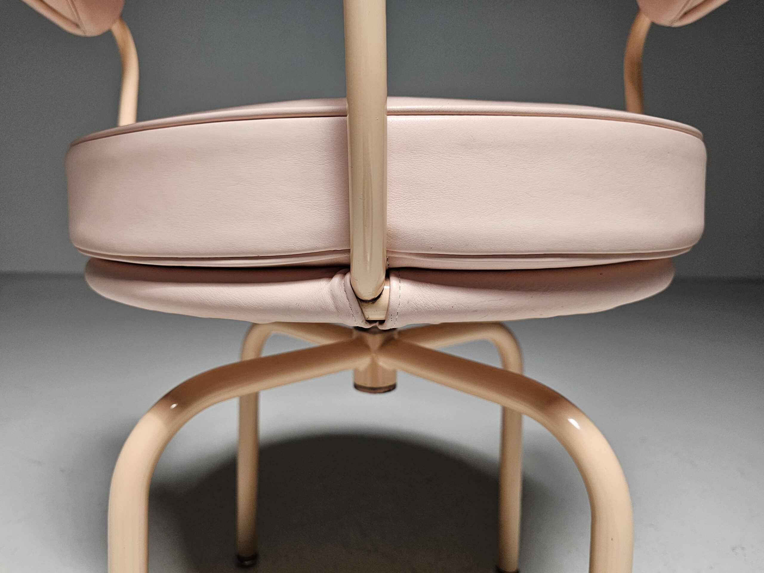 Perriand designed this chair for her own apartment in Paris during the 1920s. It was at a later point presented to a wider audience, together with pieces from Le Corbusier and Pierre Jeanneret, and was therefore added to the LC family of furniture. Our versions are limited edition and originate from the late 1980s, featuring the original soft pink leather seat and backrest and a peach colored frame. Numbering embossed in frames.