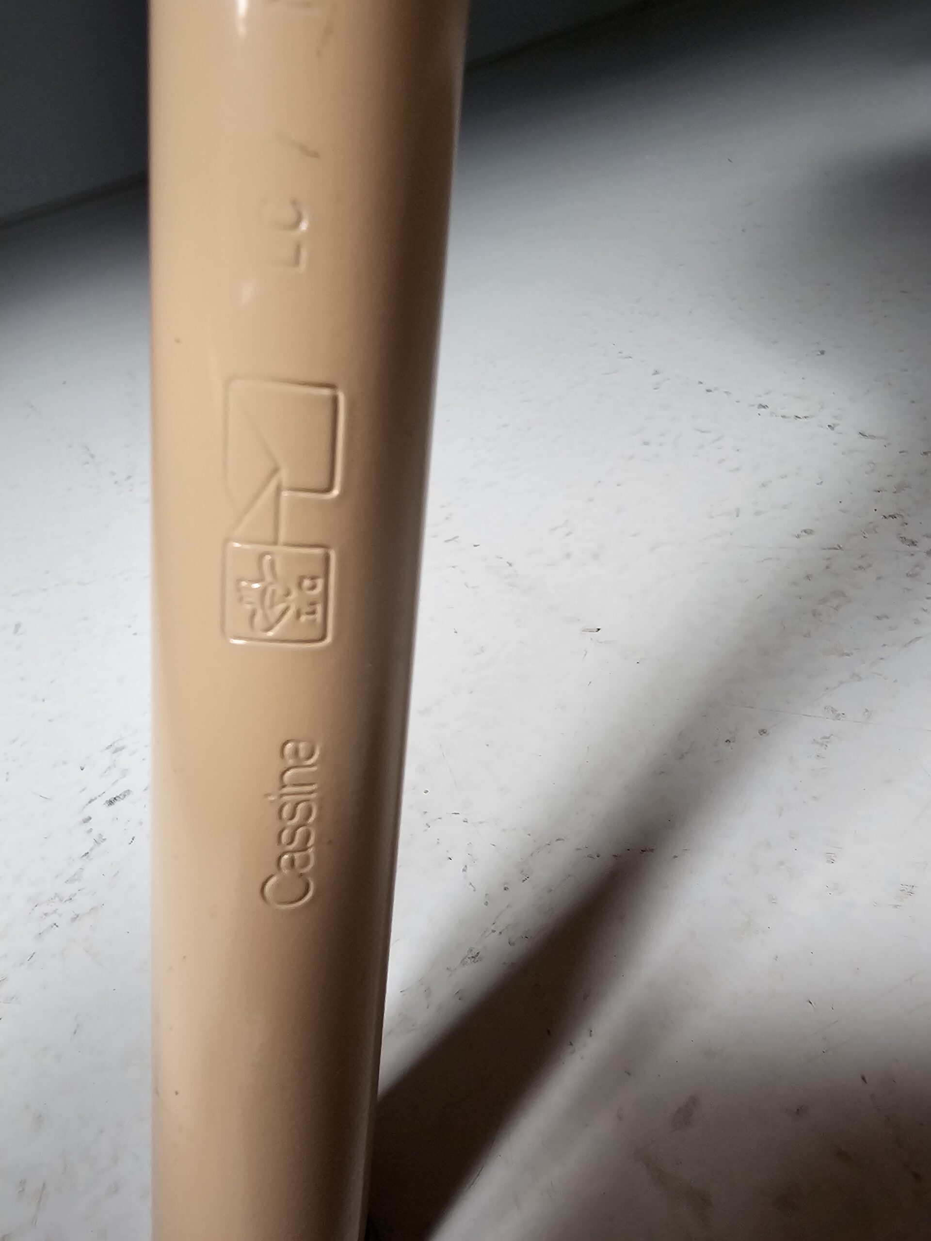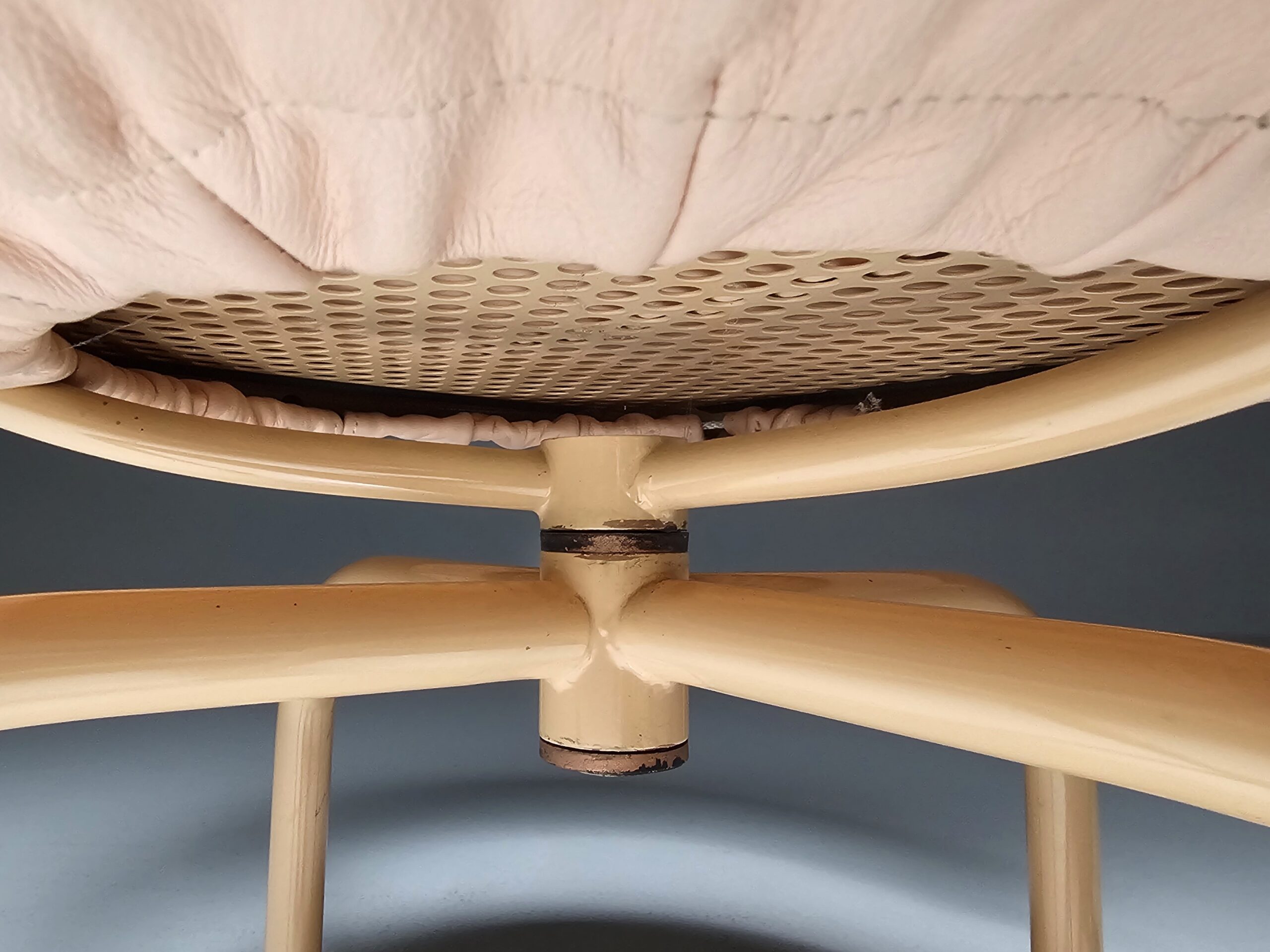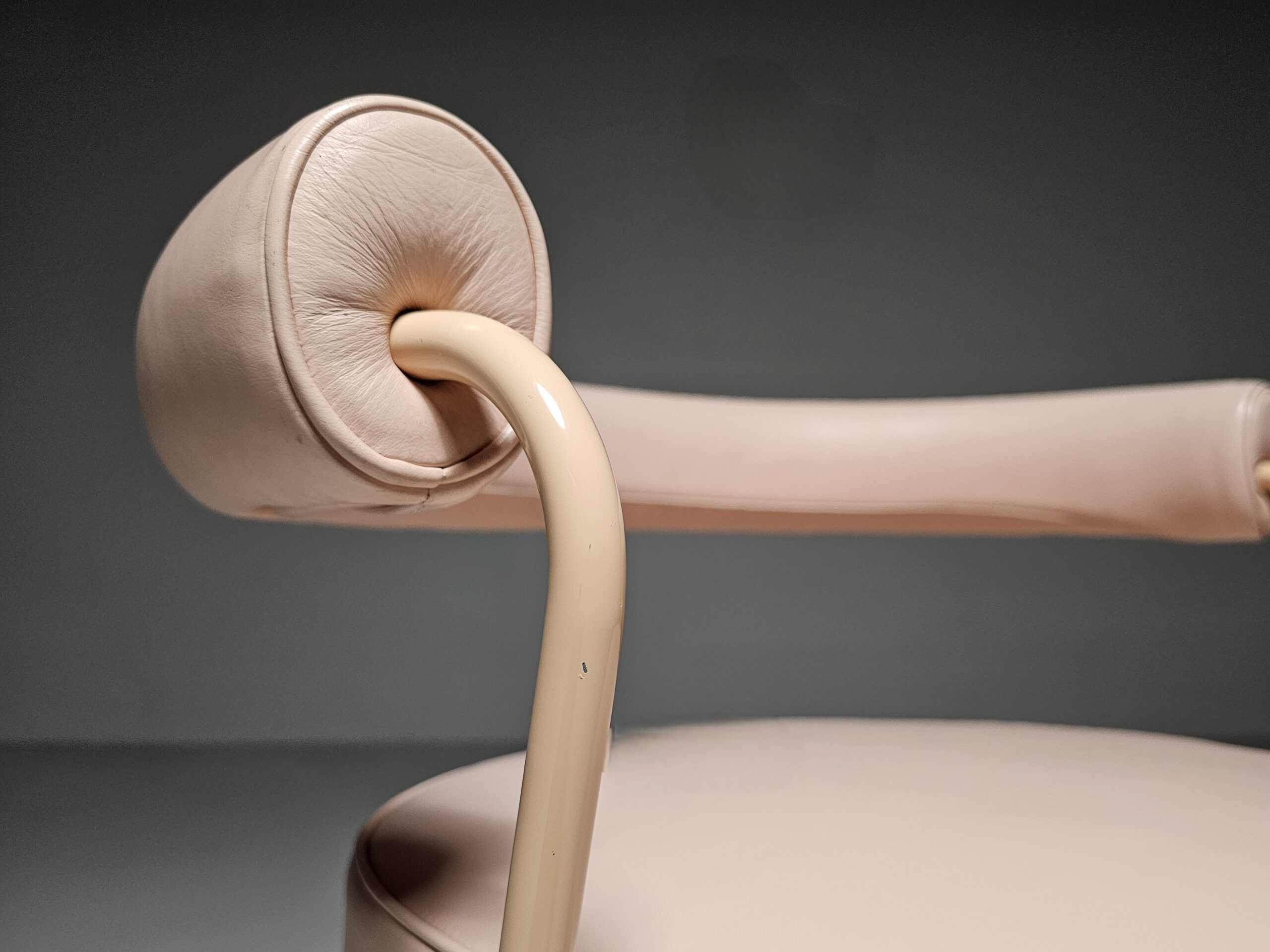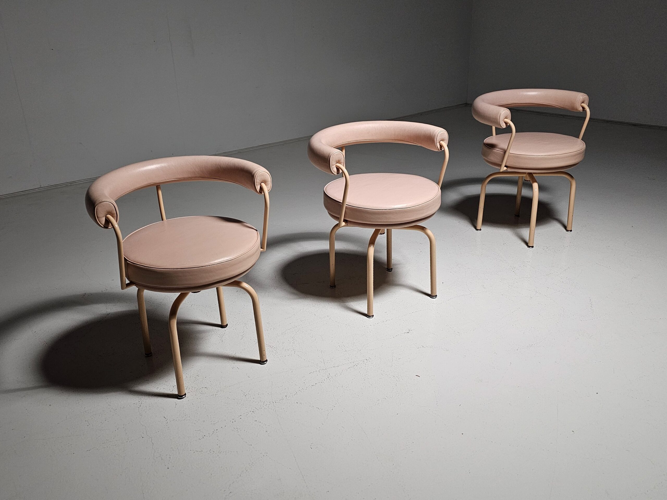 Perriand designed this chair for her own apartment in Paris during the 1920s. It was at a later point presented to a wider audience, together with pieces from Le Corbusier and Pierre Jeanneret, and was therefore added to the LC family of furniture. Our versions are limited edition and originate from the late 1980s, featuring the original soft pink leather seat and backrest and a peach colored frame. Numbering embossed in frames.
