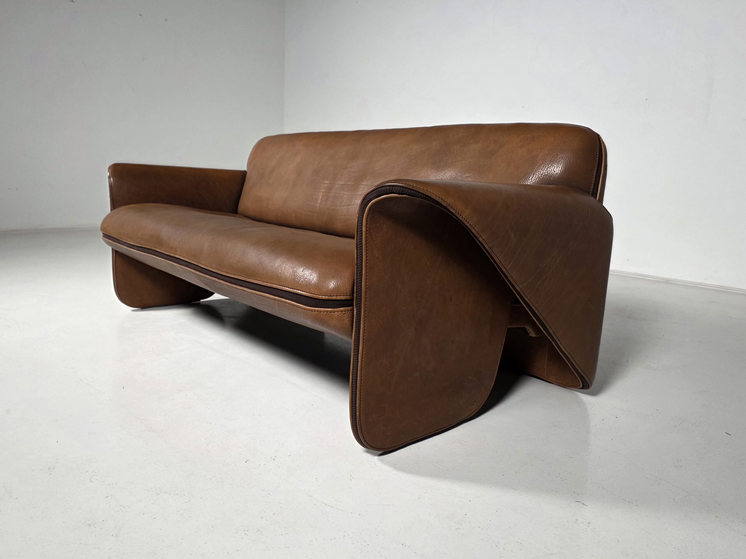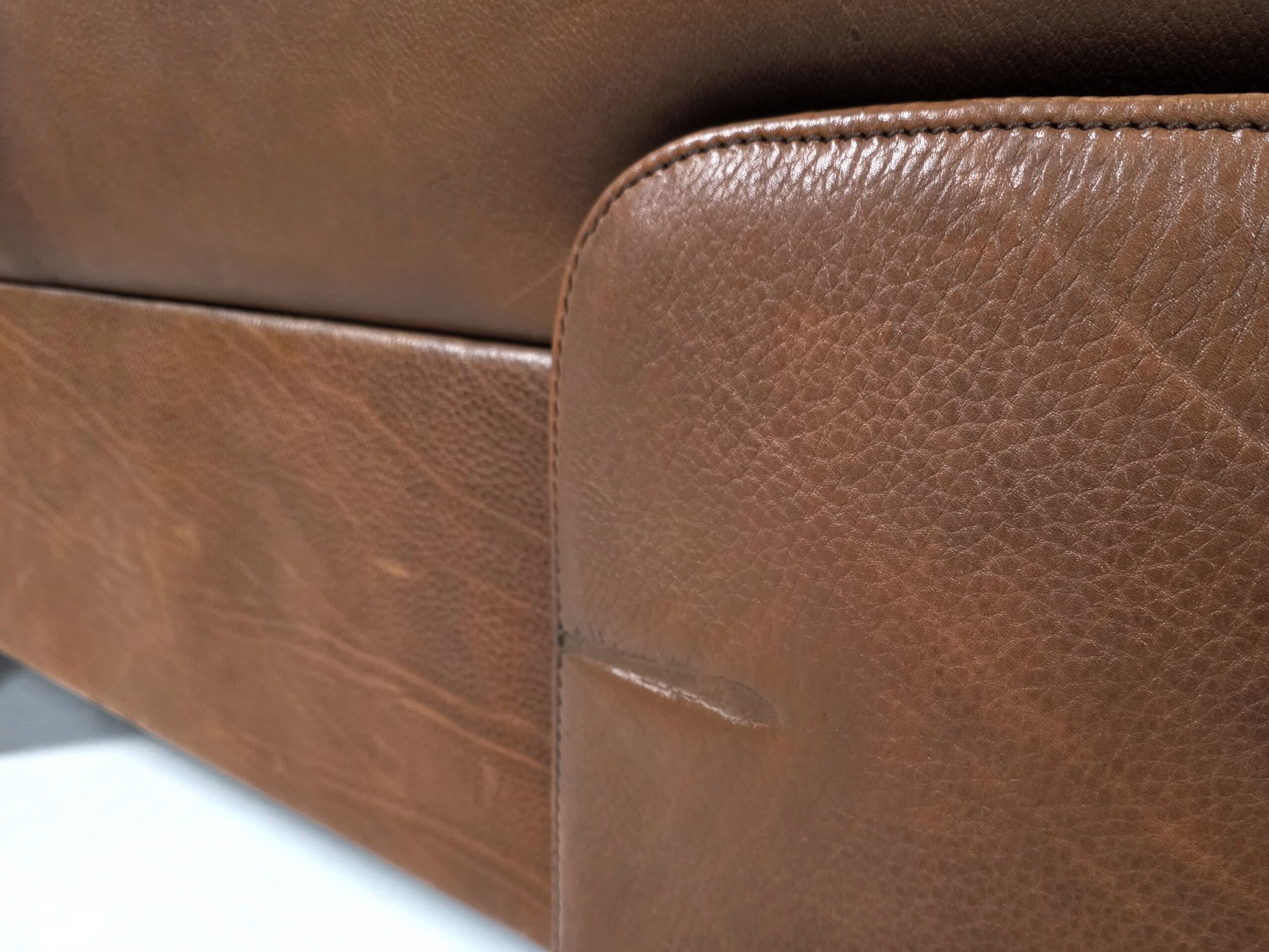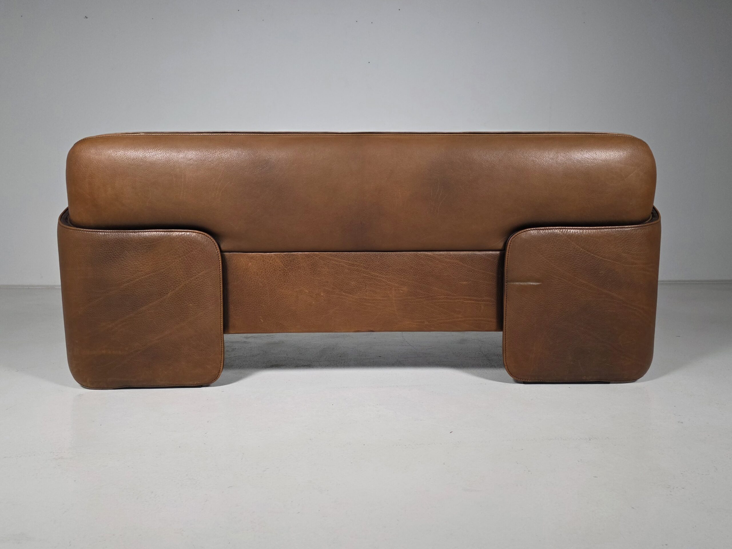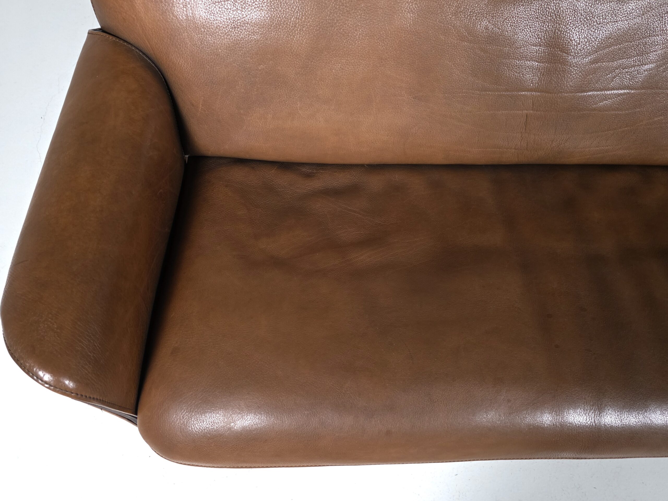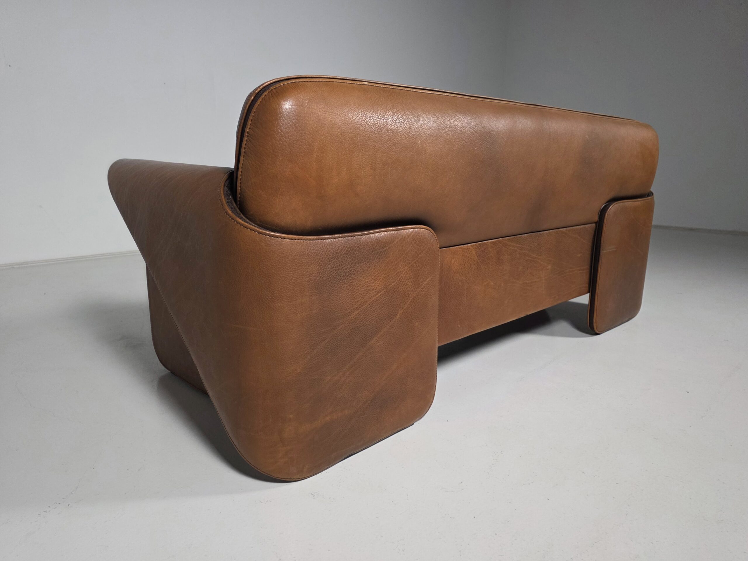 This iconic model exemplifies De Sede’s mastery of leather craftsmanship and architectural form. The sofa features a dramatic folded leather shell construction, with thick, supple aniline leather forming the arms, sides, and base in one continuous gesture. The generously proportioned seat and integrated backrest are framed by the sculptural leather structure, creating a bold yet refined silhouette. Upholstered in its original cognac-brown Swiss aniline leather, the surface shows a beautiful, even patina developed over decades, highlighting the natural character and quality of the hide. The leather remains soft and structurally sound, with no major losses, reflecting careful use and preservation.