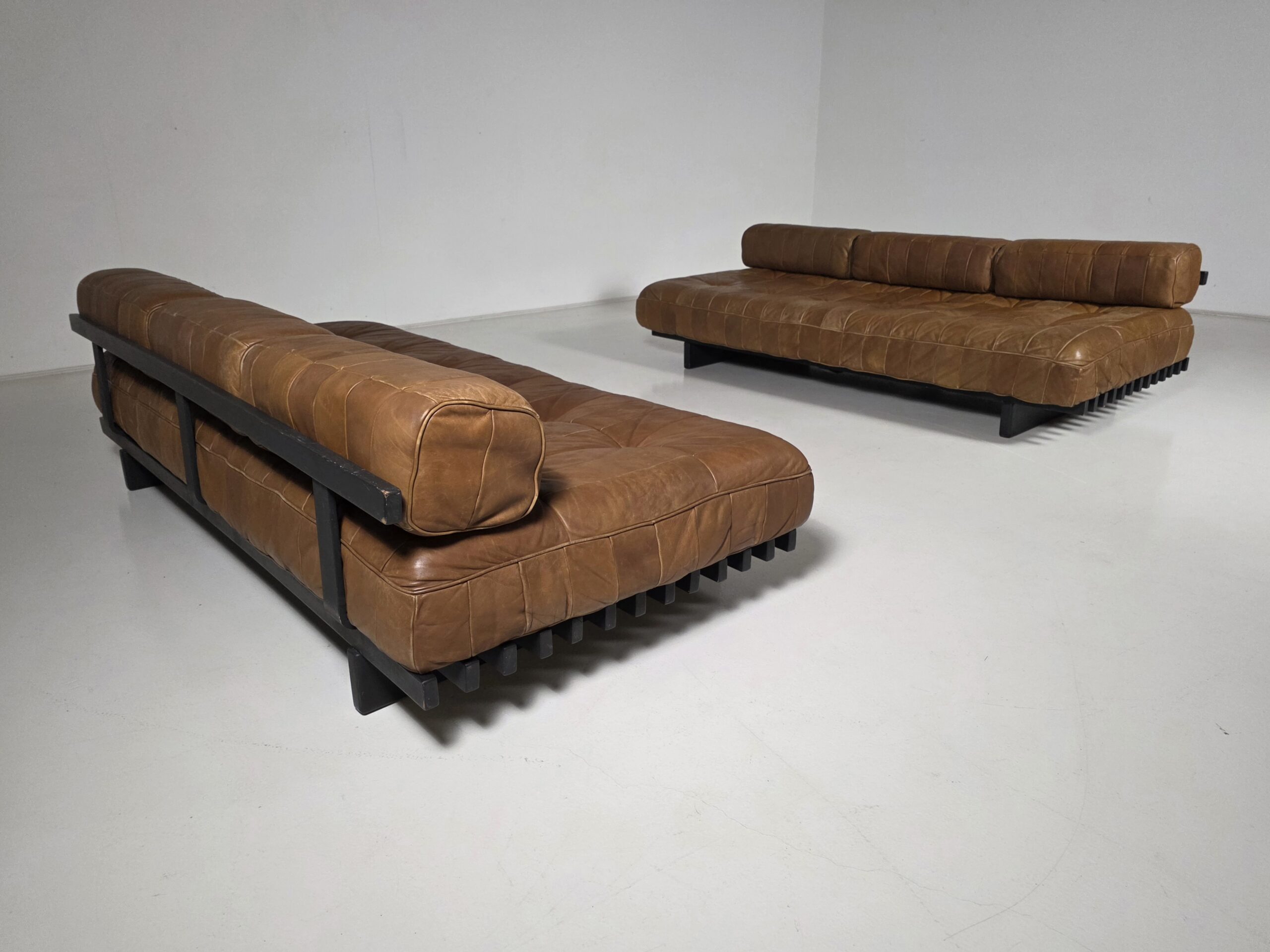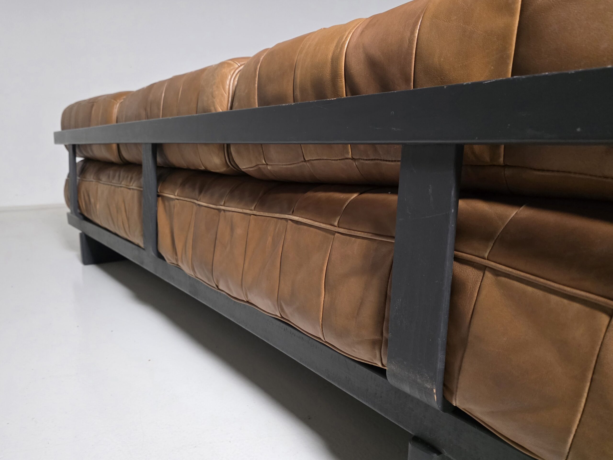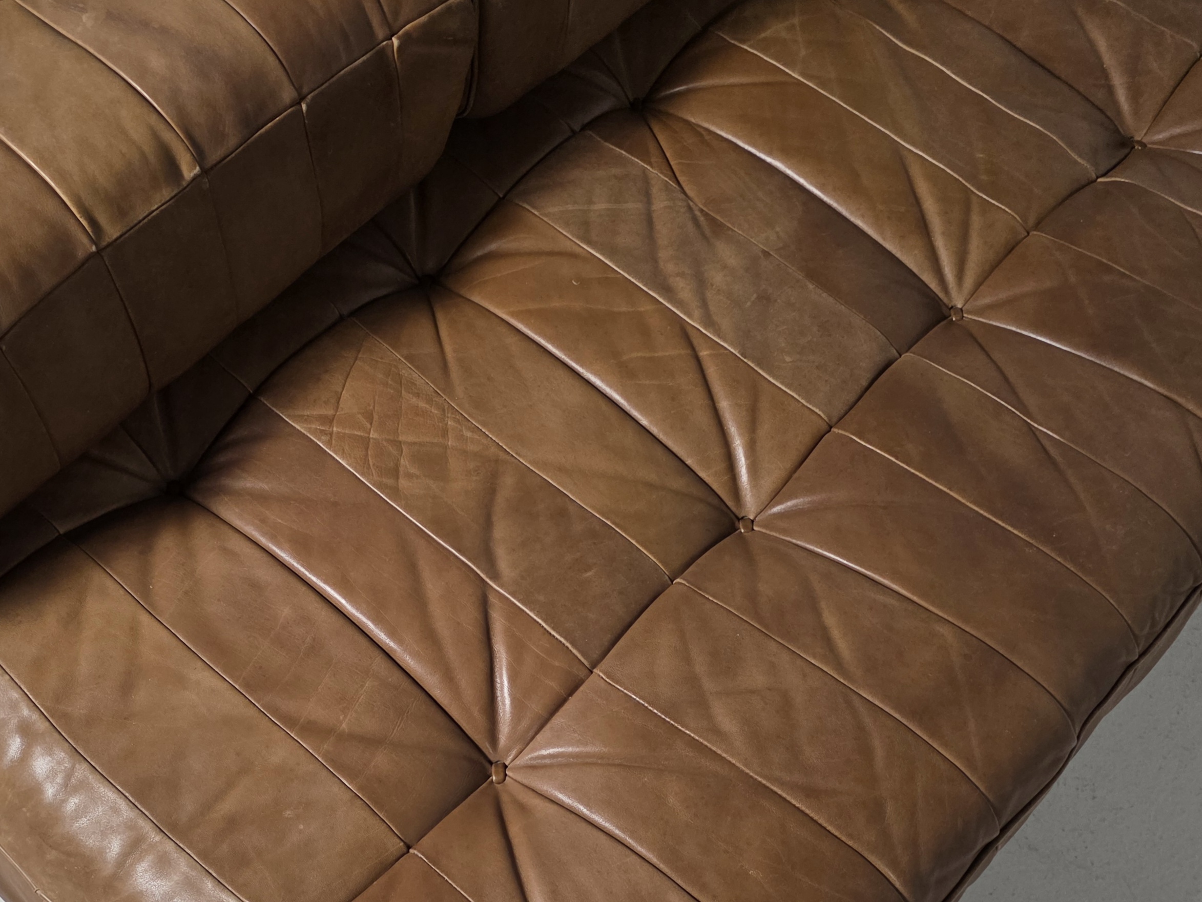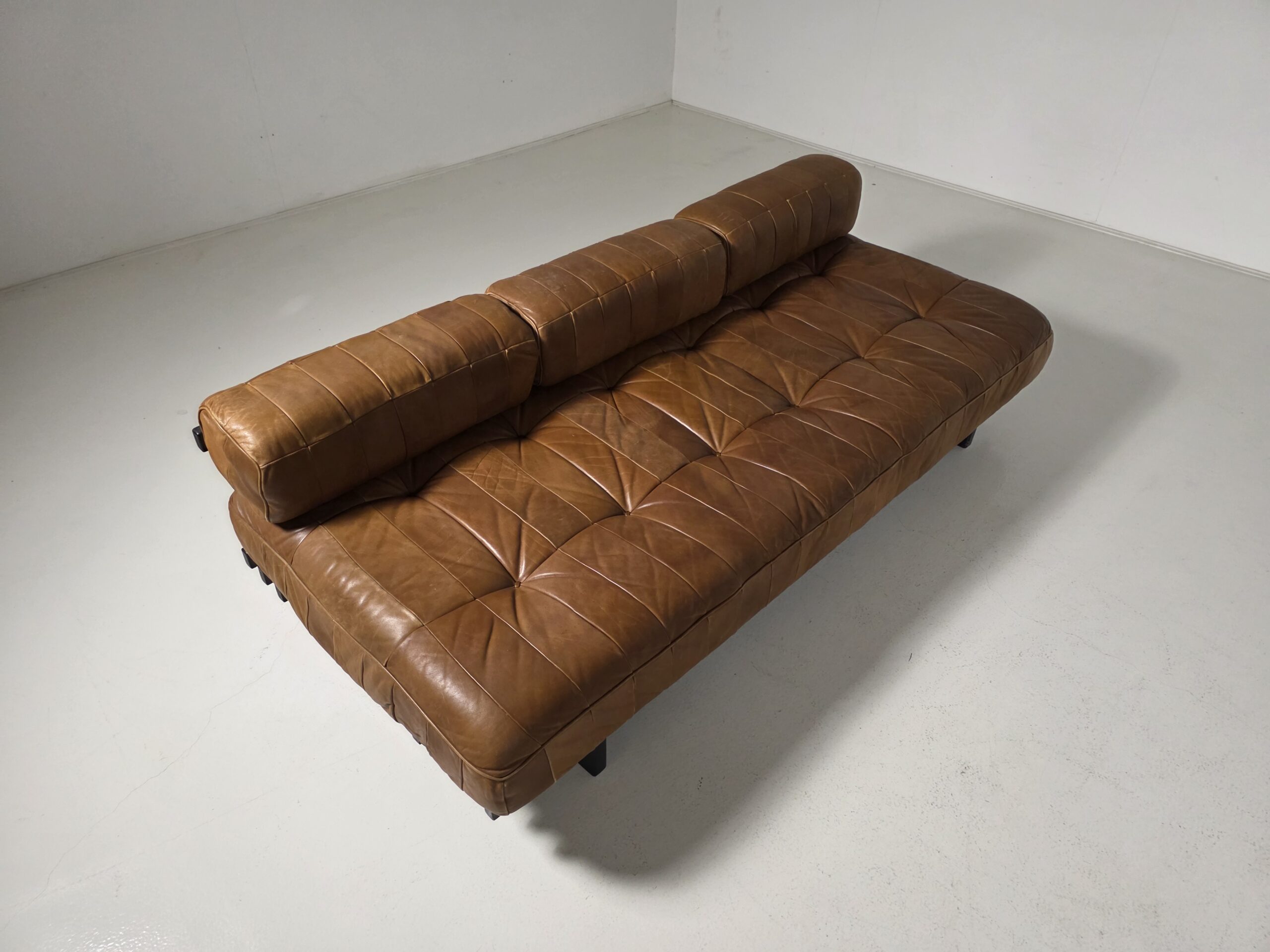 Upholstered in its beautiful and soft original aniline leather with amazing wear. The DS-80 sofa unites all of the characteristics of De Sede‘s furniture. Excellent manufacturing quality, high-quality materials, and Swiss precision. The sofa’s can easily be turned into a daybed by removing the three loose backrest cushions. The patchwork pattern creates a serial and playful surface, which accents the natural characteristics of the leather. The patina that developed in 50 years is amazing!