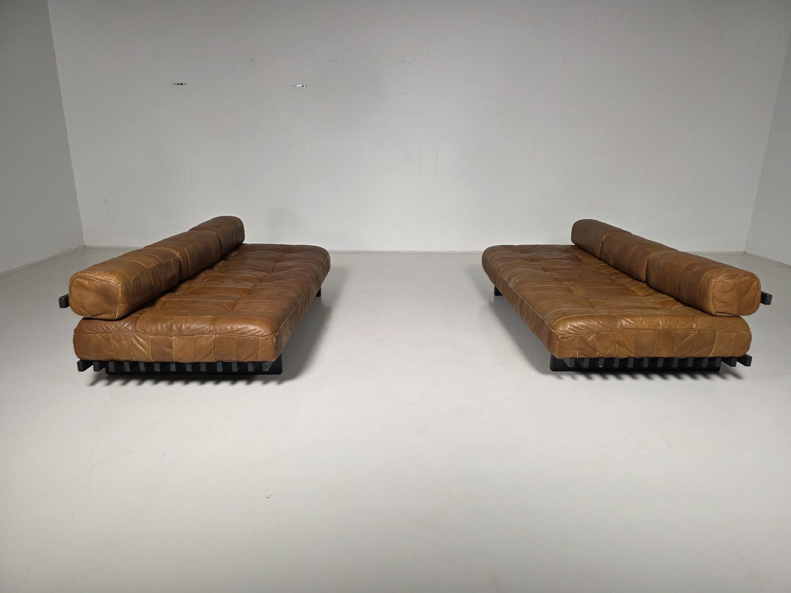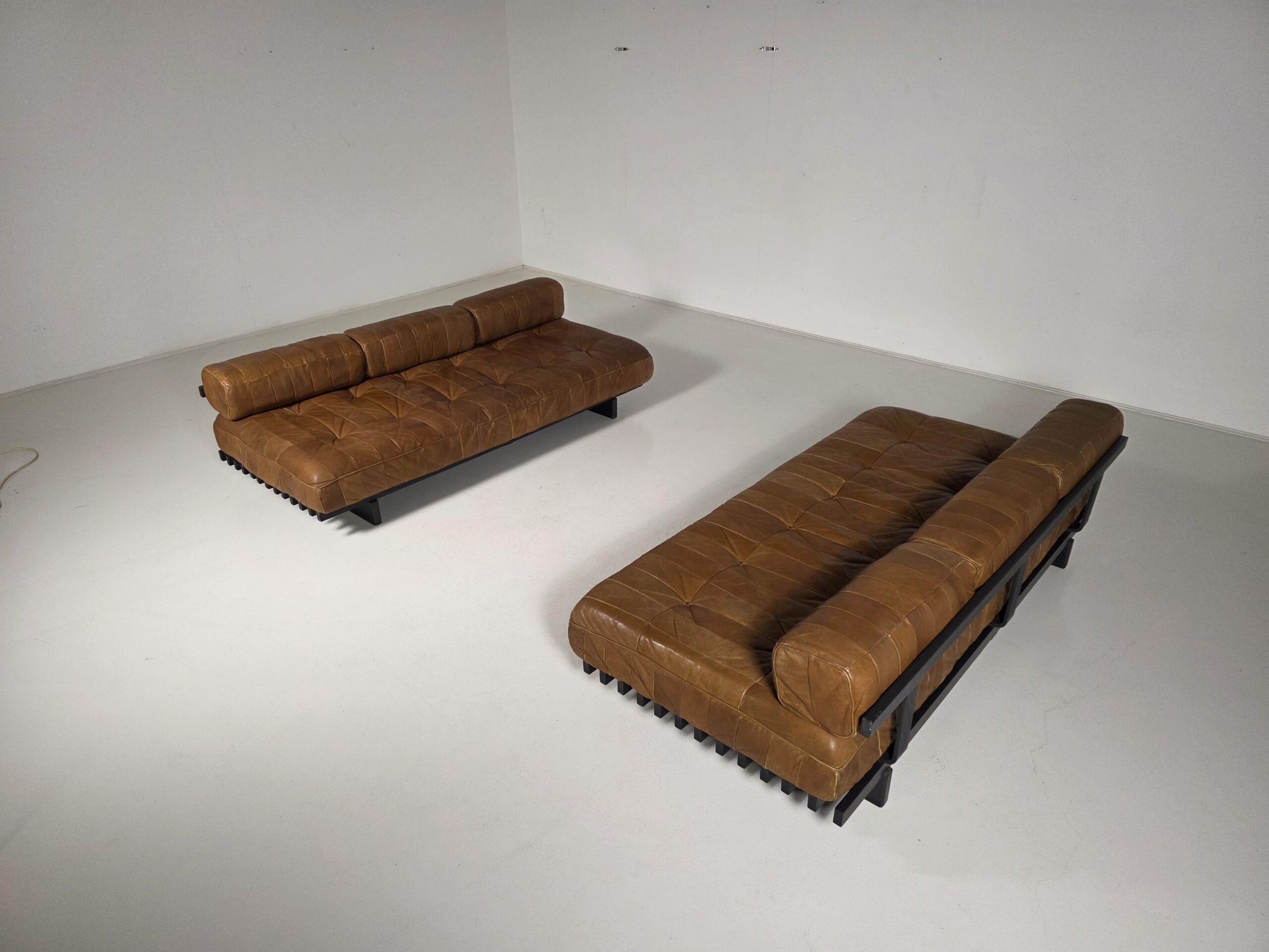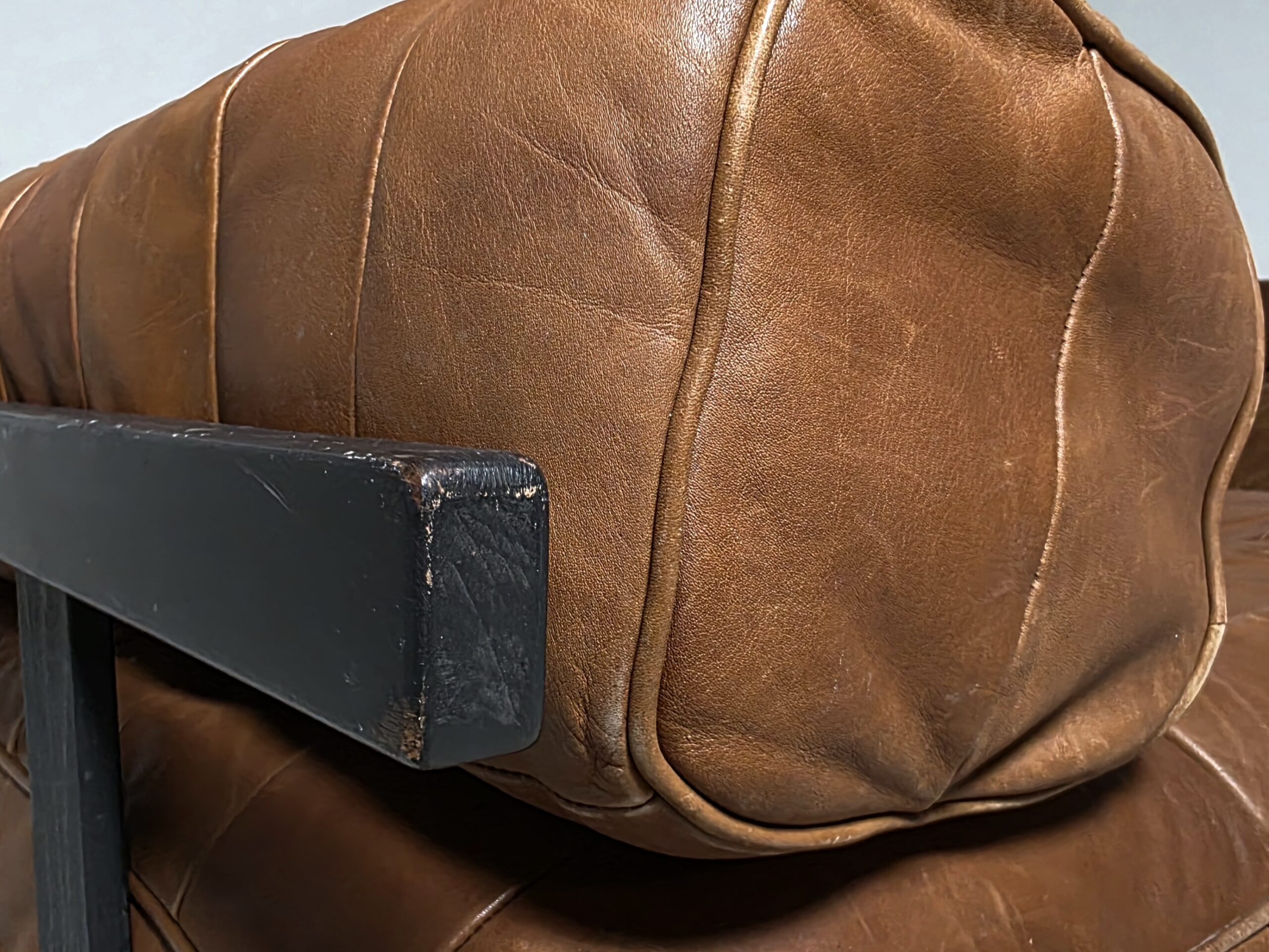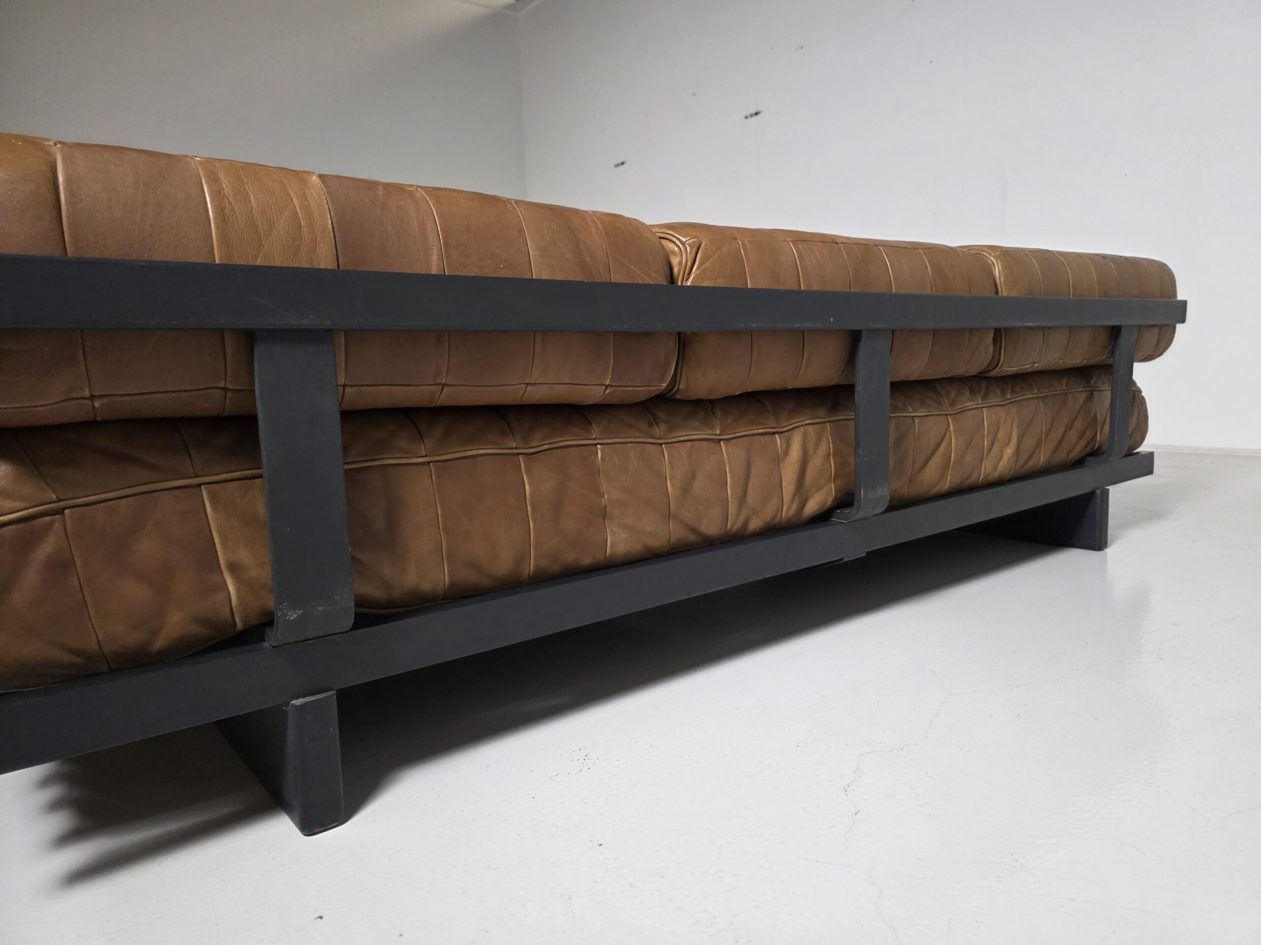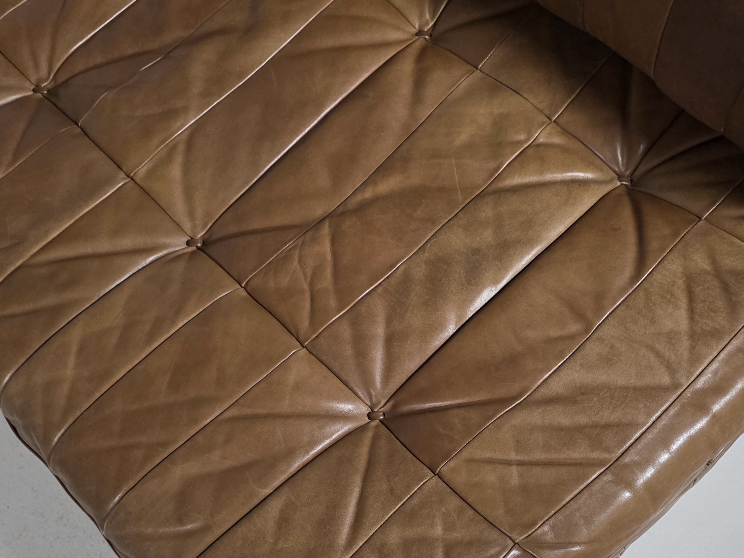 Upholstered in its beautiful and soft original aniline leather with amazing wear. The DS-80 sofa unites all of the characteristics of De Sede‘s furniture. Excellent manufacturing quality, high-quality materials, and Swiss precision. The sofa’s can easily be turned into a daybed by removing the three loose backrest cushions. The patchwork pattern creates a serial and playful surface, which accents the natural characteristics of the leather. The patina that developed in 50 years is amazing!