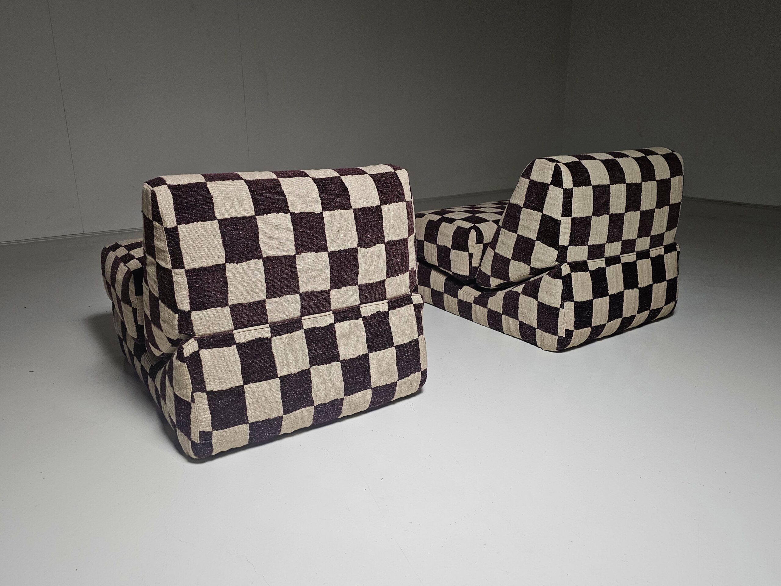 Jonathan de Pas, Donato D’Urbino, and Paolo Lomazzi are a legendary band of Milanese architects and designers who began to collaborate on iconic and unconventional designs in the 1960s. They embraced the pop spirit of their age, incorporating the best in Italian design and rejecting the stark functionality of the international style. This wonderful multifunctional chaise lounge is made up of squishy wedges that can be reordered to make a daybed. It proclaims the design philosophy of its makers in its playful simplicity and the prioritisation of comfort and fun. It has been recently reupholstered in a gorgeous new eggplant colored checkered wool/linen mix fabric by Zinc Textiles. Full size is 190cm