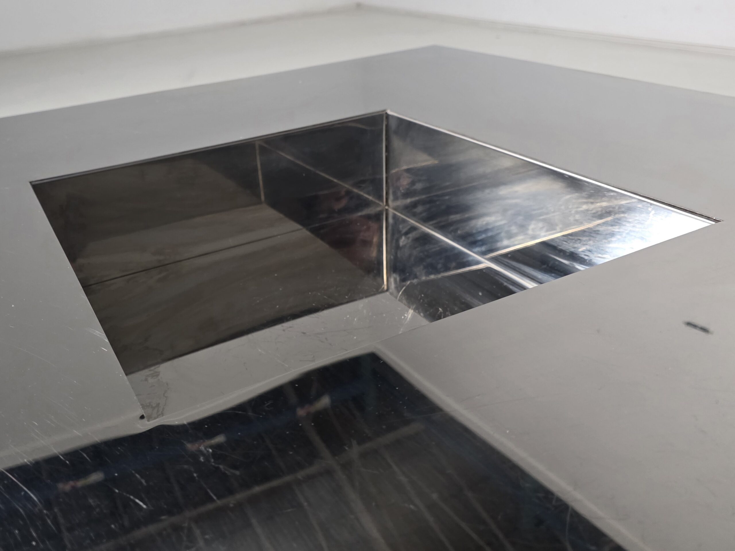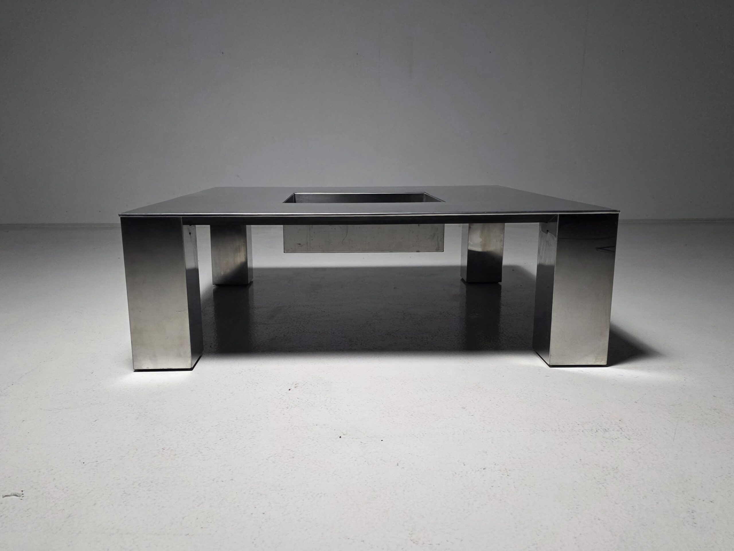 The defining feature of the design is its recessed central compartment a geometric void that transforms the table into more than a functional object. This architectural detail plays with light, depth, and reflection, creating a dynamic visual effect that shifts depending on its surroundings. The clean, square top is supported by four substantial legs, giving the piece a grounded, monolithic presence.