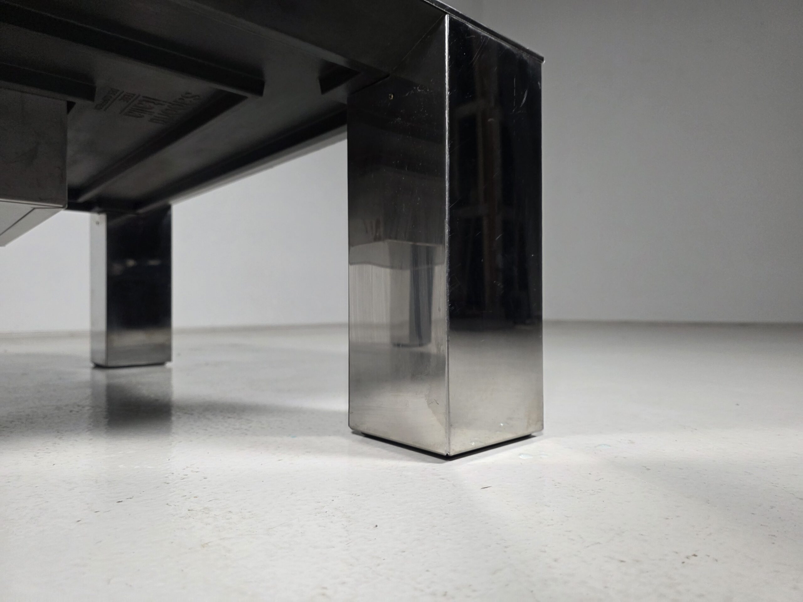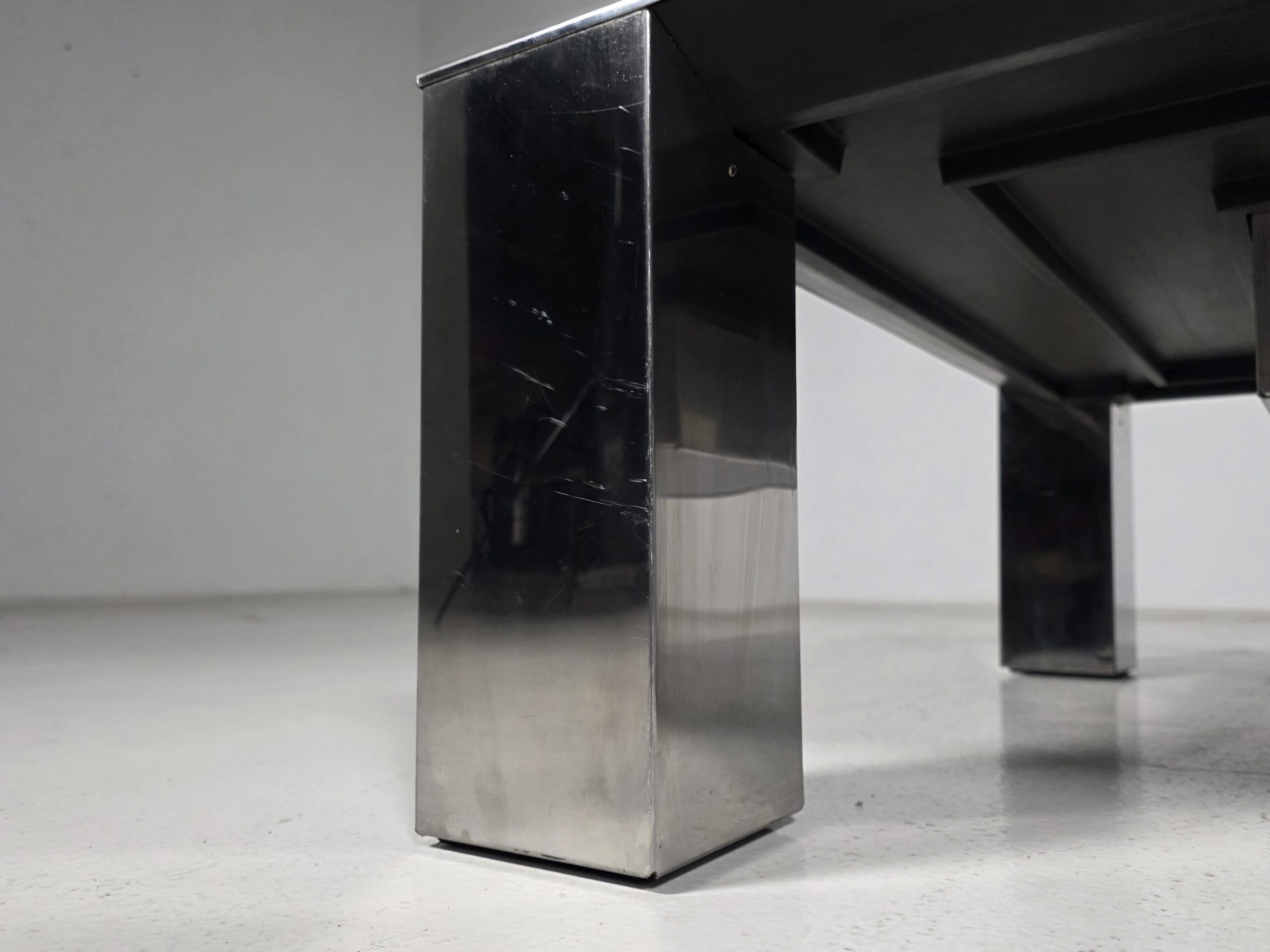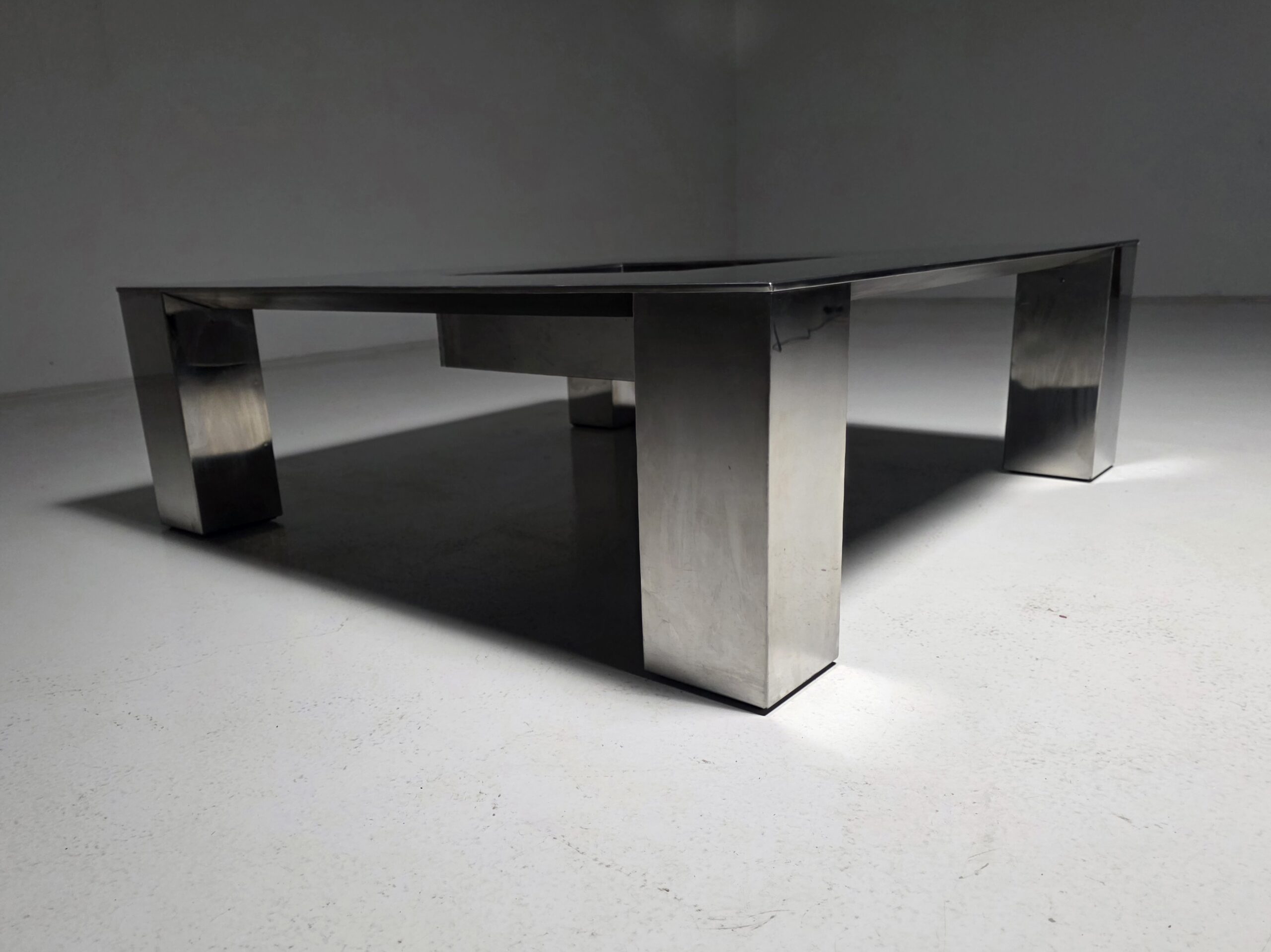 A striking example of Italian modernist design, the Tebe coffee table by Giovanni Offredi for Saporiti Italia embodies the bold architectural language of the 1970s. Crafted entirely in polished stainless steel, the table presents a refined balance between industrial materiality and sculptural form.