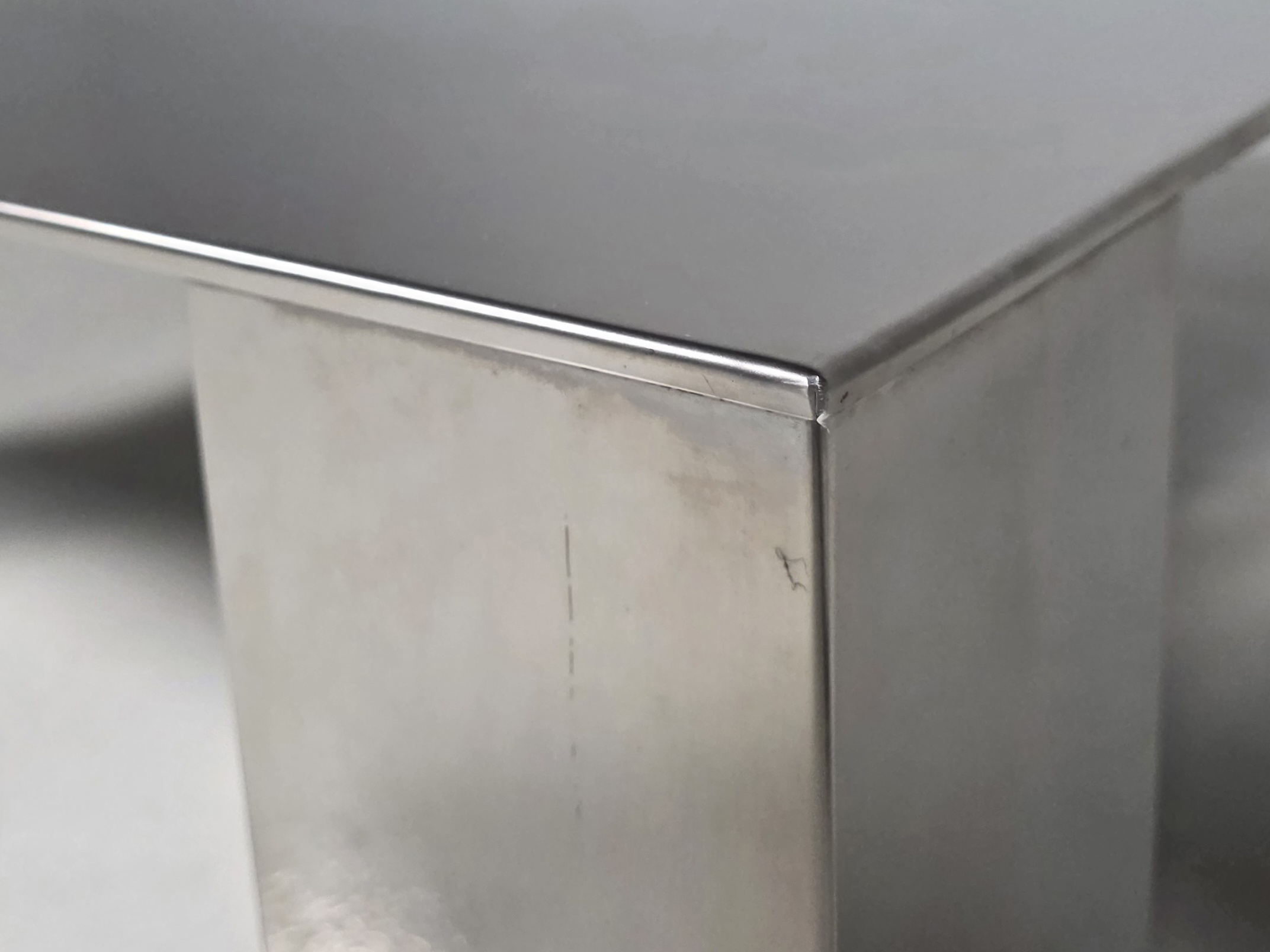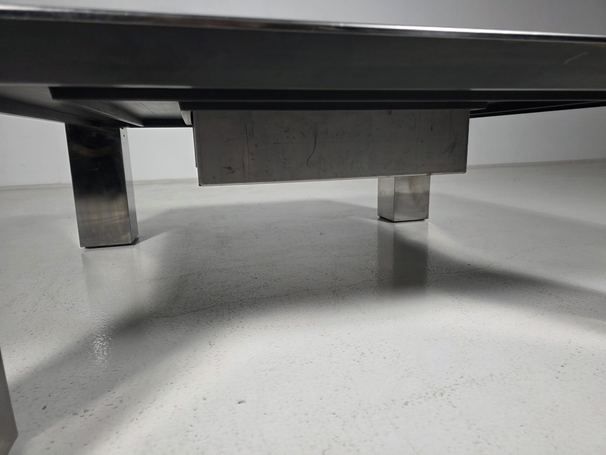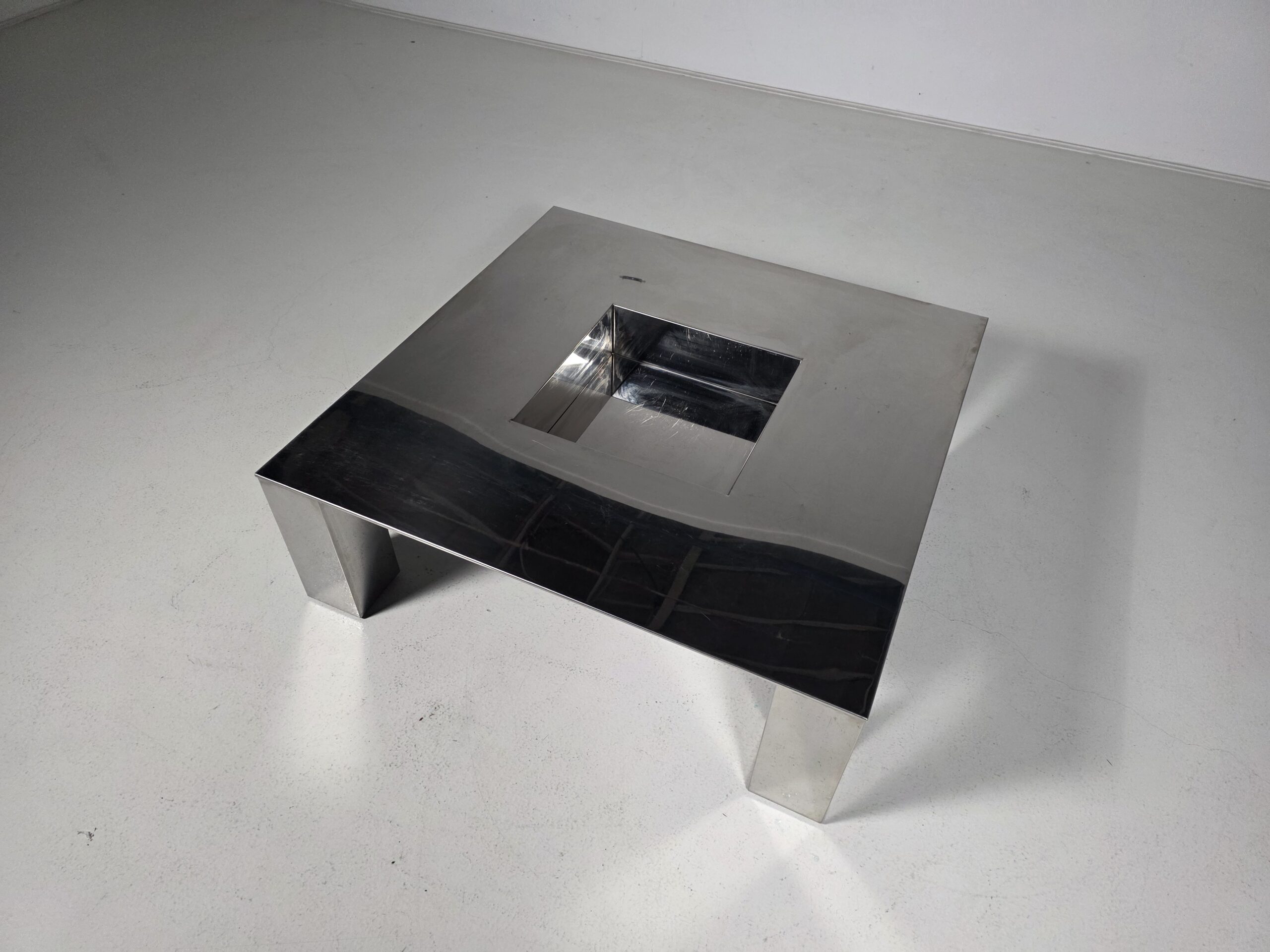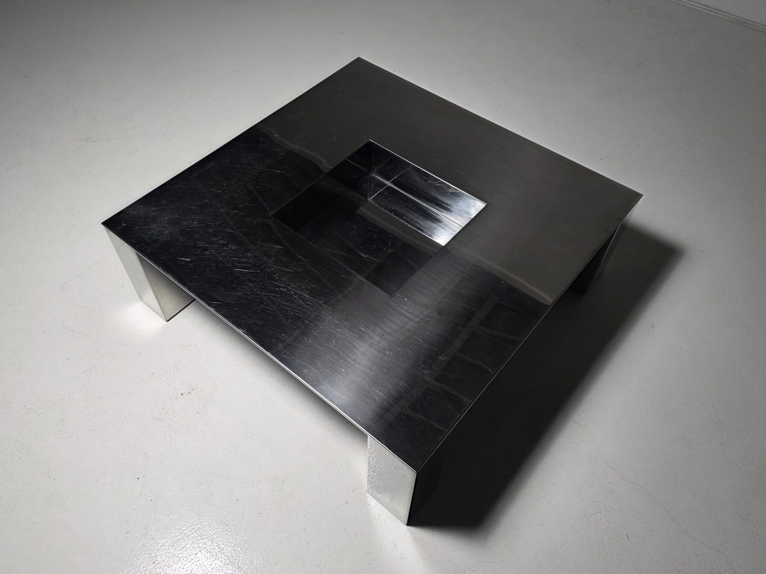 A striking example of Italian modernist design, the Tebe coffee table by Giovanni Offredi for Saporiti Italia embodies the bold architectural language of the 1970s. Crafted entirely in polished stainless steel, the table presents a refined balance between industrial materiality and sculptural form.