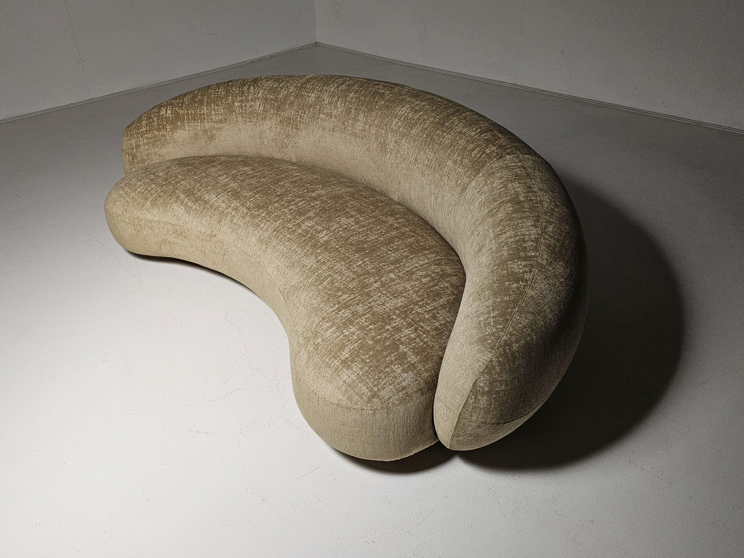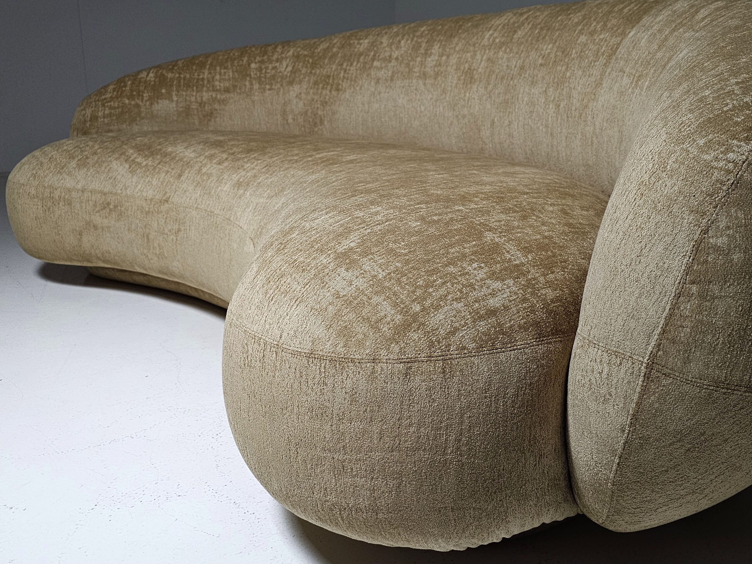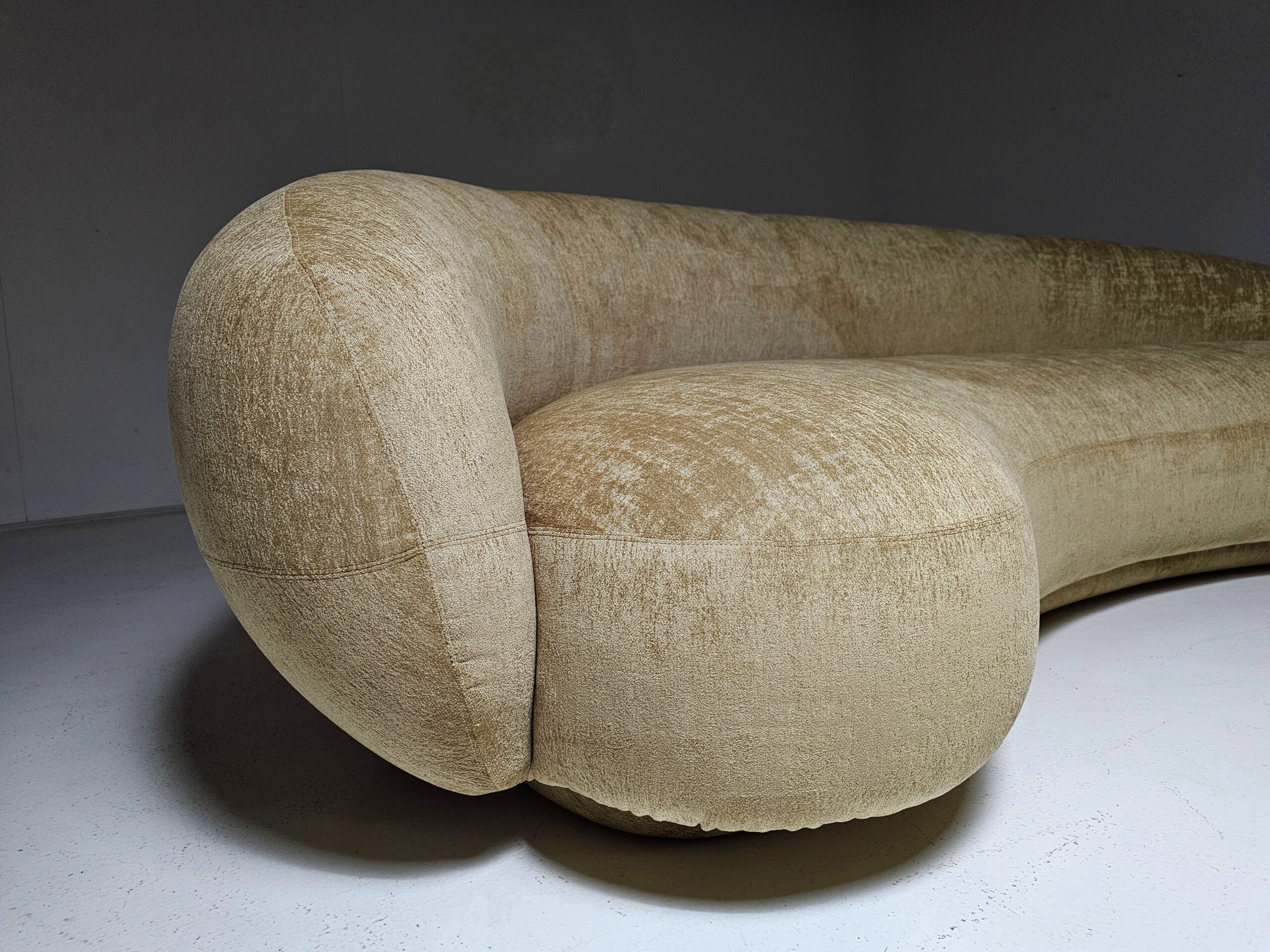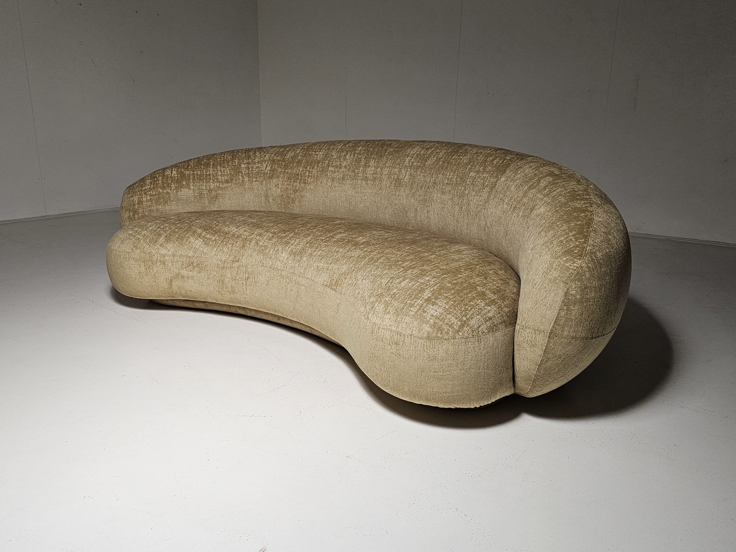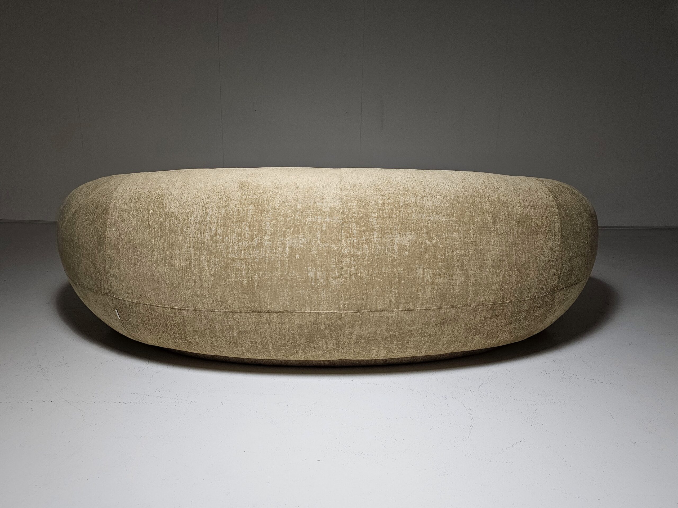 Experience the romance and grace of 1950s avant-garde design with the Julep sofa, crafted in 2018 by renowned Swedish designer Jonas Wagell for Italian luxury brand Tacchini. Embracing soft curves, generous proportions, and a delicately recessed base, it floats above the floor with an effortless lightness. Offering both beauty and value for connoisseurs and admirers of high design. Handmade in Italy, featuring a poplar and birch plywood frame, plush polyurethane foam cushioning, and upholstered in luxurious fabric, it invites relaxation while making a bold statement in any home, office, or showroom.