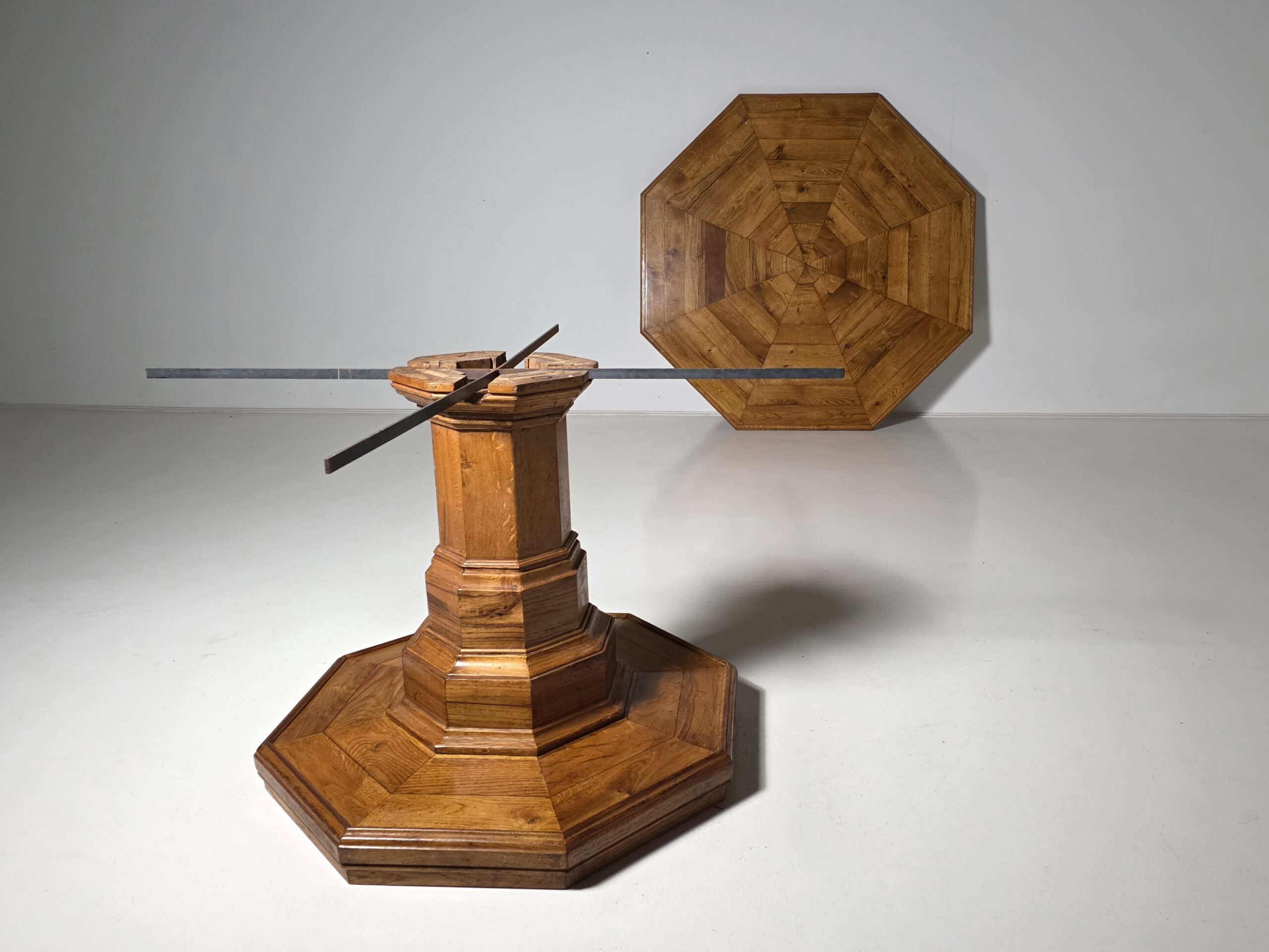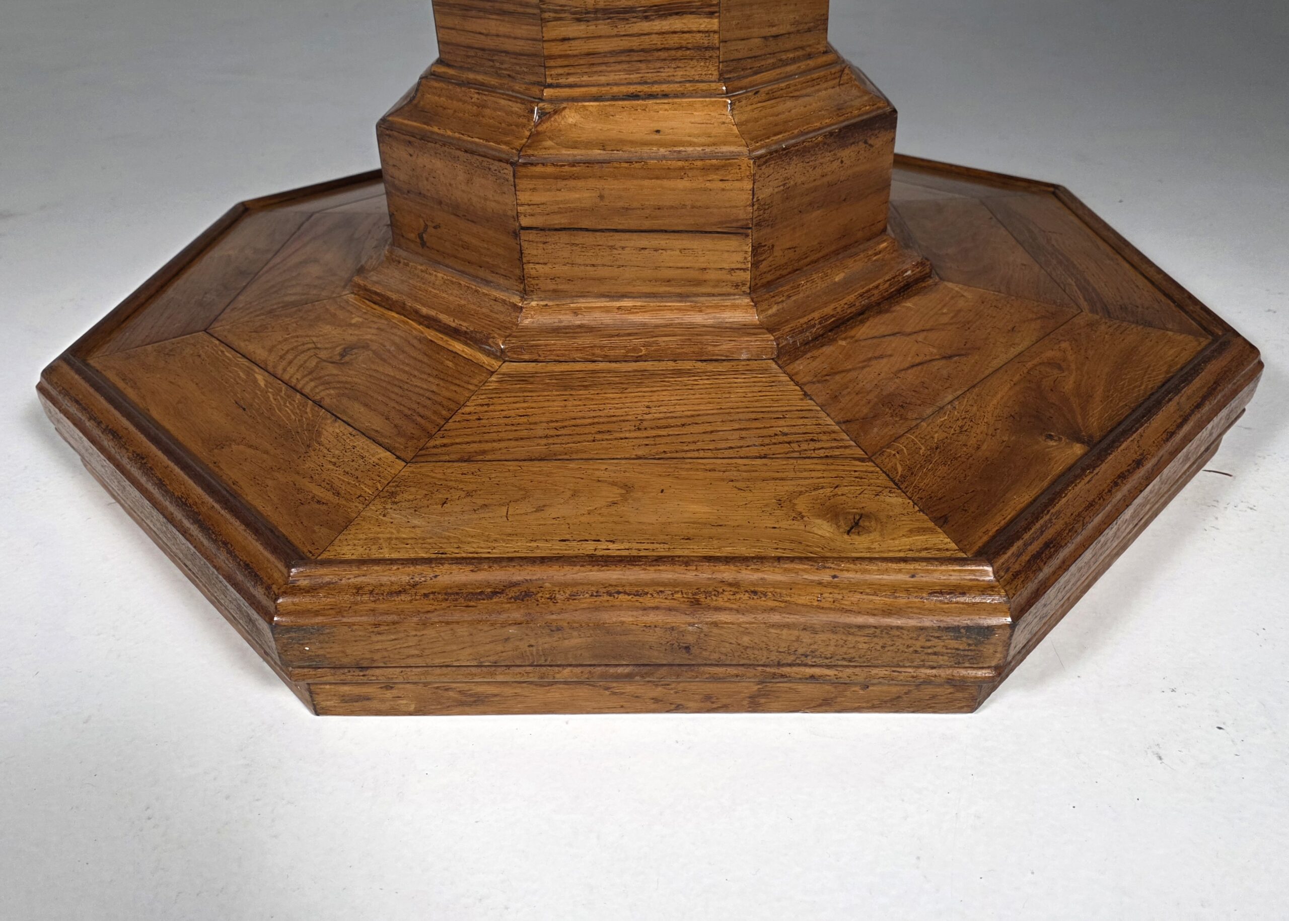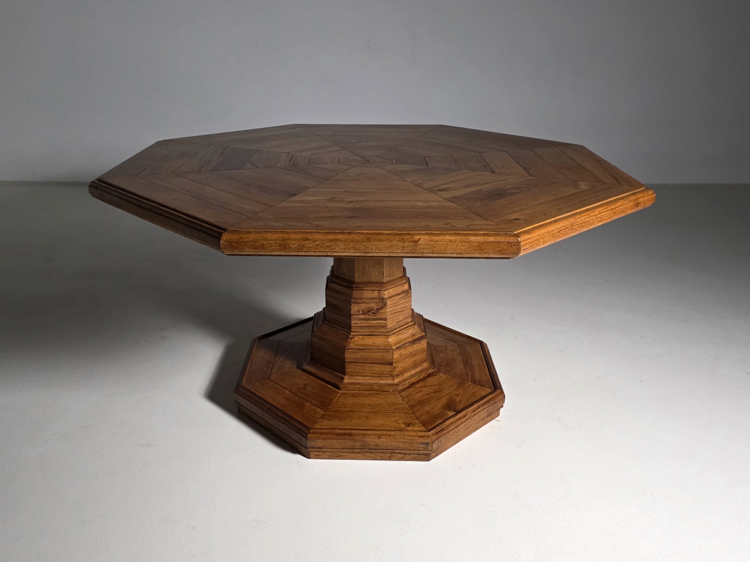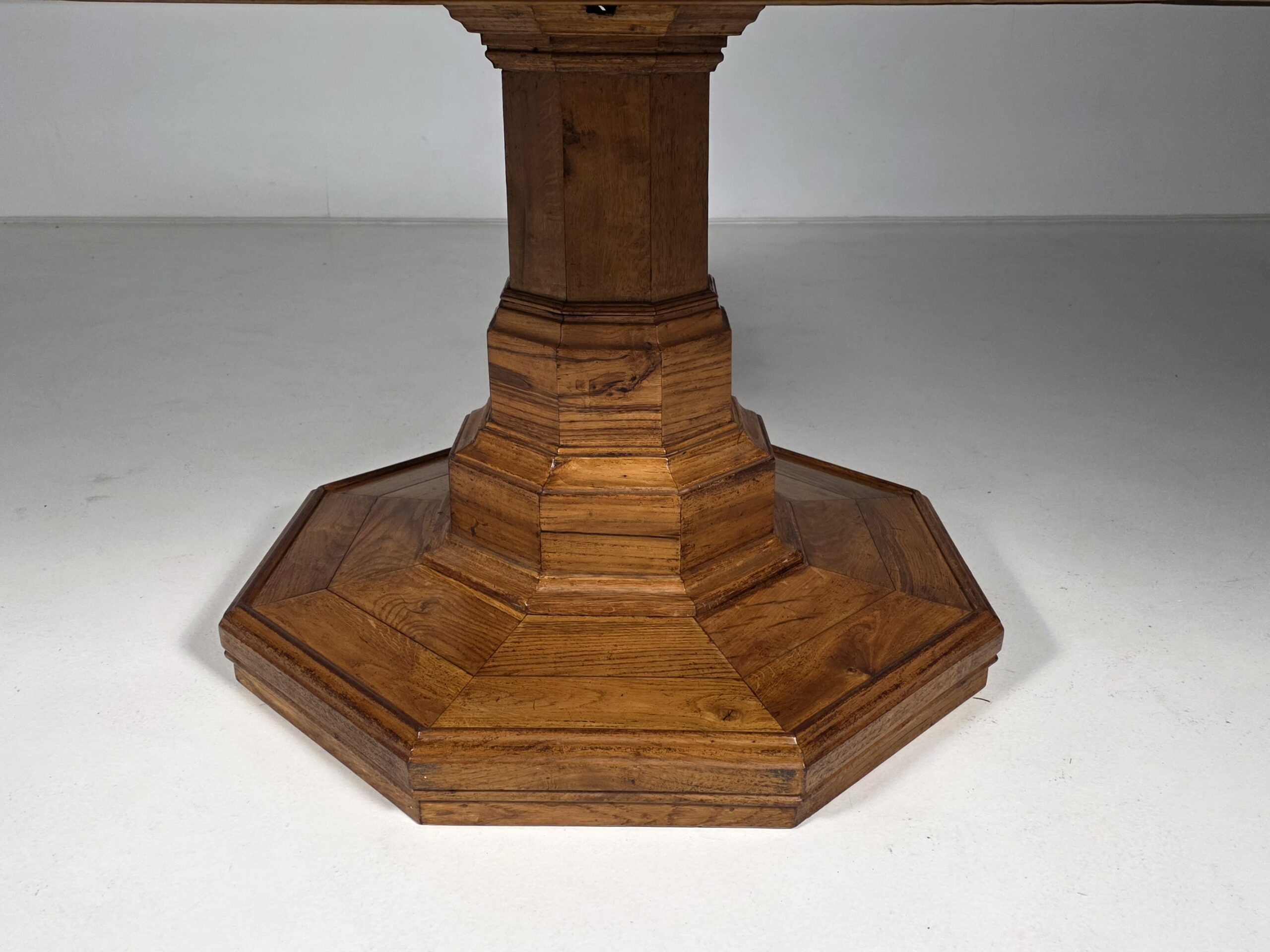 The elongated octagonal form rests on a robust central pedestal with stepped moldings, terminating in a matching octagonal base. The table displays a rich, warm patina and attractive grain throughout. Subtle surface wear and marks are consistent with age and enhance the authenticity of the piece. Distinguished by its impressive scale, this table was originally intended for use in a salon or reception room and remains a striking statement piece today.