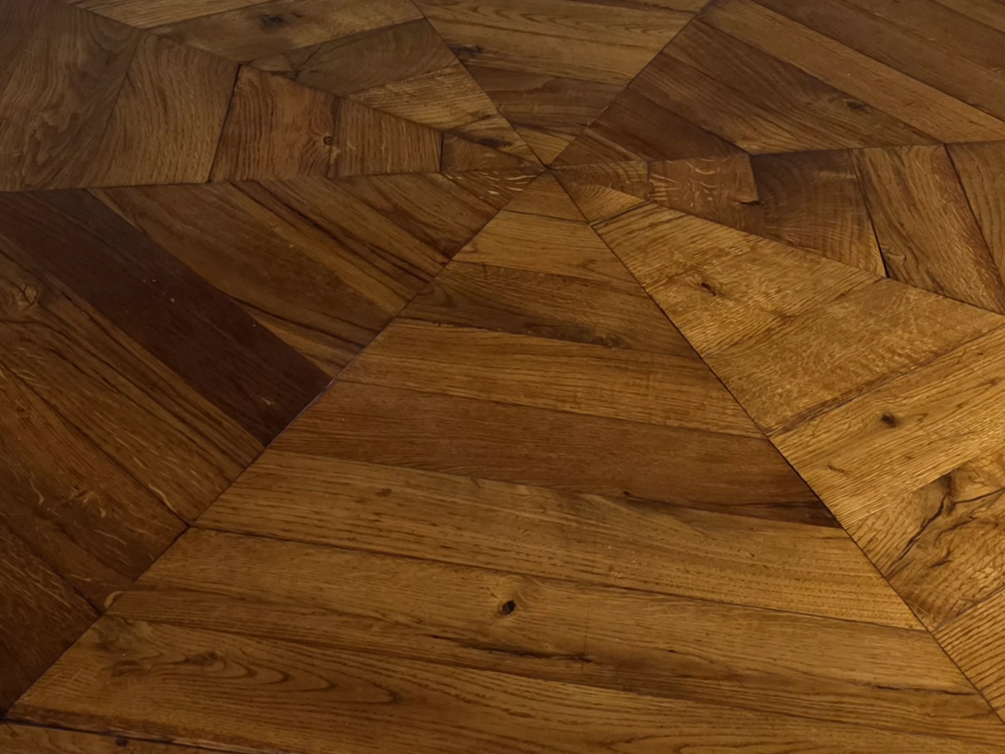 Exceptional late-19th-century French center table crafted in oak with a finely executed geometric top.