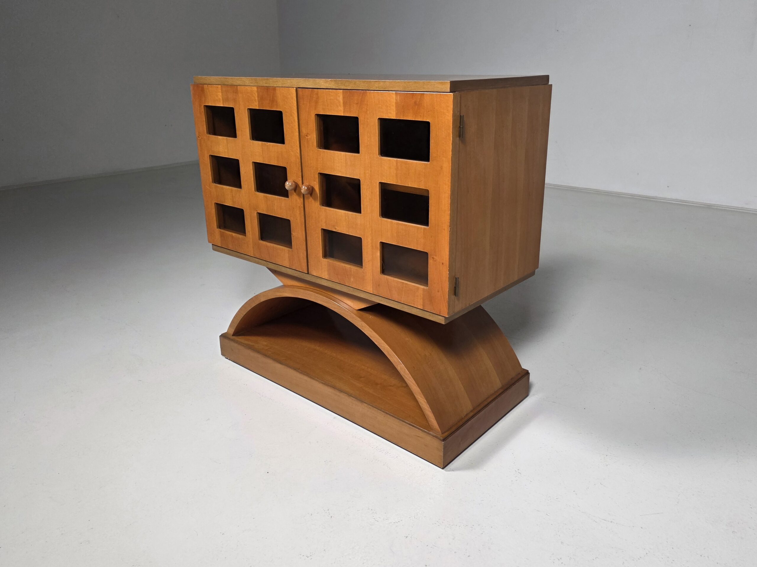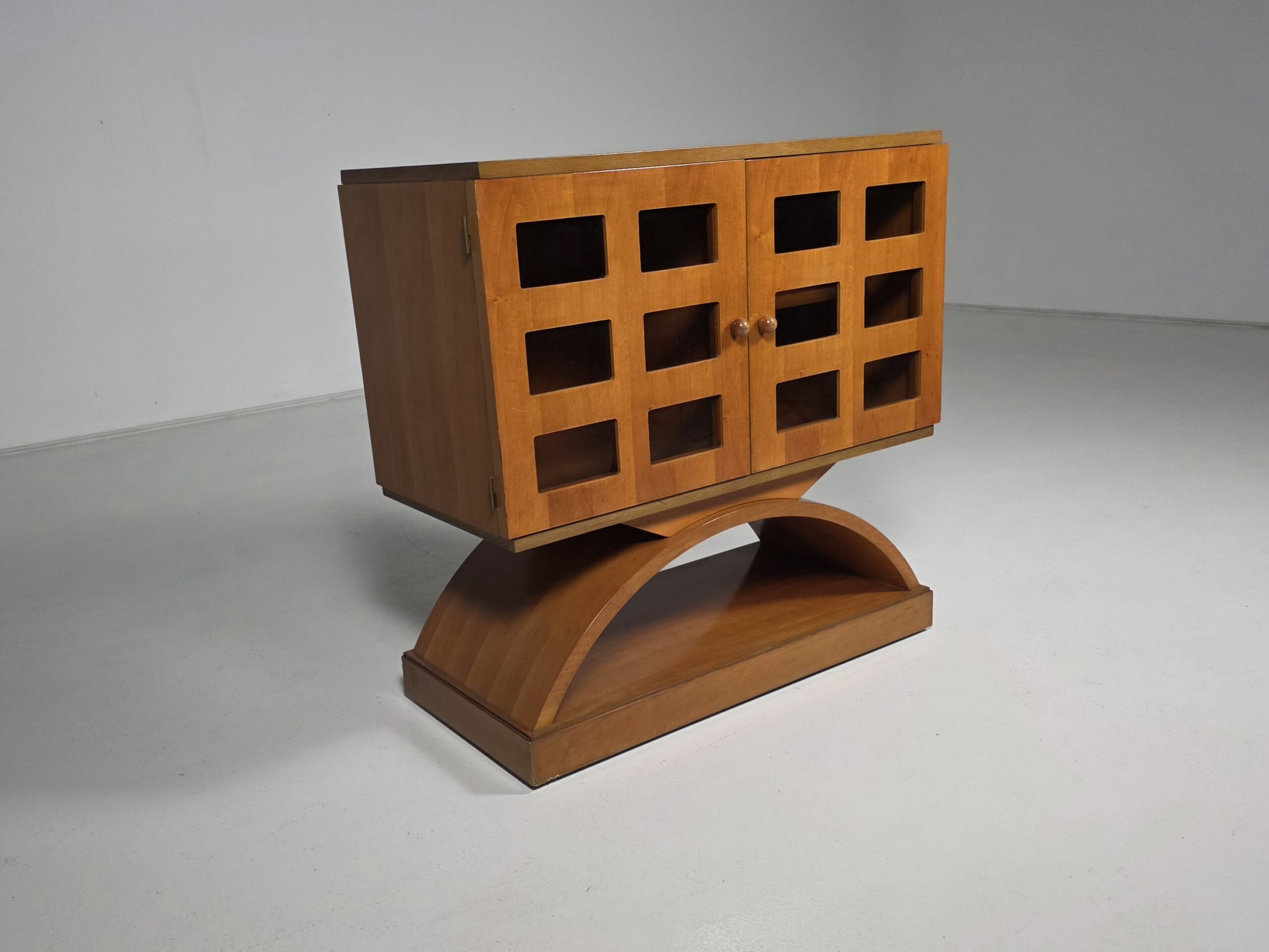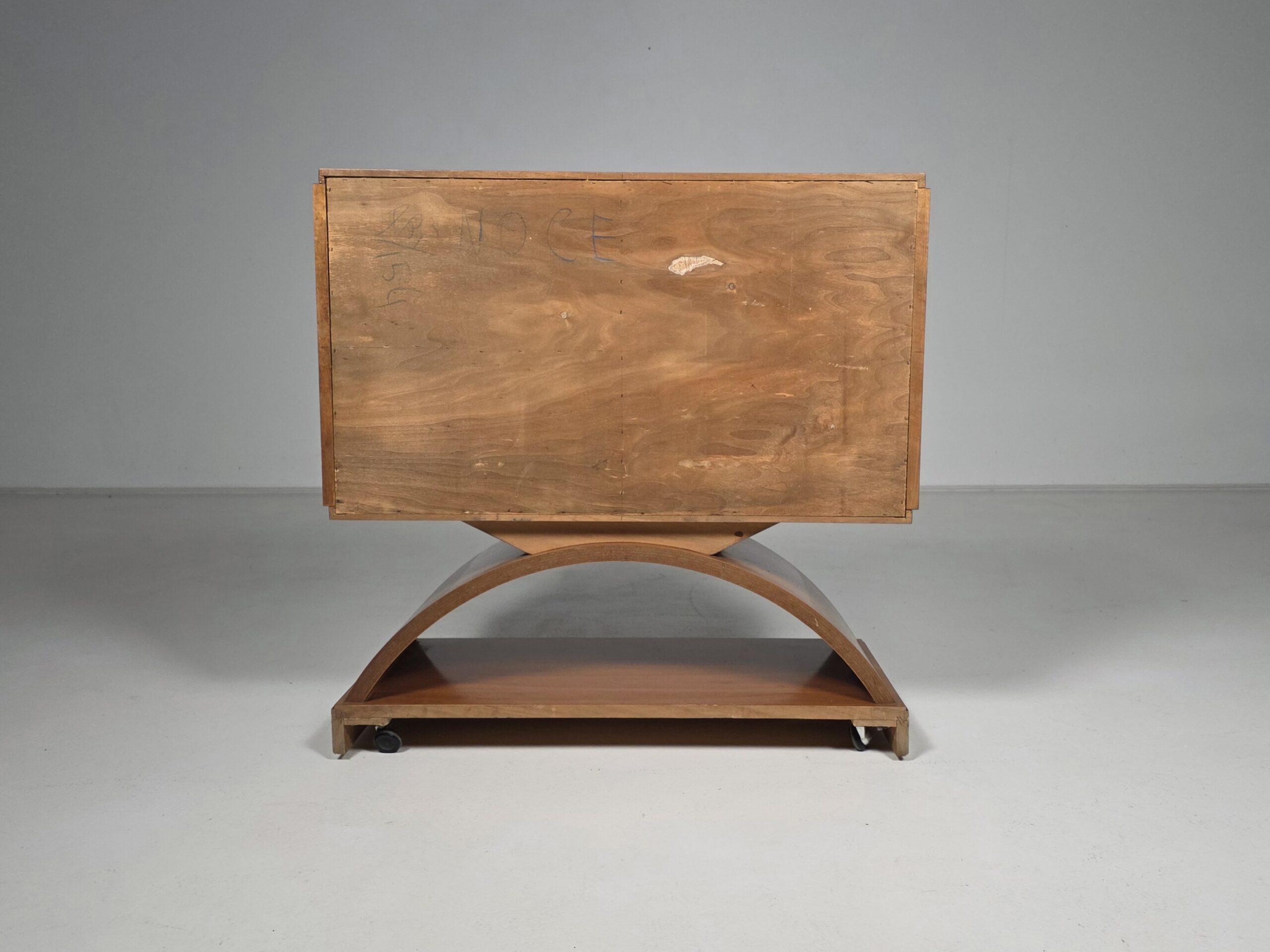 Sculptural mid-century modern mobile bar cabinet featuring an architectural arched pedestal base and floating cabinet form. Crafted in warm-toned wood veneer, the cabinet is raised on a dramatic curved base with discreet casters, allowing for easy movement while maintaining a refined, elegant presence. It opens via a pair of doors with a striking grid of inset rectangular panels, creating visual rhythm and depth while subtly obscuring the interior. Inside, the cabinet offers divided shelving suitable for barware, bottles, or display. The clean-lined interior contrasts beautifully with the expressive exterior form. This piece exemplifies a transitional design language, blending Art Deco–inspired curves with early mid-century modern restraint. The result is a functional yet highly sculptural bar cabinet