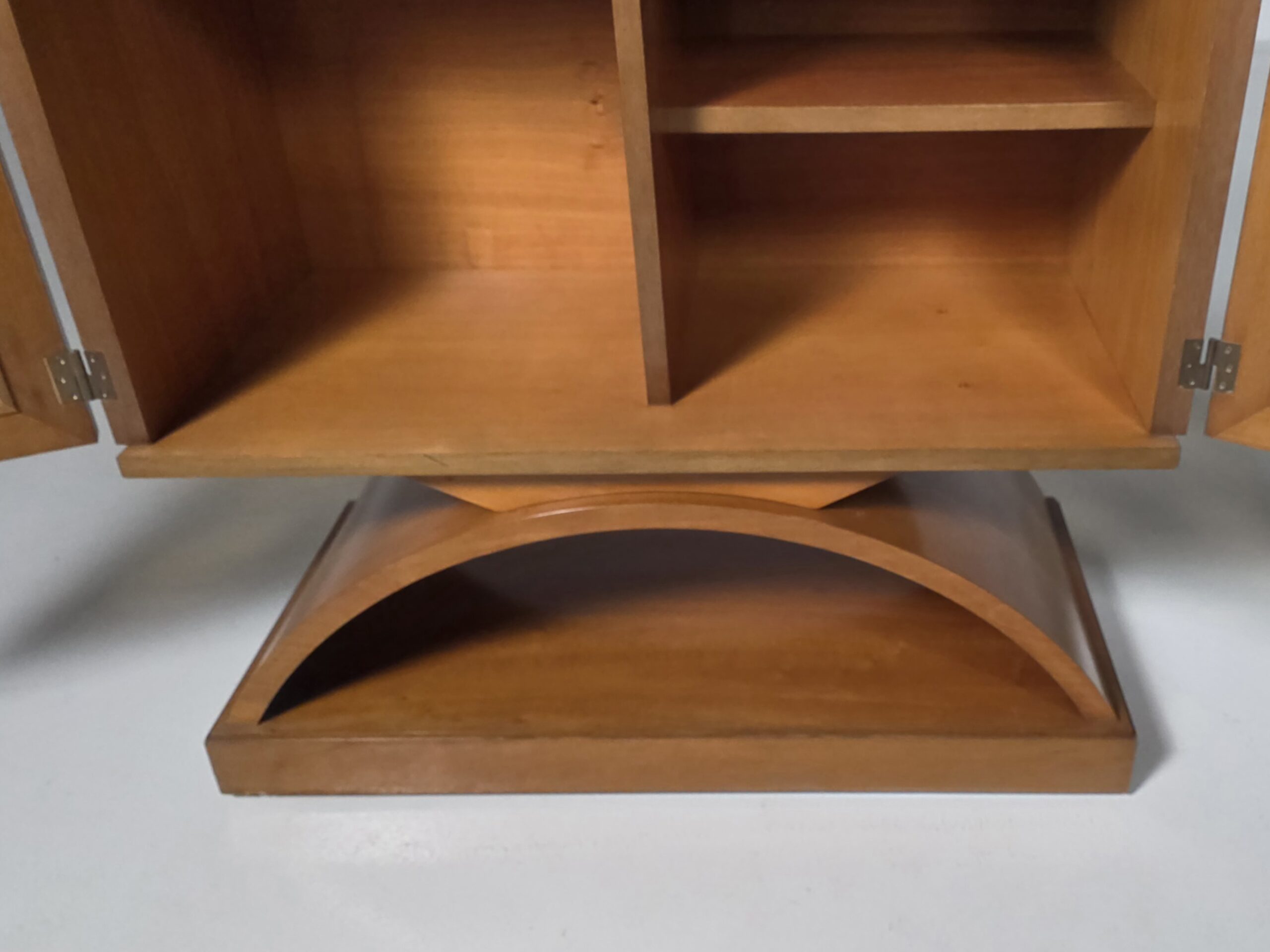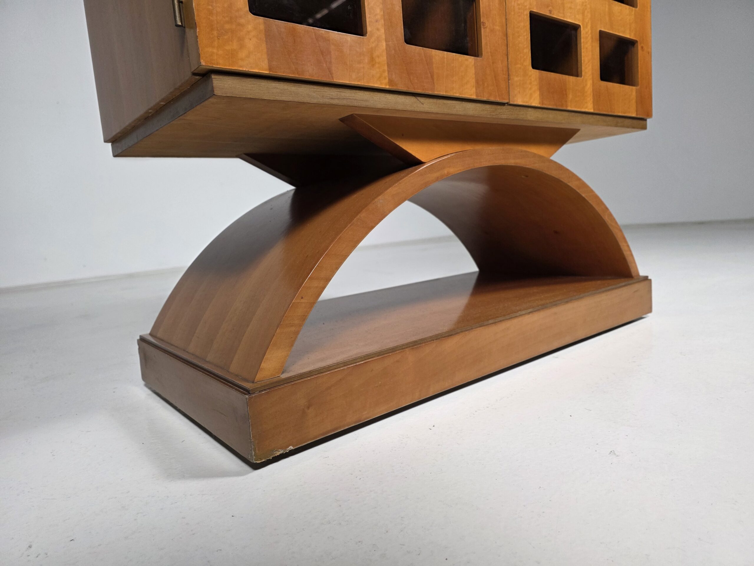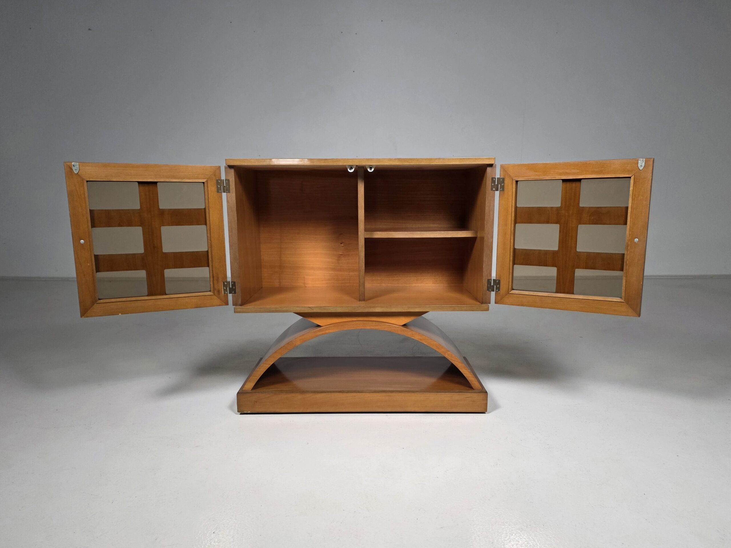 Sculptural mid-century modern mobile bar cabinet featuring an architectural arched pedestal base and floating cabinet form. Crafted in warm-toned wood veneer, the cabinet is raised on a dramatic curved base with discreet casters, allowing for easy movement while maintaining a refined, elegant presence. It opens via a pair of doors with a striking grid of inset rectangular panels, creating visual rhythm and depth while subtly obscuring the interior. Inside, the cabinet offers divided shelving suitable for barware, bottles, or display. The clean-lined interior contrasts beautifully with the expressive exterior form. This piece exemplifies a transitional design language, blending Art Deco–inspired curves with early mid-century modern restraint. The result is a functional yet highly sculptural bar cabinet