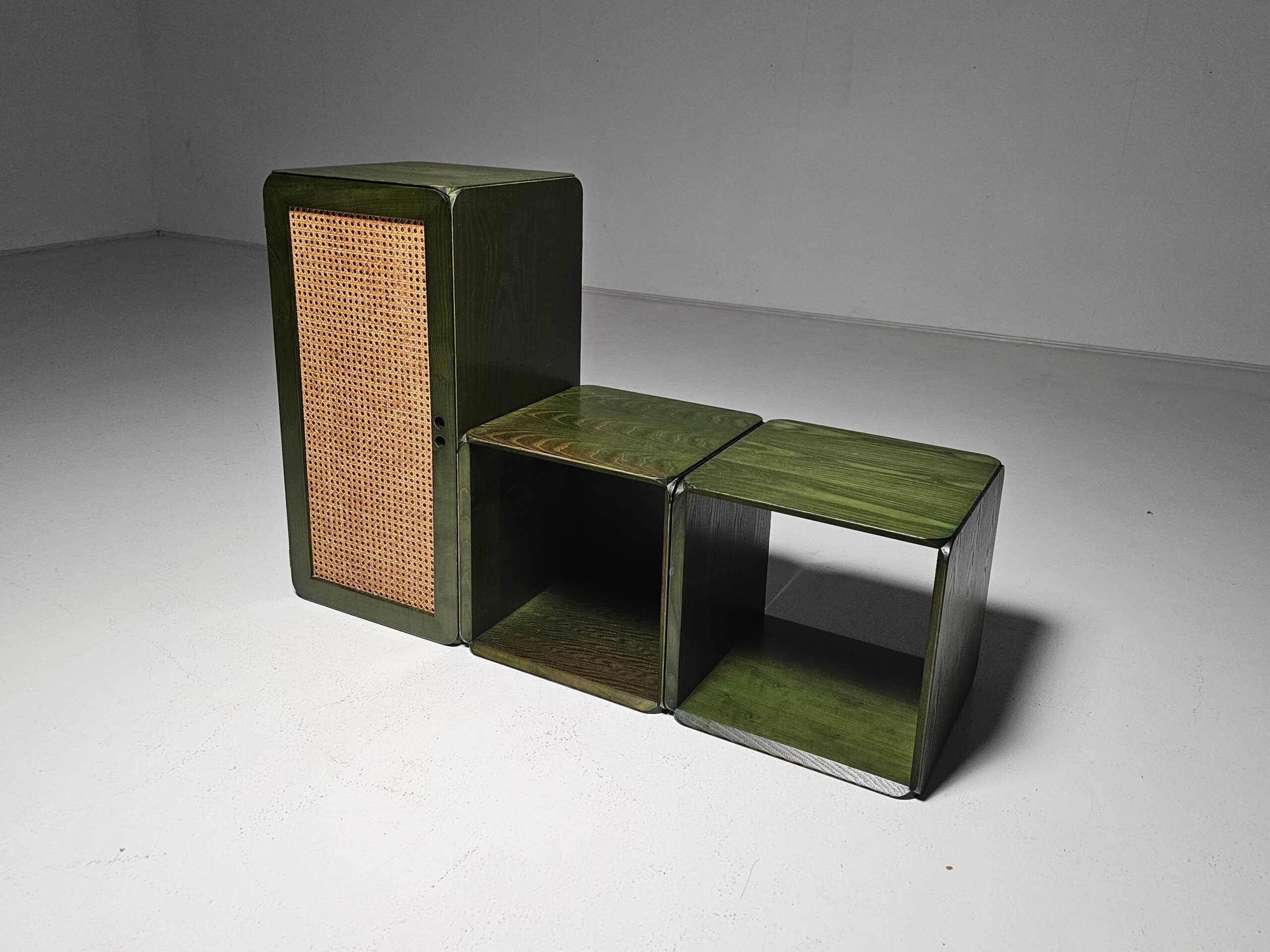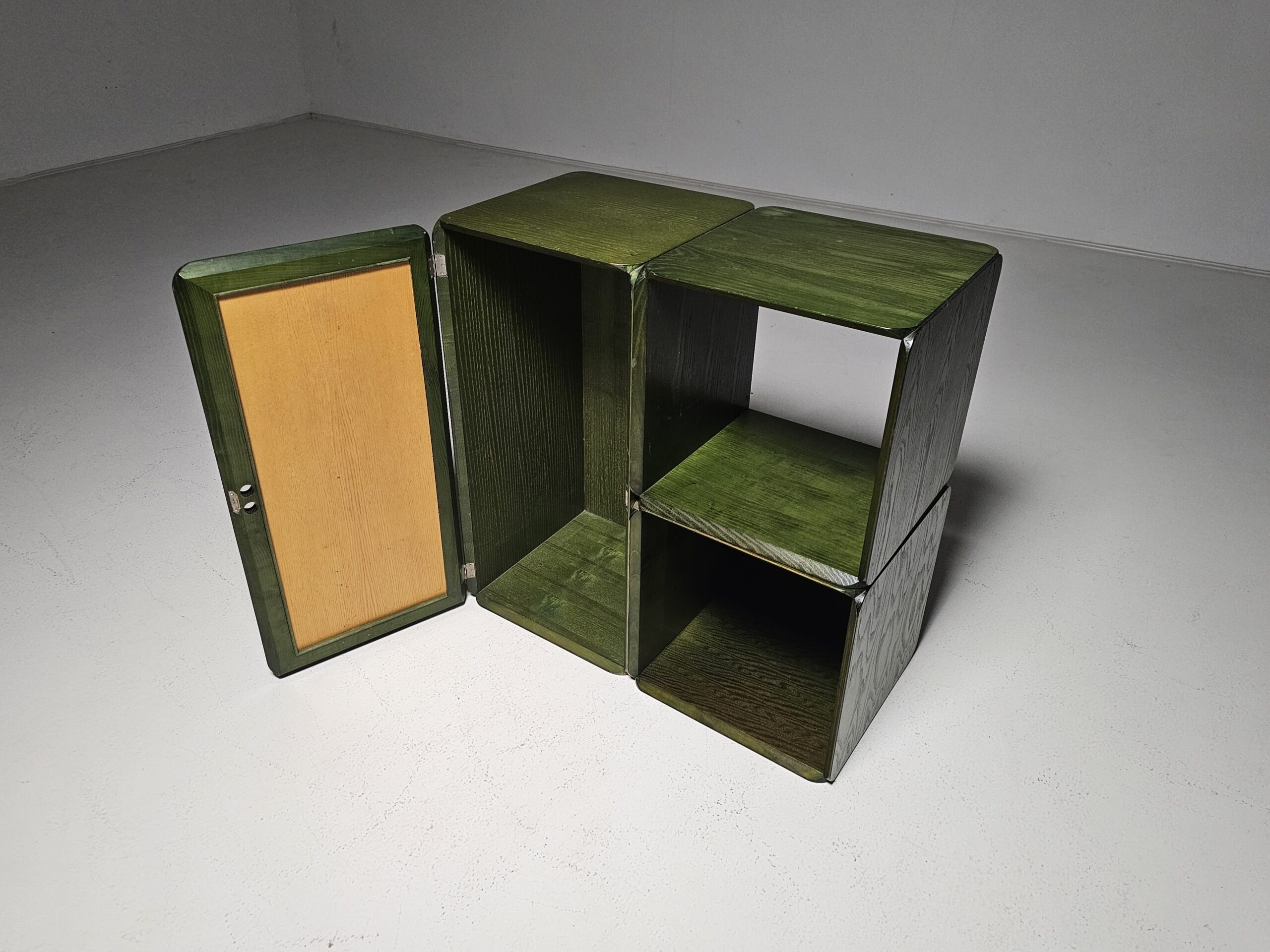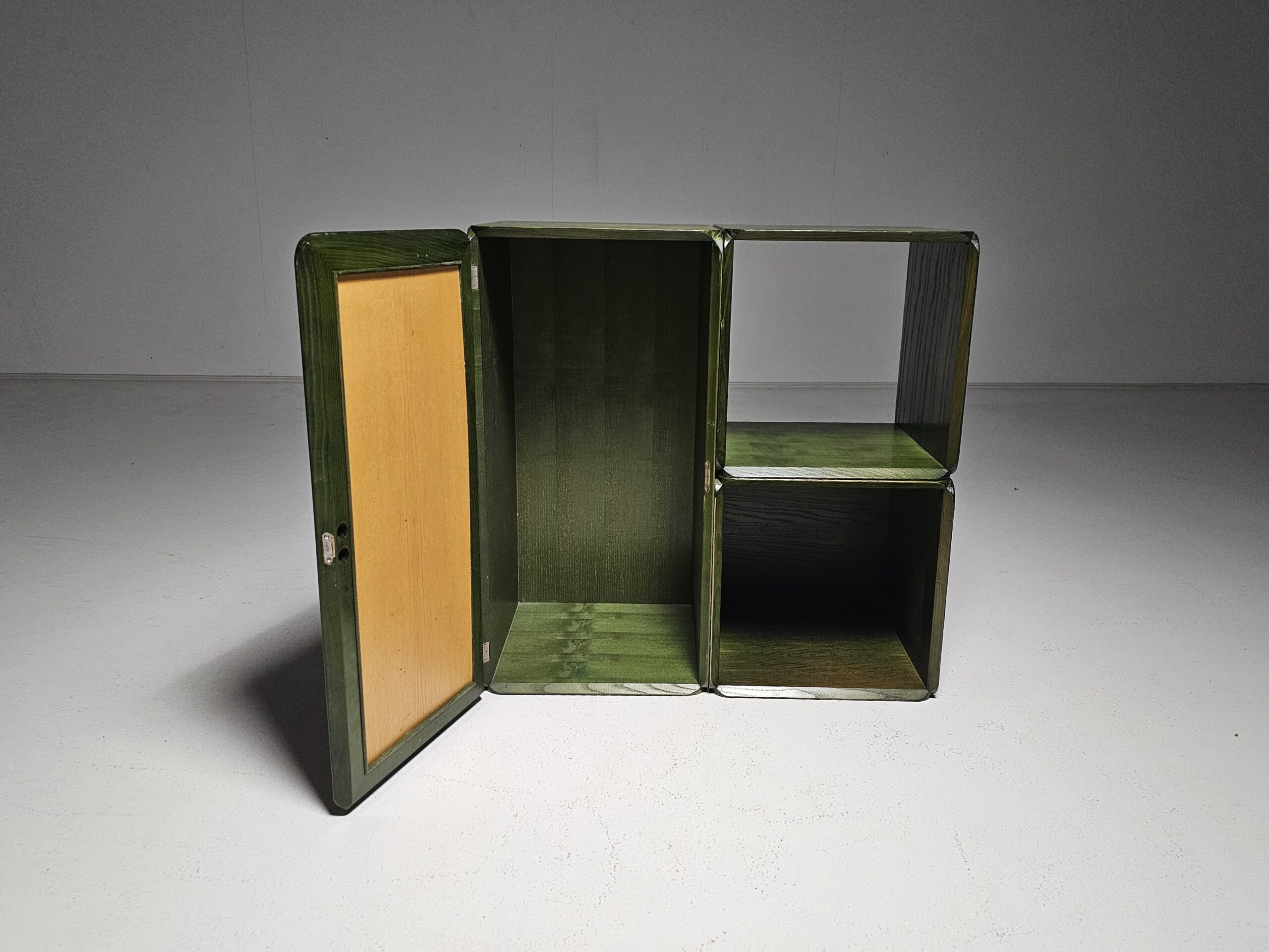 Modular wooden Samara storage wall unit in ash wood with a green finish. Designed by Dutch designer Derk Jan de Vries, the 1970s.