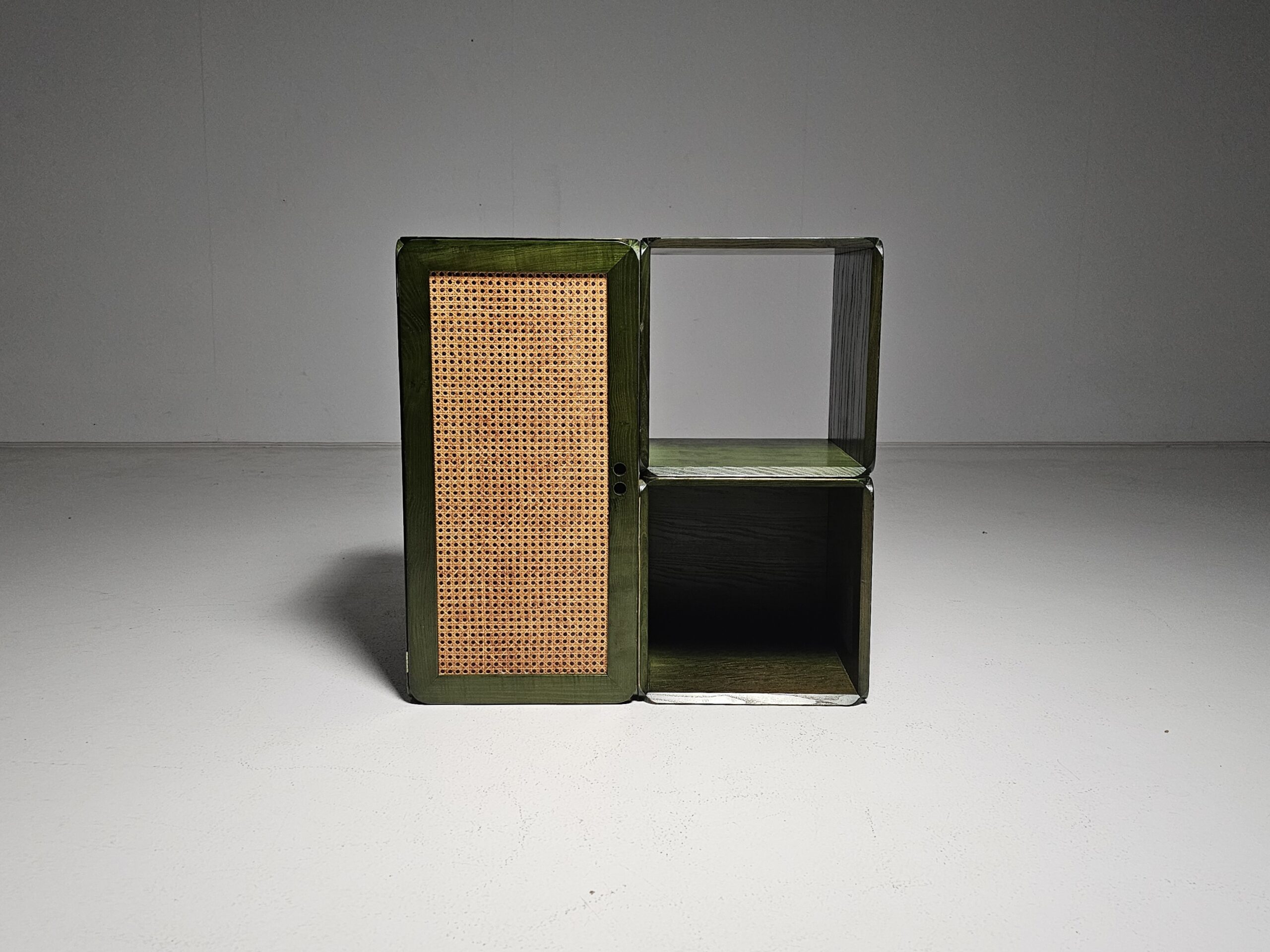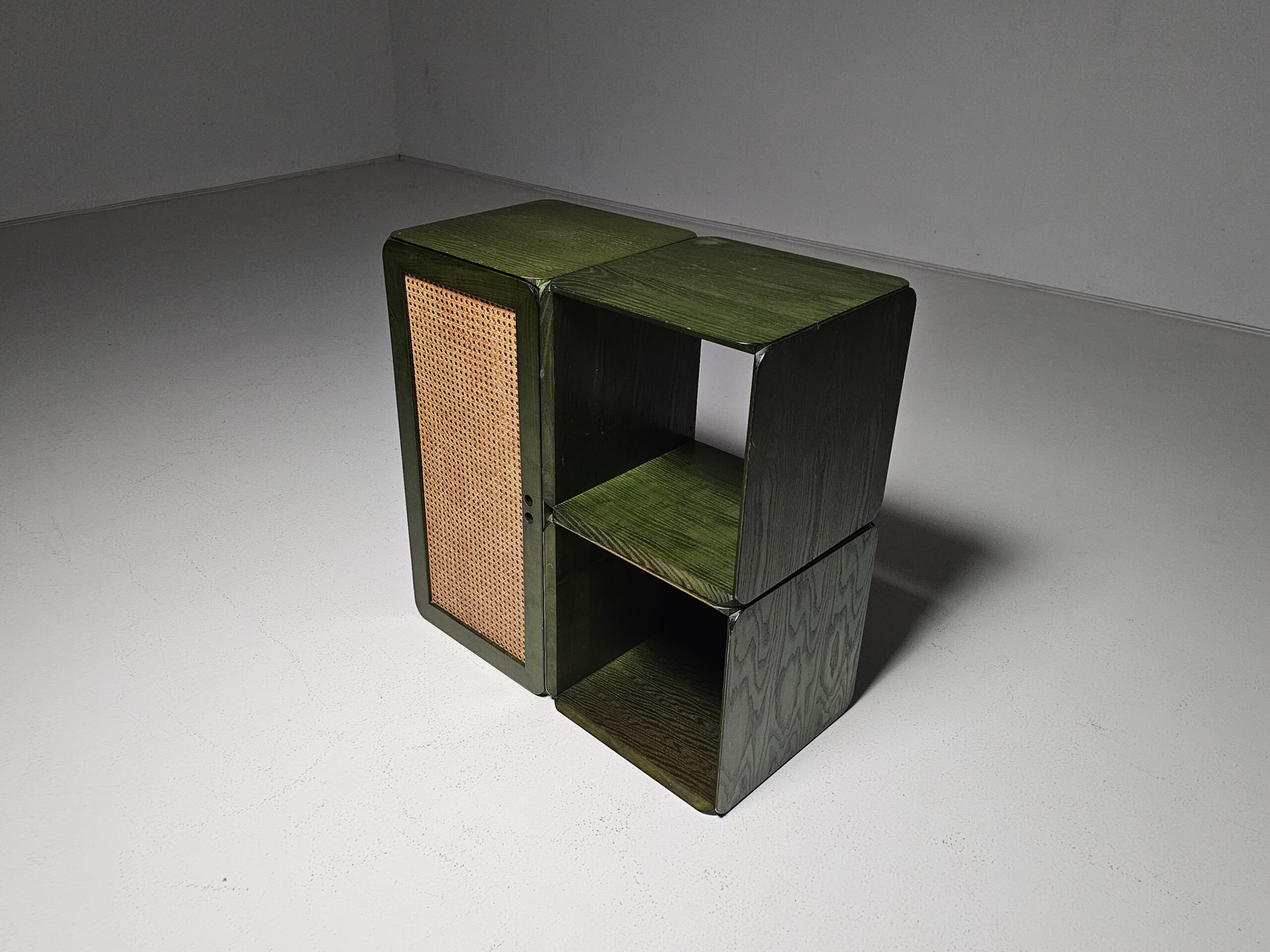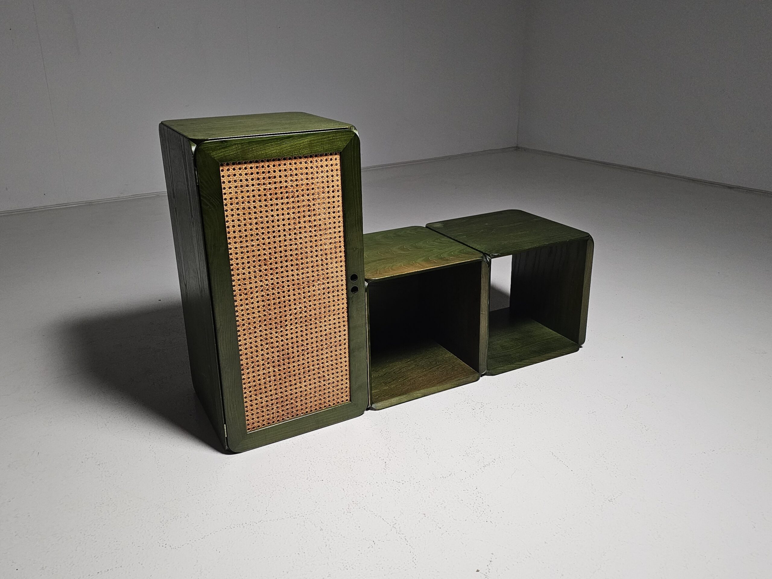 Modular wooden Samara storage wall unit in ash wood with a green finish. Designed by Dutch designer Derk Jan de Vries, the 1970s.
