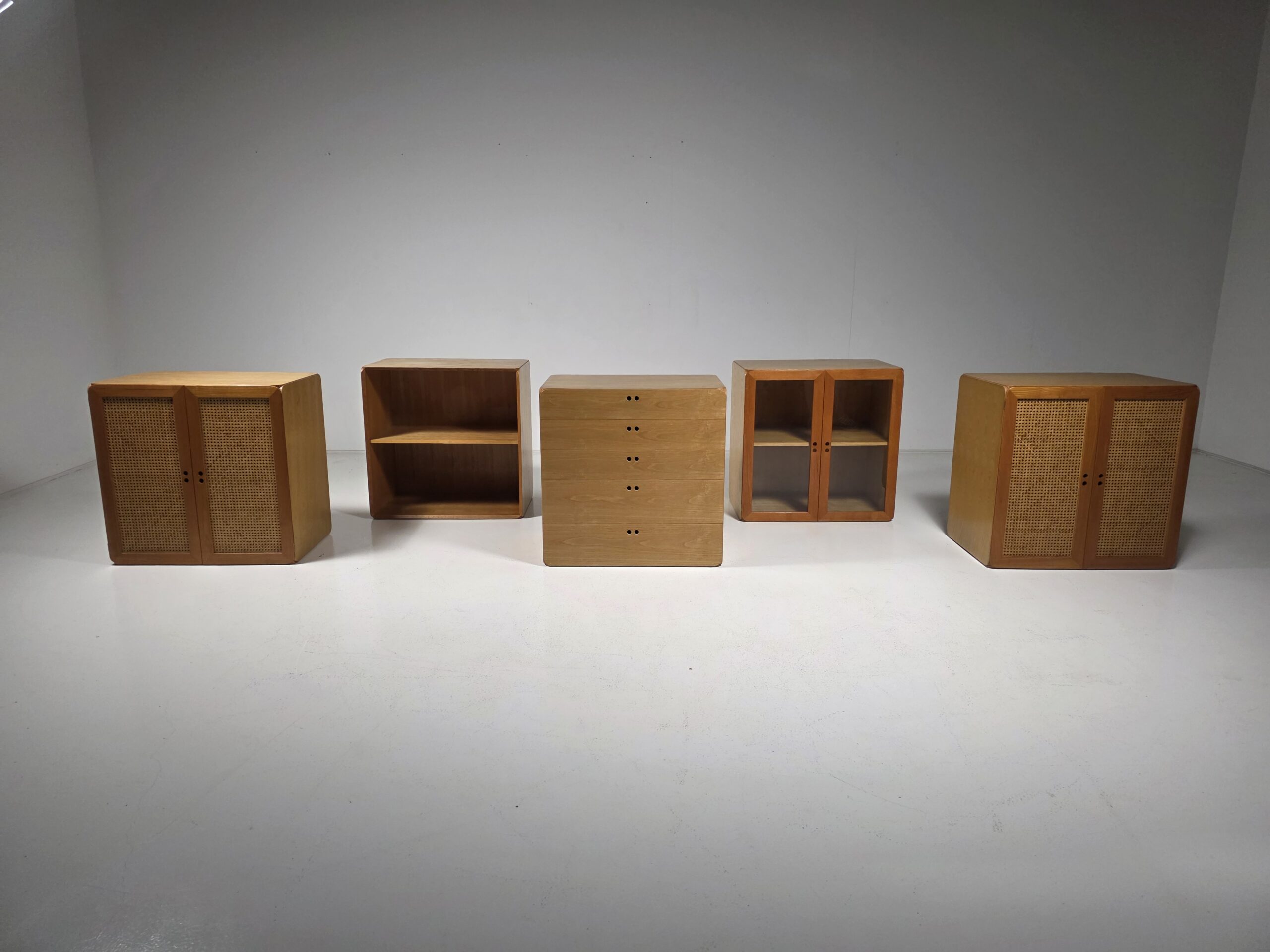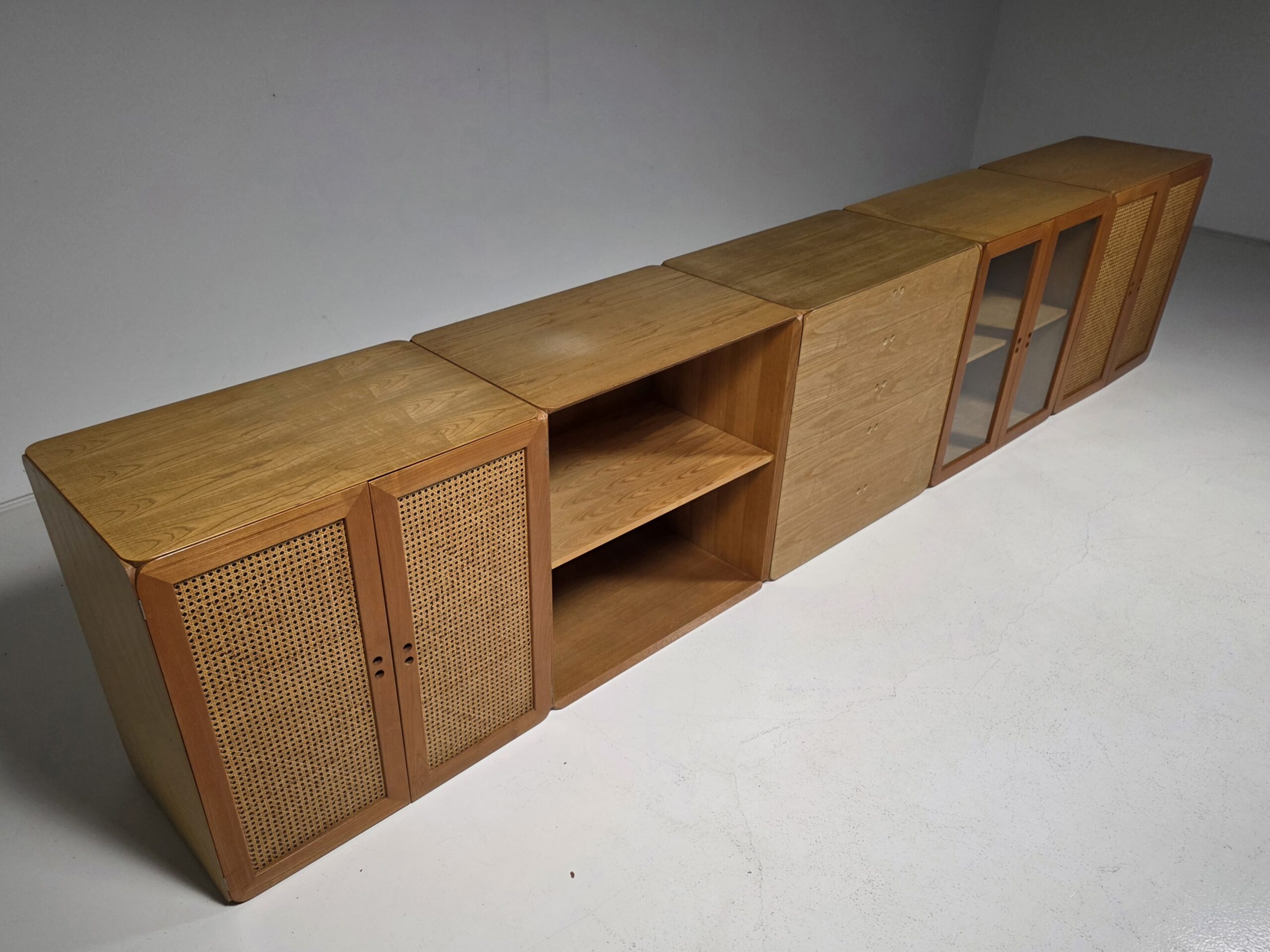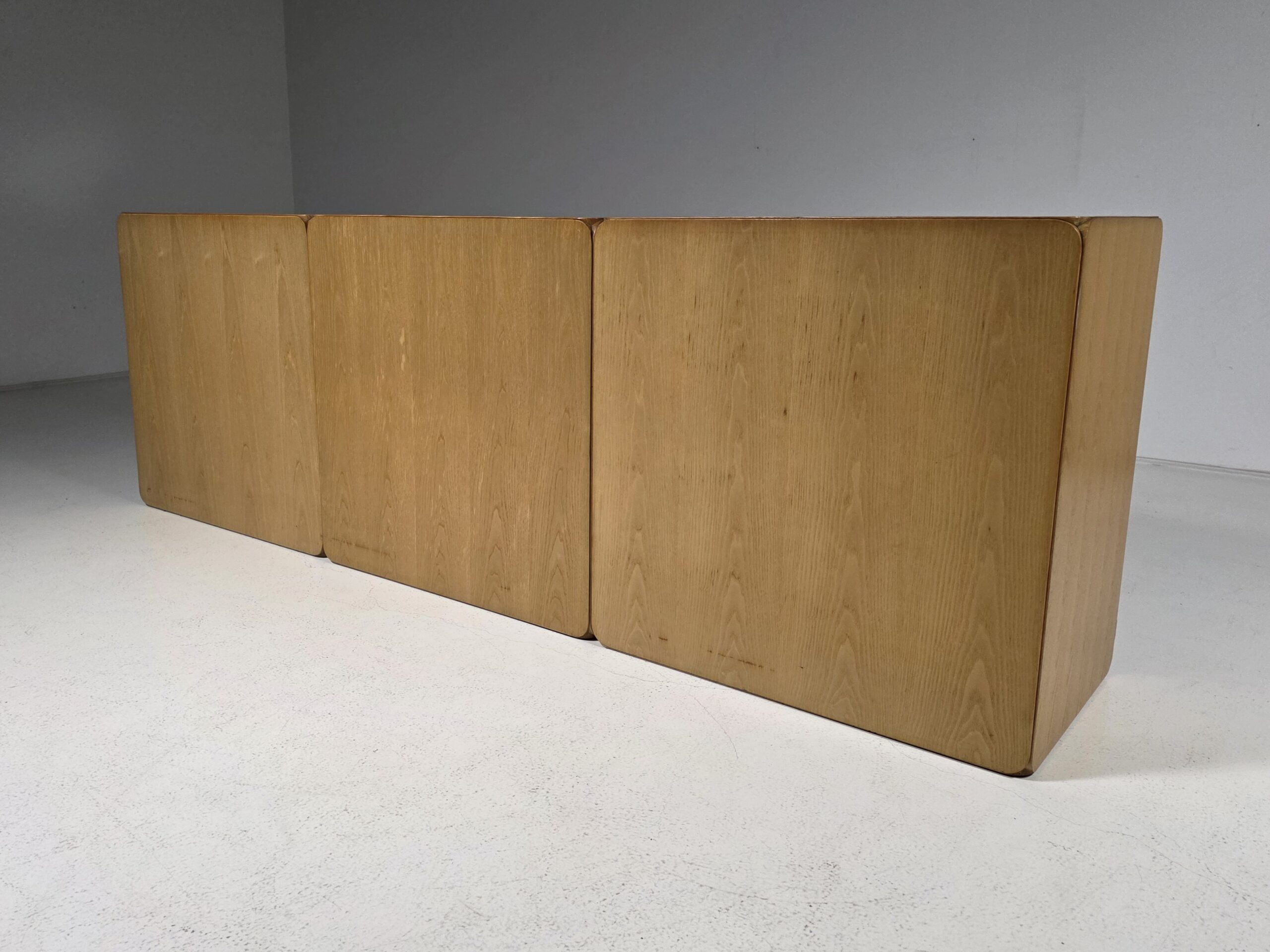 This modular storage unit consists of five volumes and includes shelves and drawers. It provides sufficient space to store and display items such as books, magazines, art and other curiosities. The Samara series reflects De Vries’ innovative approach to flexibility and practical use. The elements can be assembled and customized as desired, making them perfect for contemporary interiors. They all have a different shade of wood due to aging. Each unit measures W 76 cm, D 48 cm, and H 78 cm.