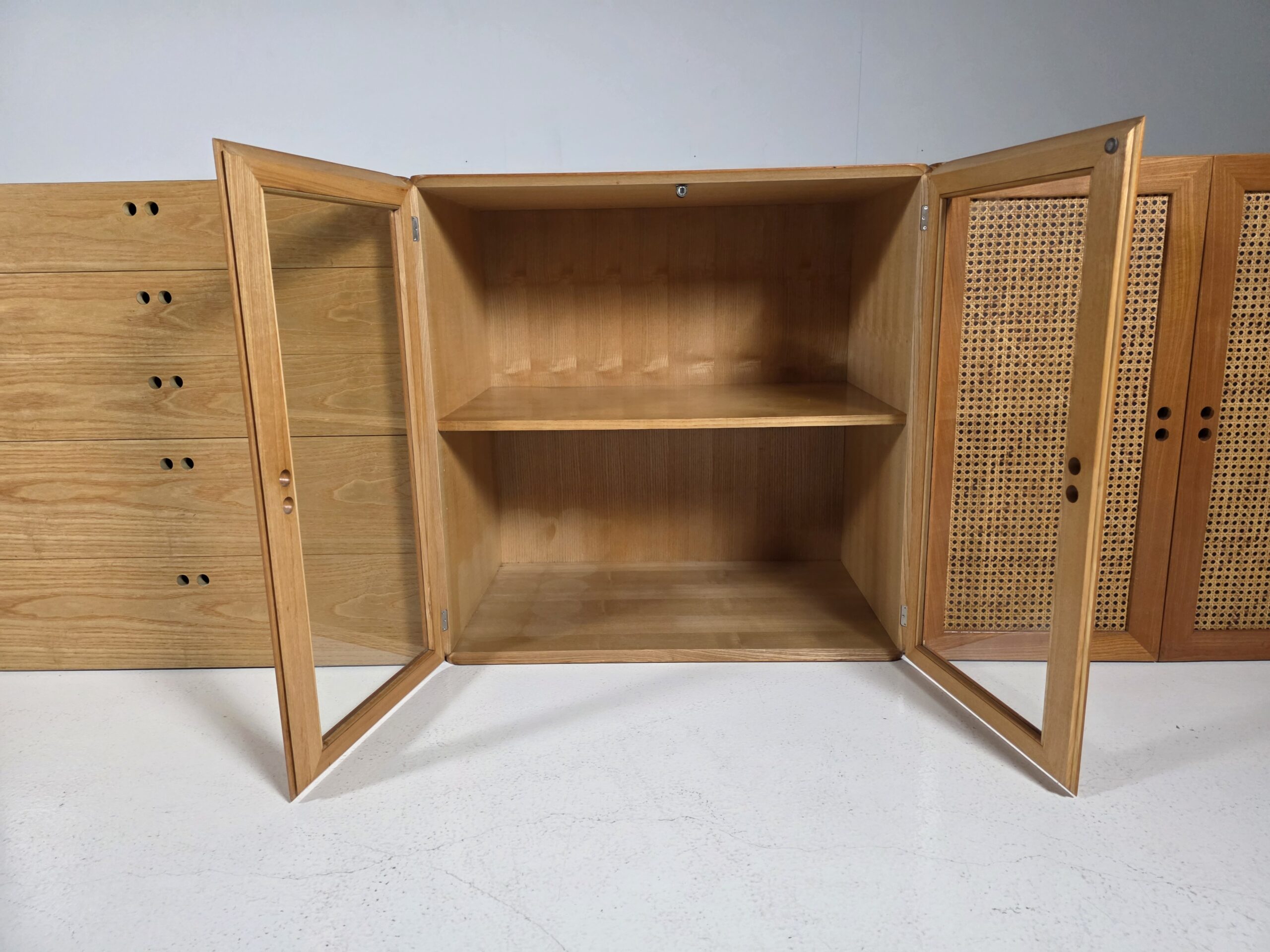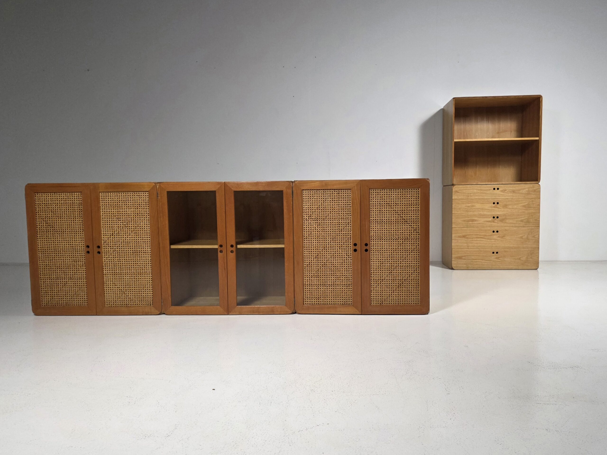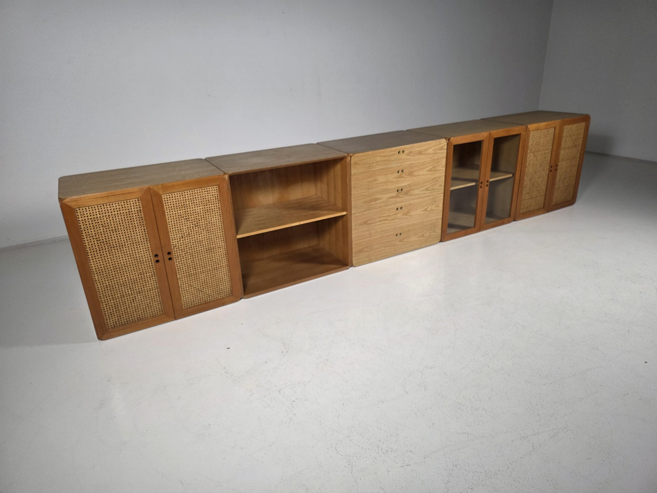 This modular storage unit consists of five volumes and includes shelves and drawers. It provides sufficient space to store and display items such as books, magazines, art and other curiosities. The Samara series reflects De Vries’ innovative approach to flexibility and practical use. The elements can be assembled and customized as desired, making them perfect for contemporary interiors. They all have a different shade of wood due to aging. Each unit measures W 76 cm, D 48 cm, and H 78 cm.
