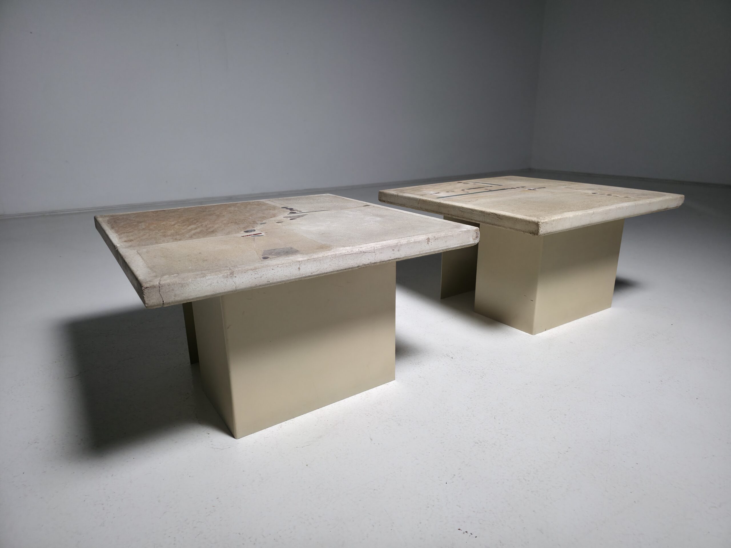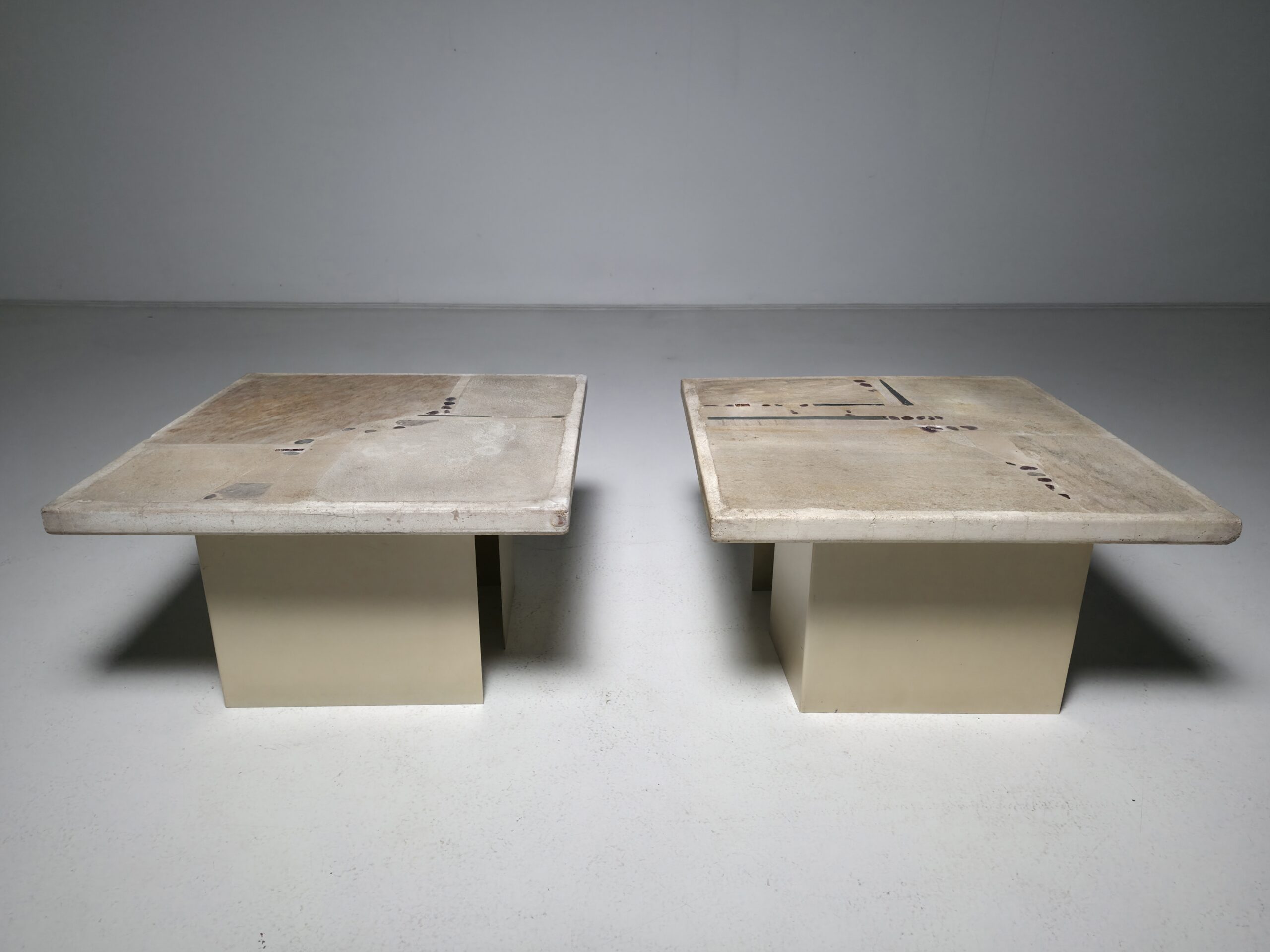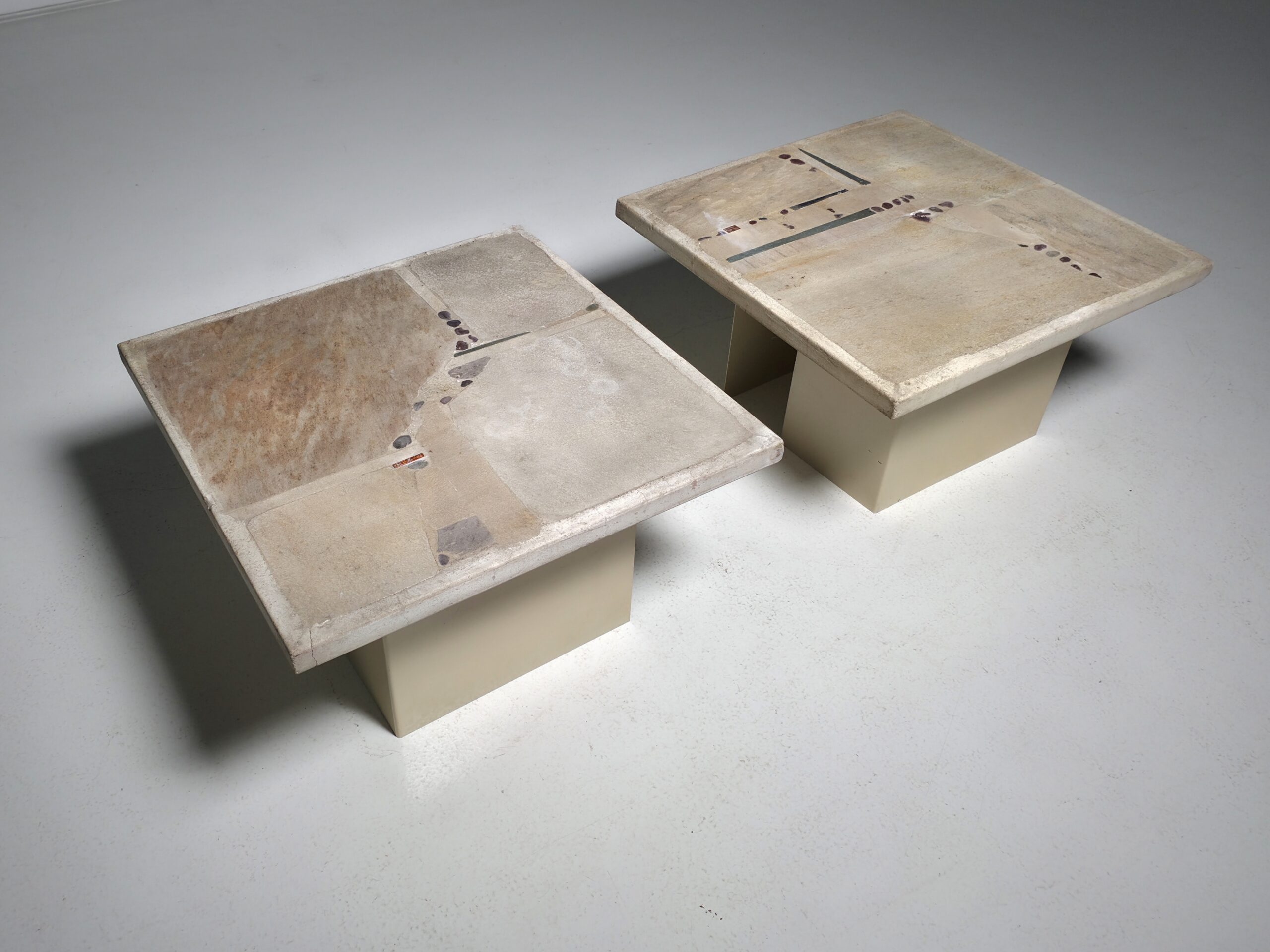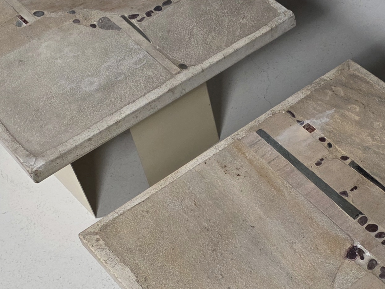 The tables feature a carefully composed geometric inlay of natural stone and metal elements, set within a hand-cast stone composite surface. Their warm sand / limestone-toned palette gives them a refined, natural presence, distinguishing them from the more commonly found darker Kingma pieces.