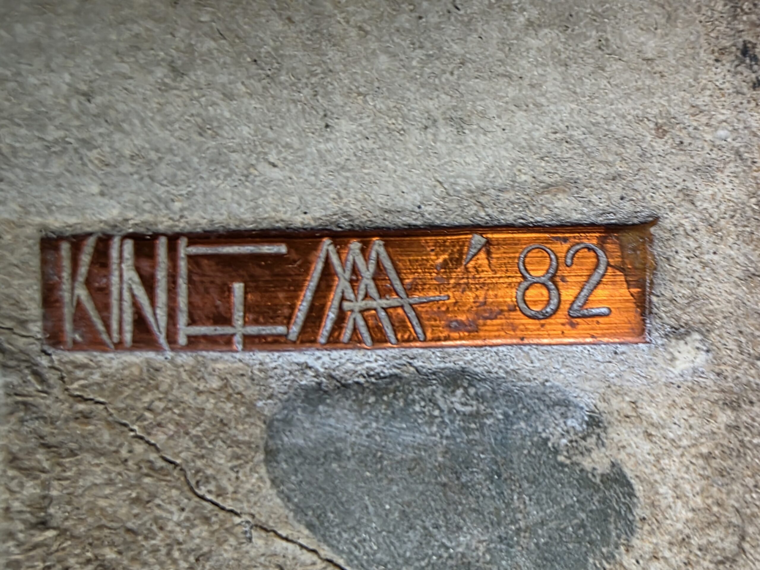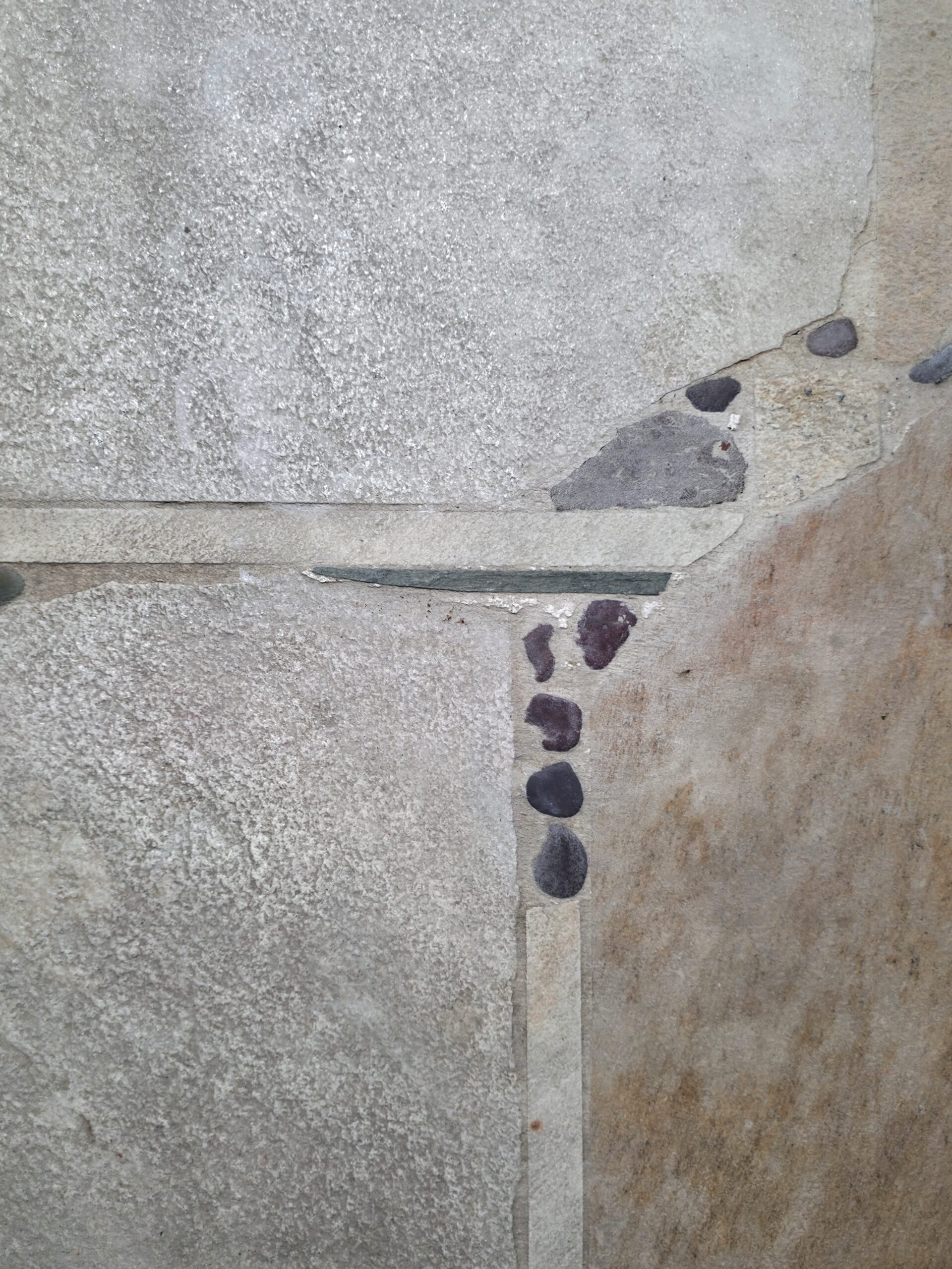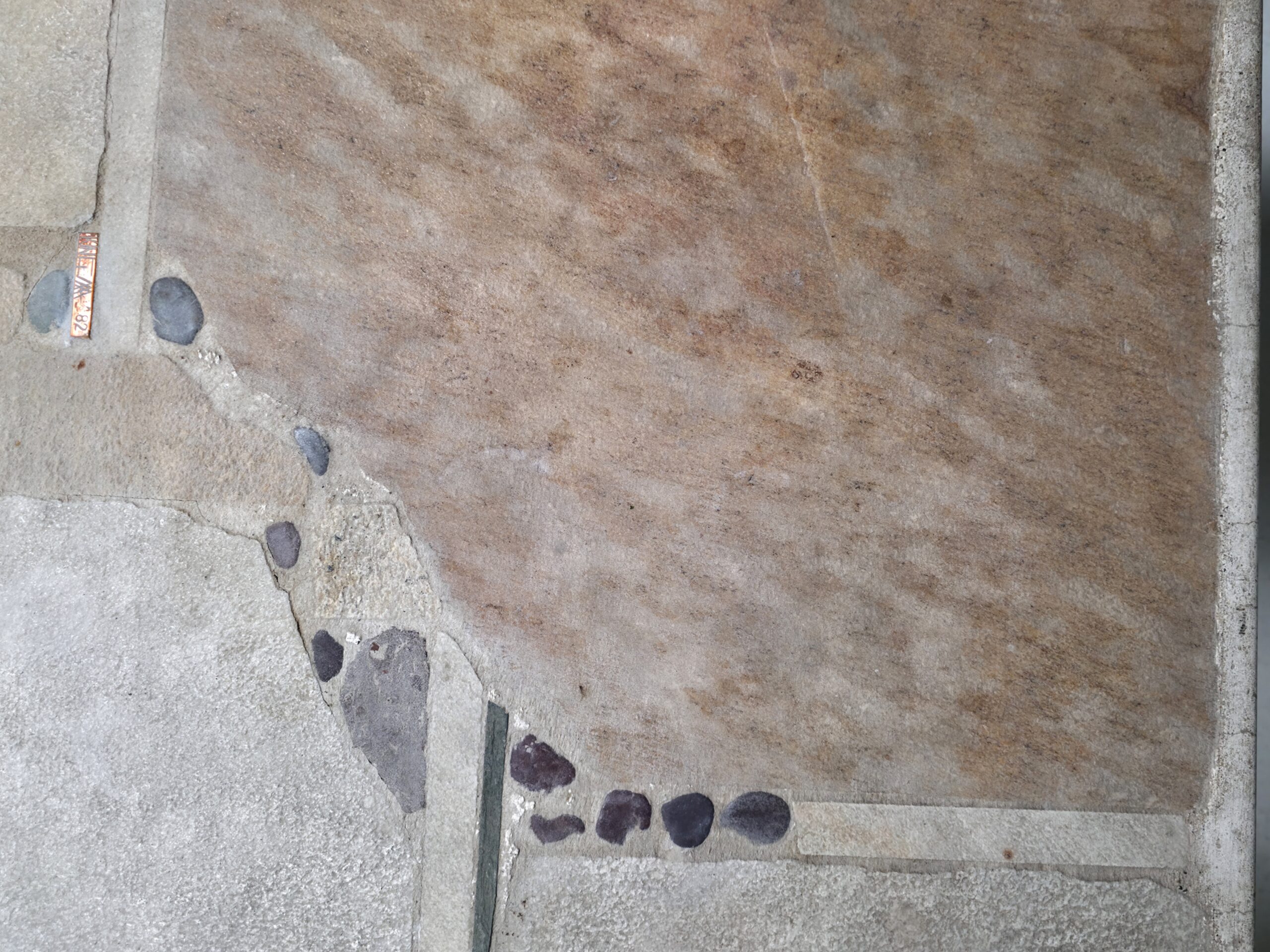 The tables feature a carefully composed geometric inlay of natural stone and metal elements, set within a hand-cast stone composite surface. Their warm sand / limestone-toned palette gives them a refined, natural presence, distinguishing them from the more commonly found darker Kingma pieces.