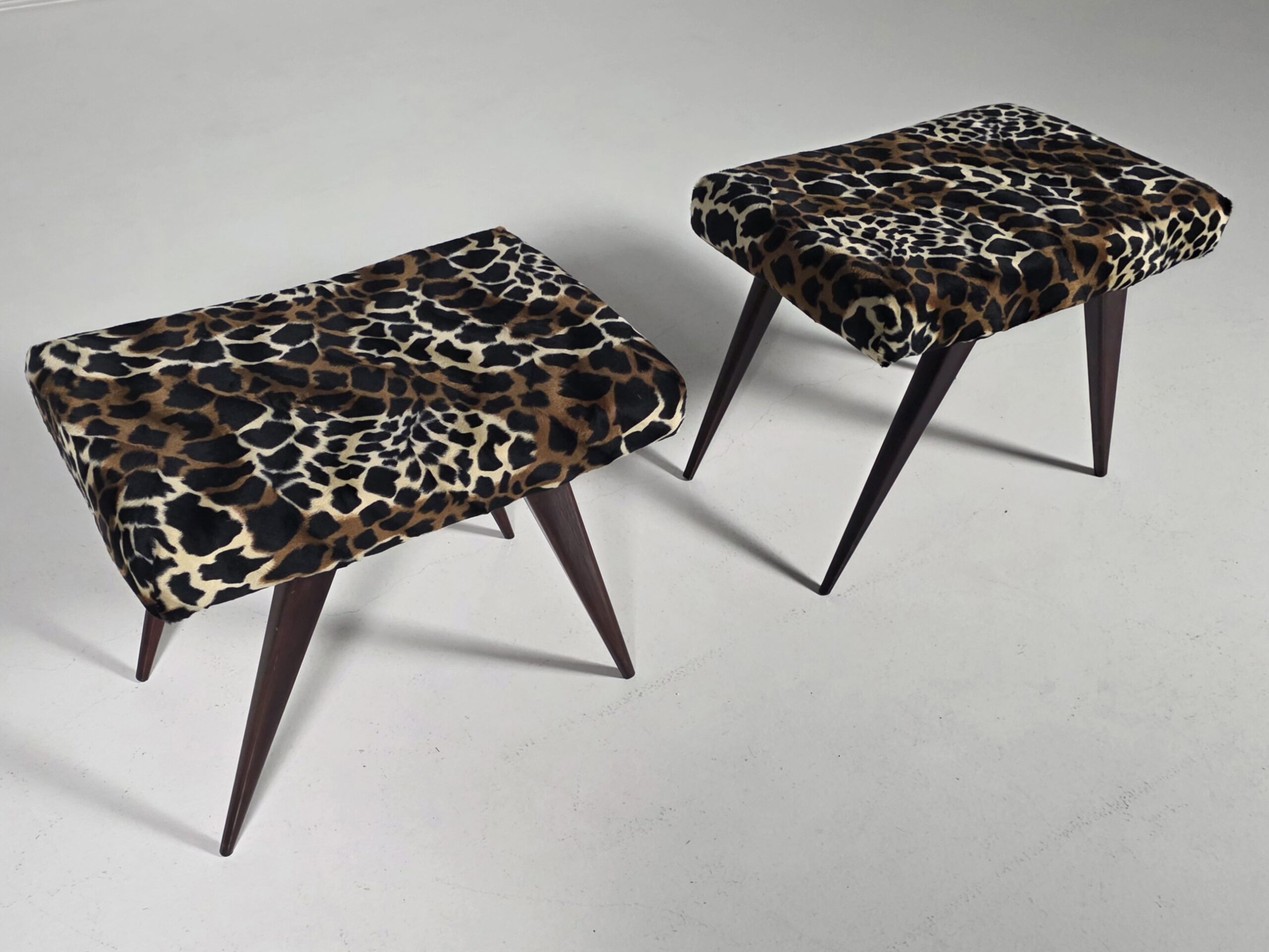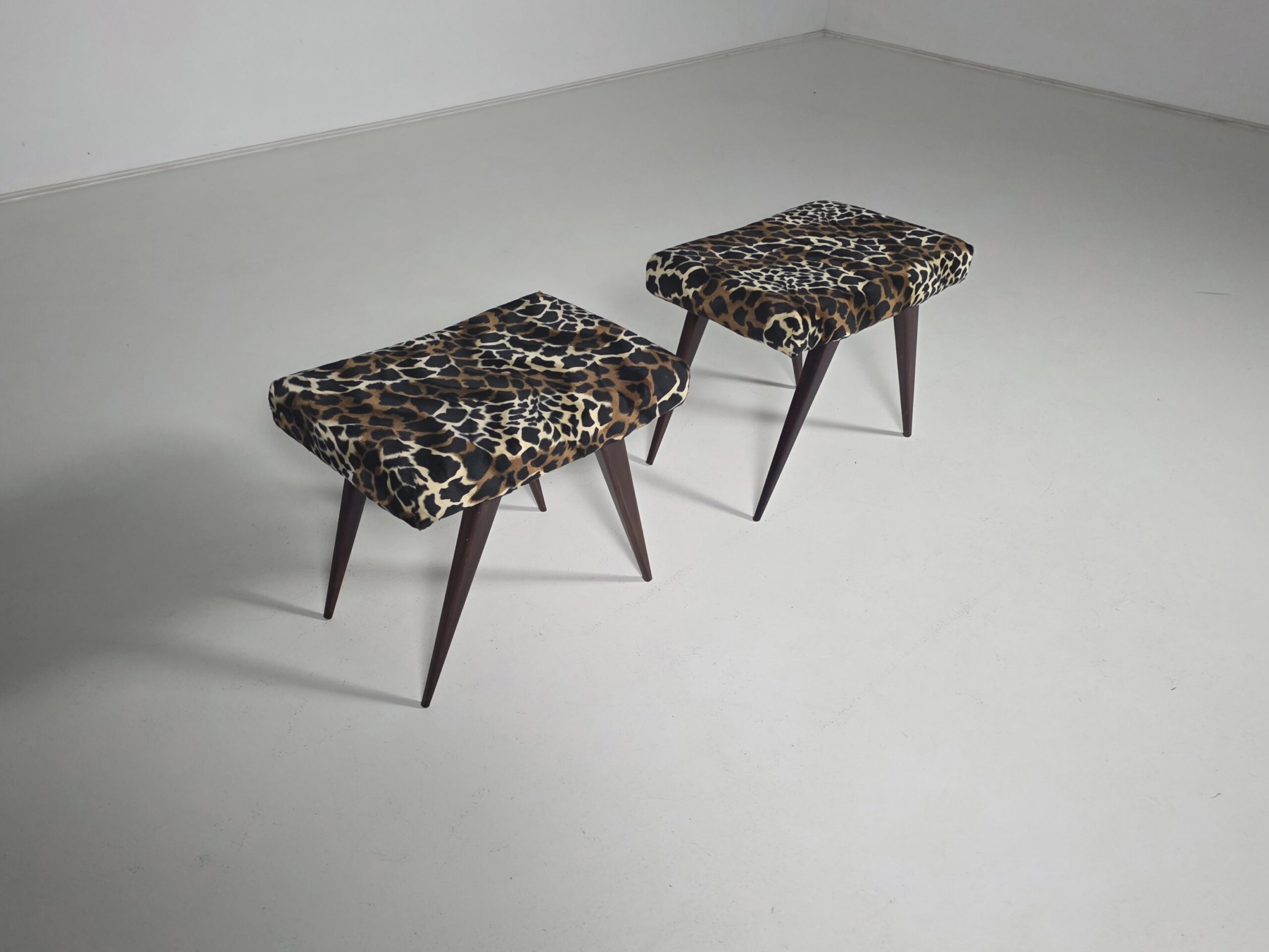 The stools feature beautifully splayed, tapered wooden legs with a warm, dark-stained finish, characteristic of postwar Italian design and craftsmanship. The seats have been newly reupholstered in a leopard-patterned fabric, adding a bold, contemporary accent while preserving the clean architectural lines of the original design. Versatile in use, these stools work equally well as accent seating, bedroom or dressing stools, footstools, or statement pieces in a living space. A refined combination of Italian mid-century form and modern decorative flair.