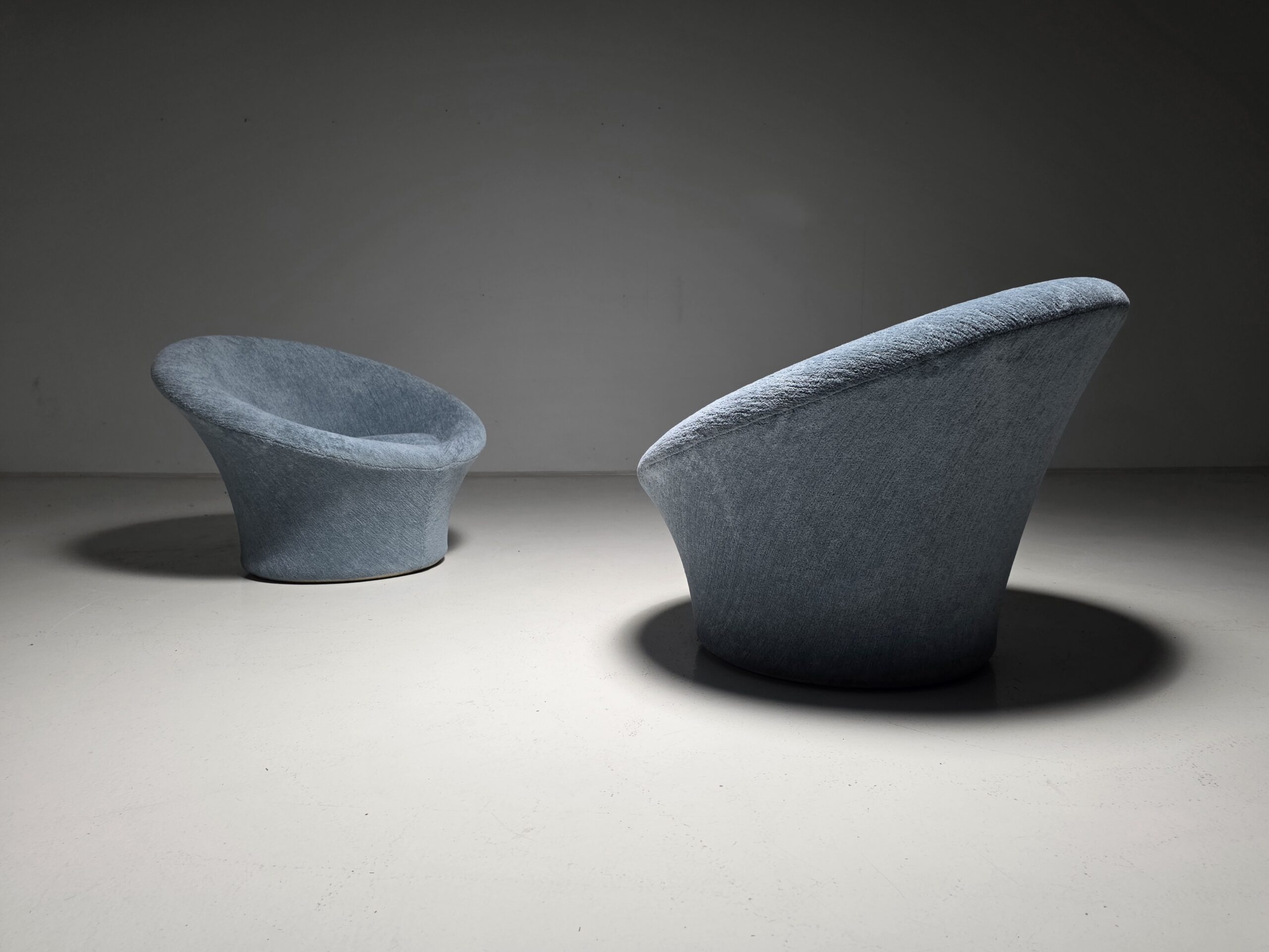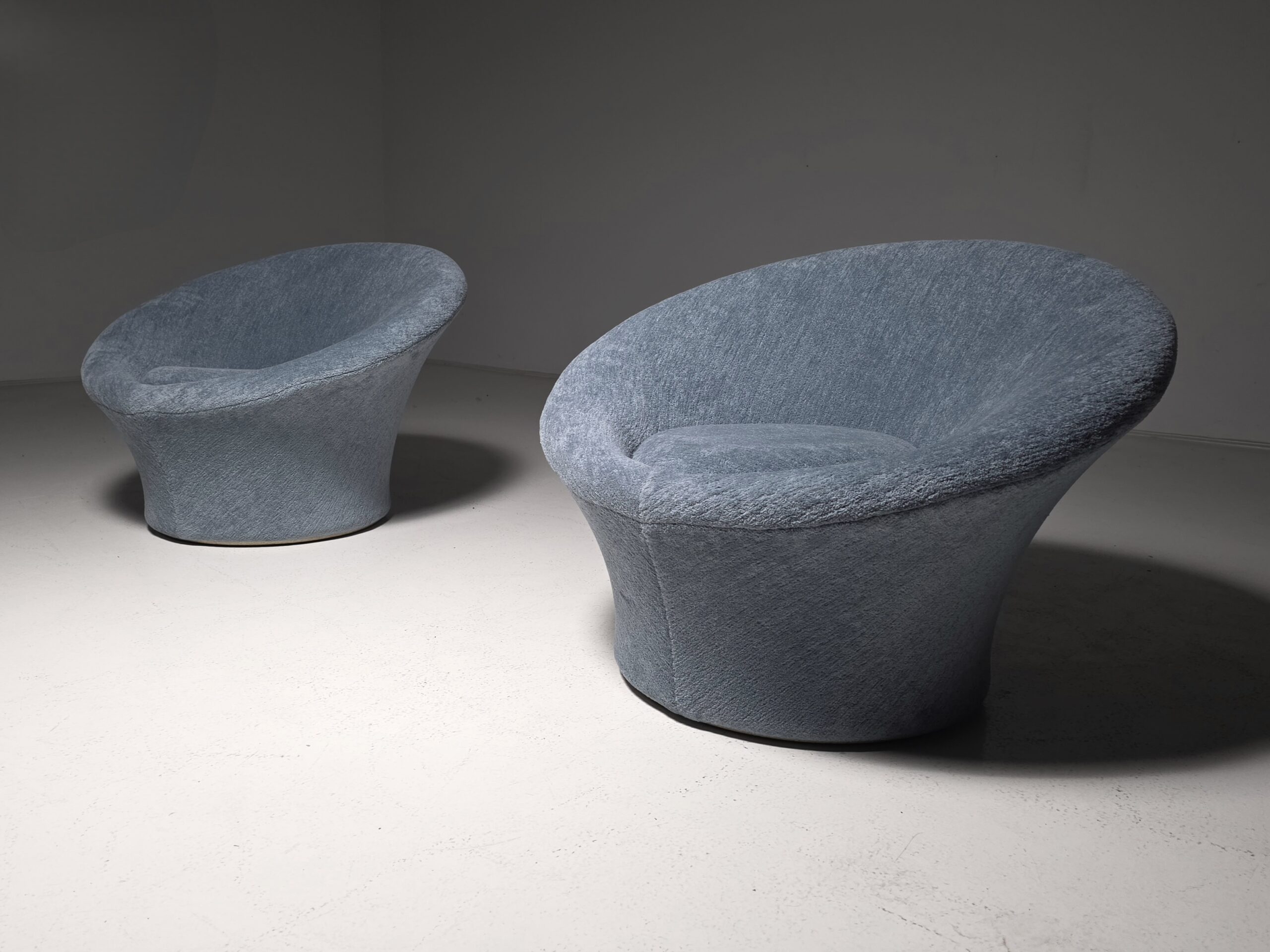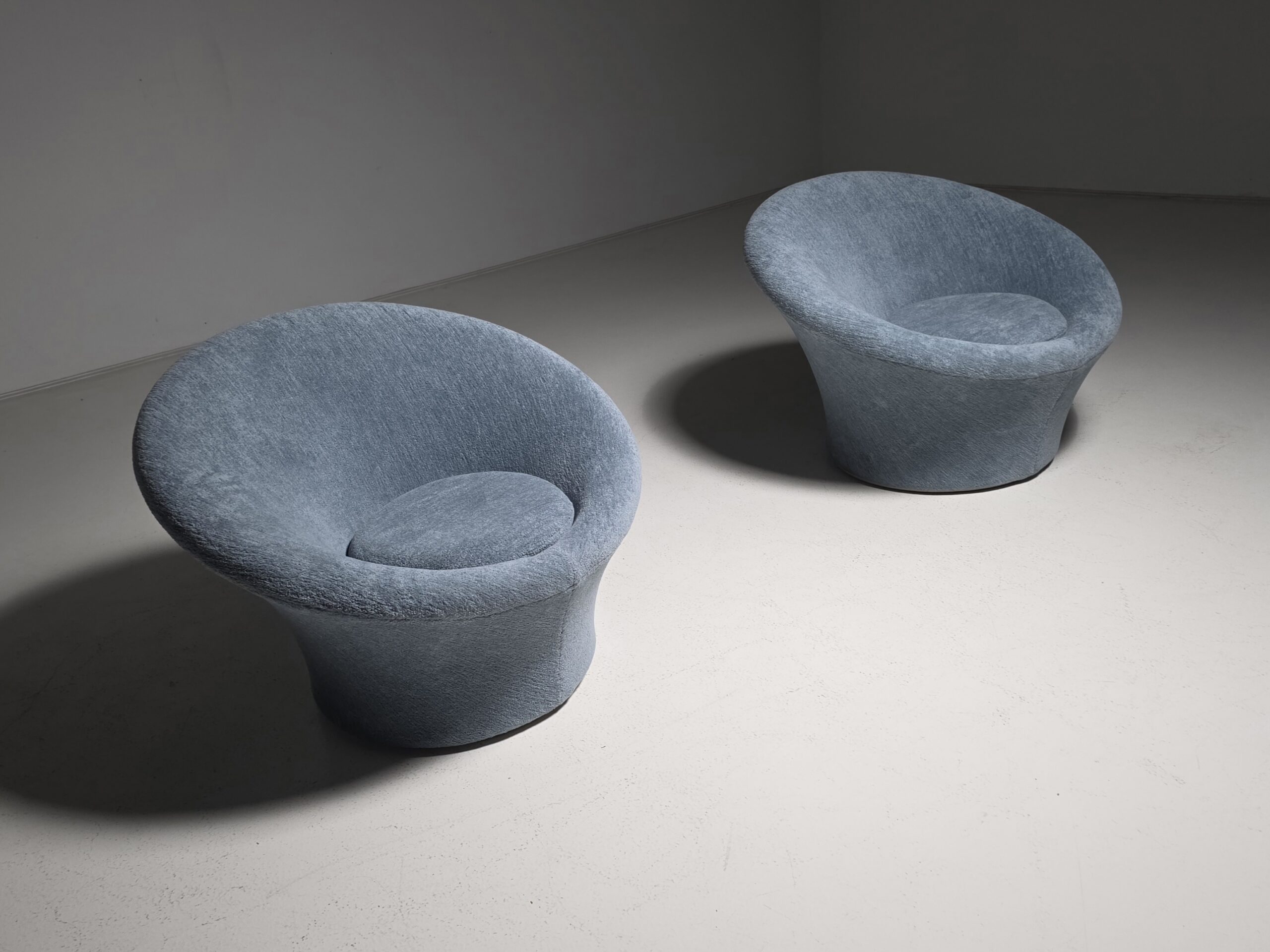A sculptural pair of Pierre Paulin’s iconic Mushroom lounge chairs for Artifort. These early-edition pieces feature the characteristic enveloping silhouette that made the model a mid-century design classic: a softly flared base rising in one continuous curve to form the back and arms, creating a deep, cocooning seat. Upholstered in a light blue Pierre Frey chenille, the chairs have a tactile, almost cloud-like surface that highlights their organic shape and adds a contemporary softness while respecting the original design.