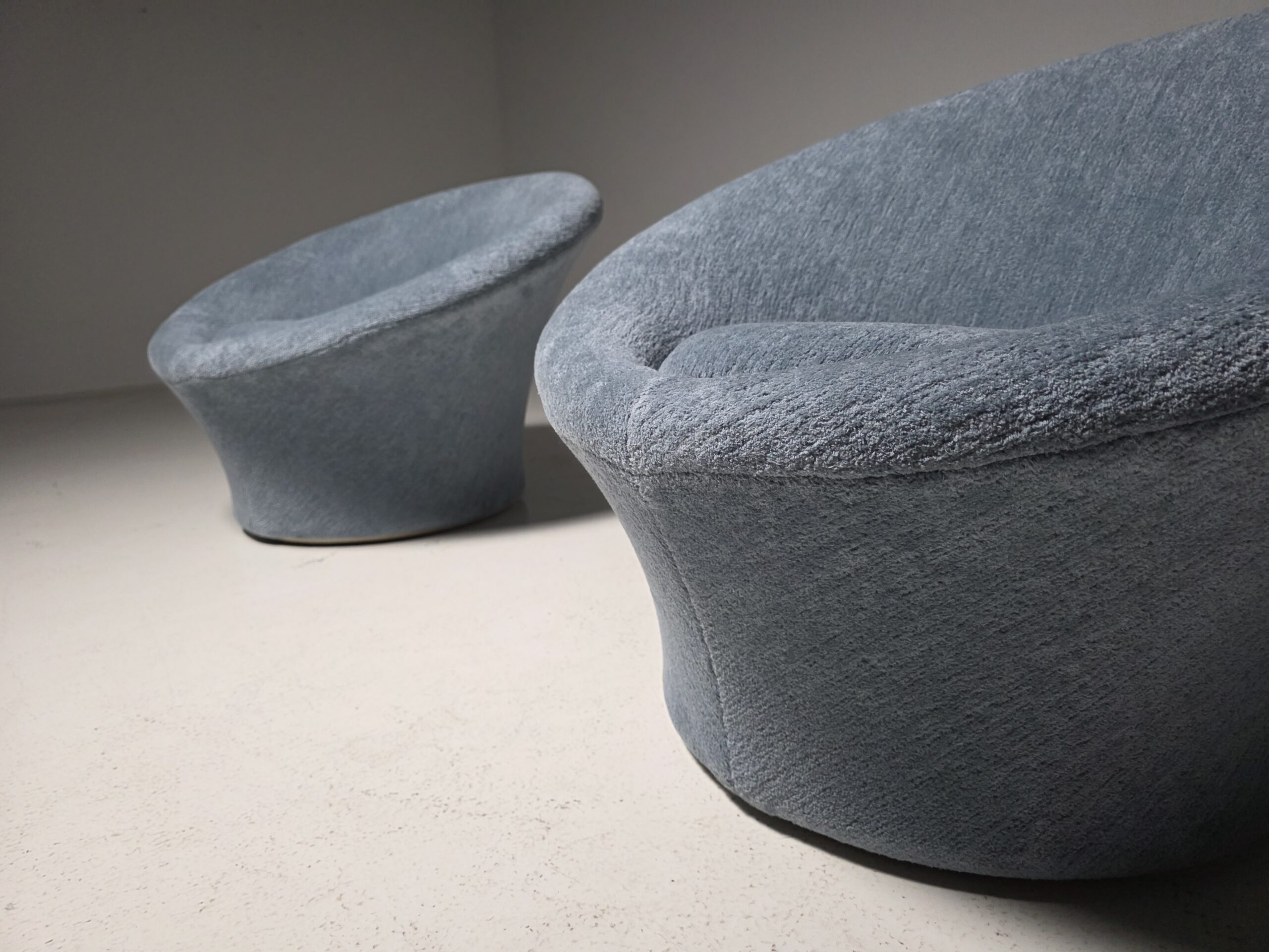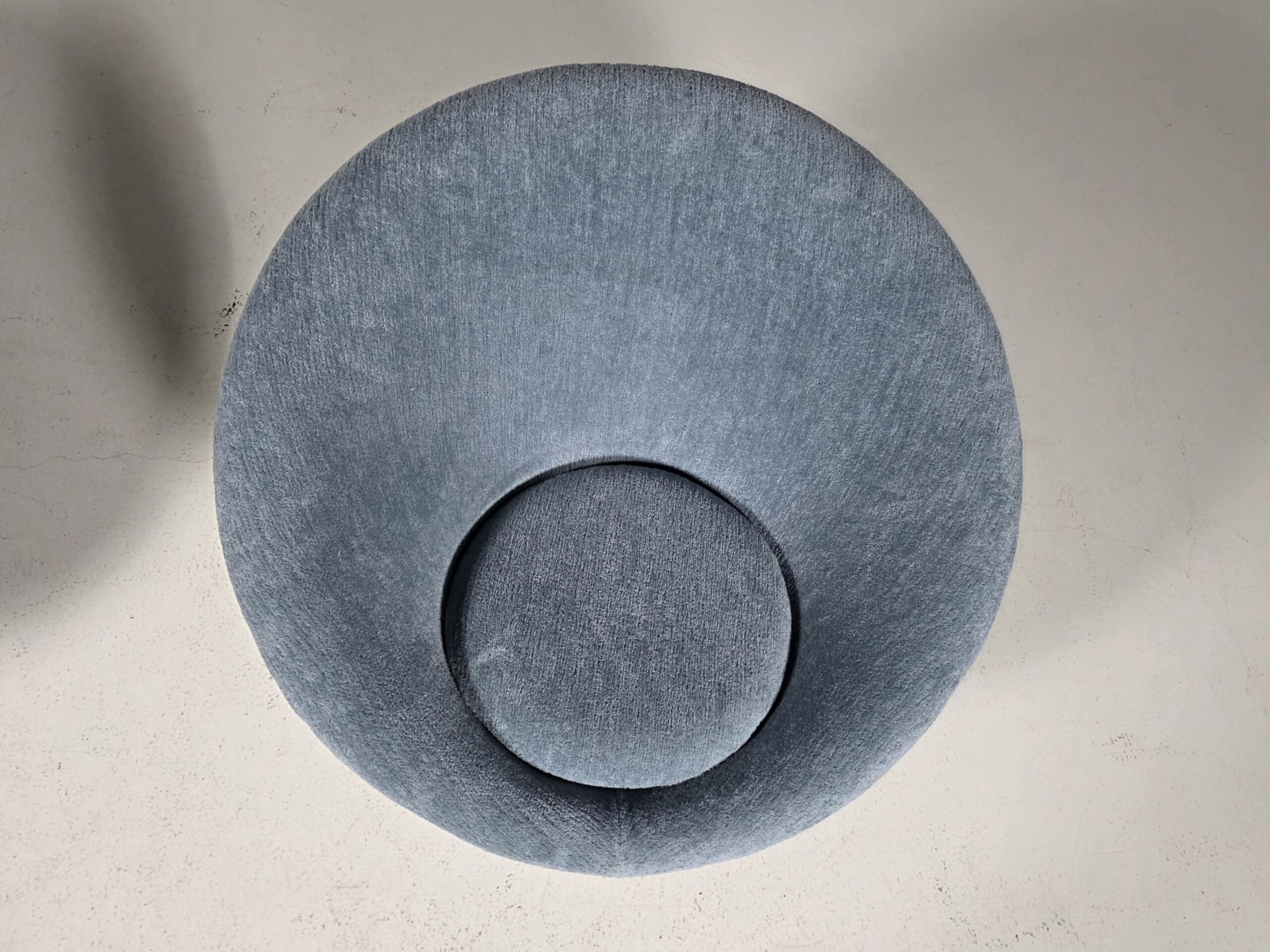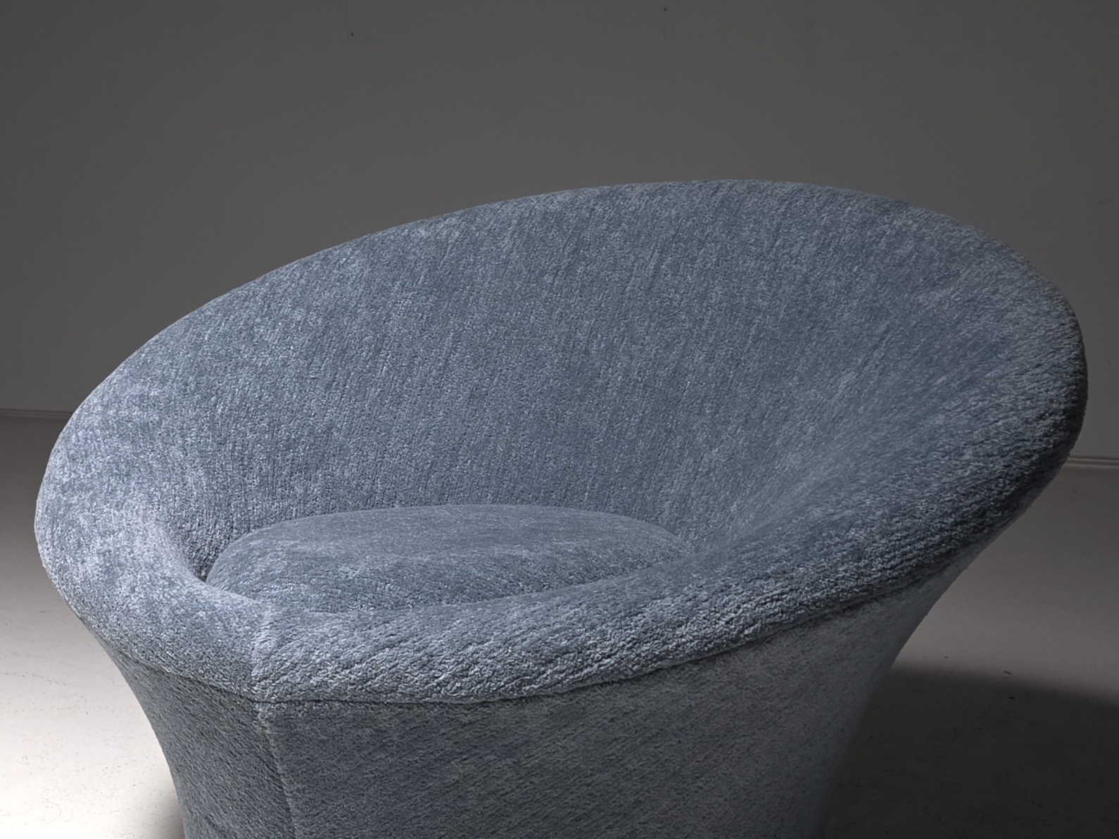A sculptural pair of Pierre Paulin’s iconic Mushroom lounge chairs for Artifort. These early-edition pieces feature the characteristic enveloping silhouette that made the model a mid-century design classic: a softly flared base rising in one continuous curve to form the back and arms, creating a deep, cocooning seat. Upholstered in a light blue Pierre Frey chenille, the chairs have a tactile, almost cloud-like surface that highlights their organic shape and adds a contemporary softness while respecting the original design.