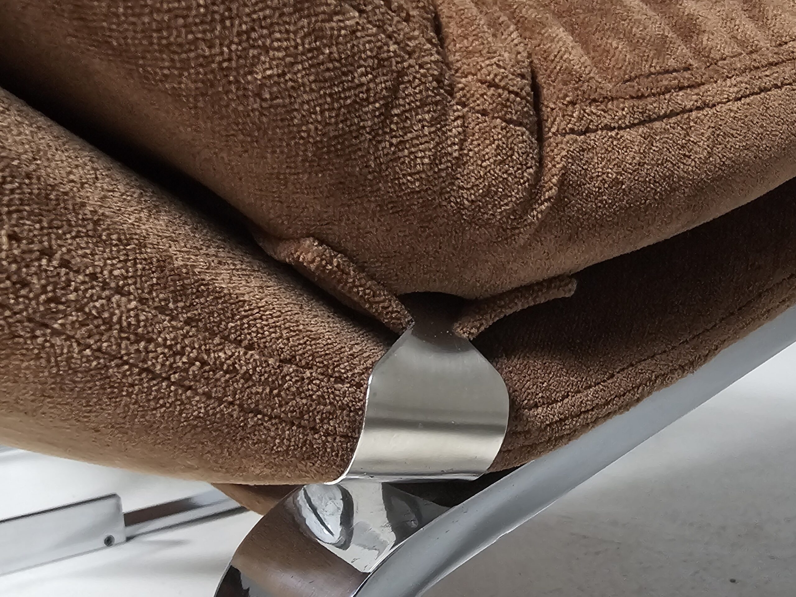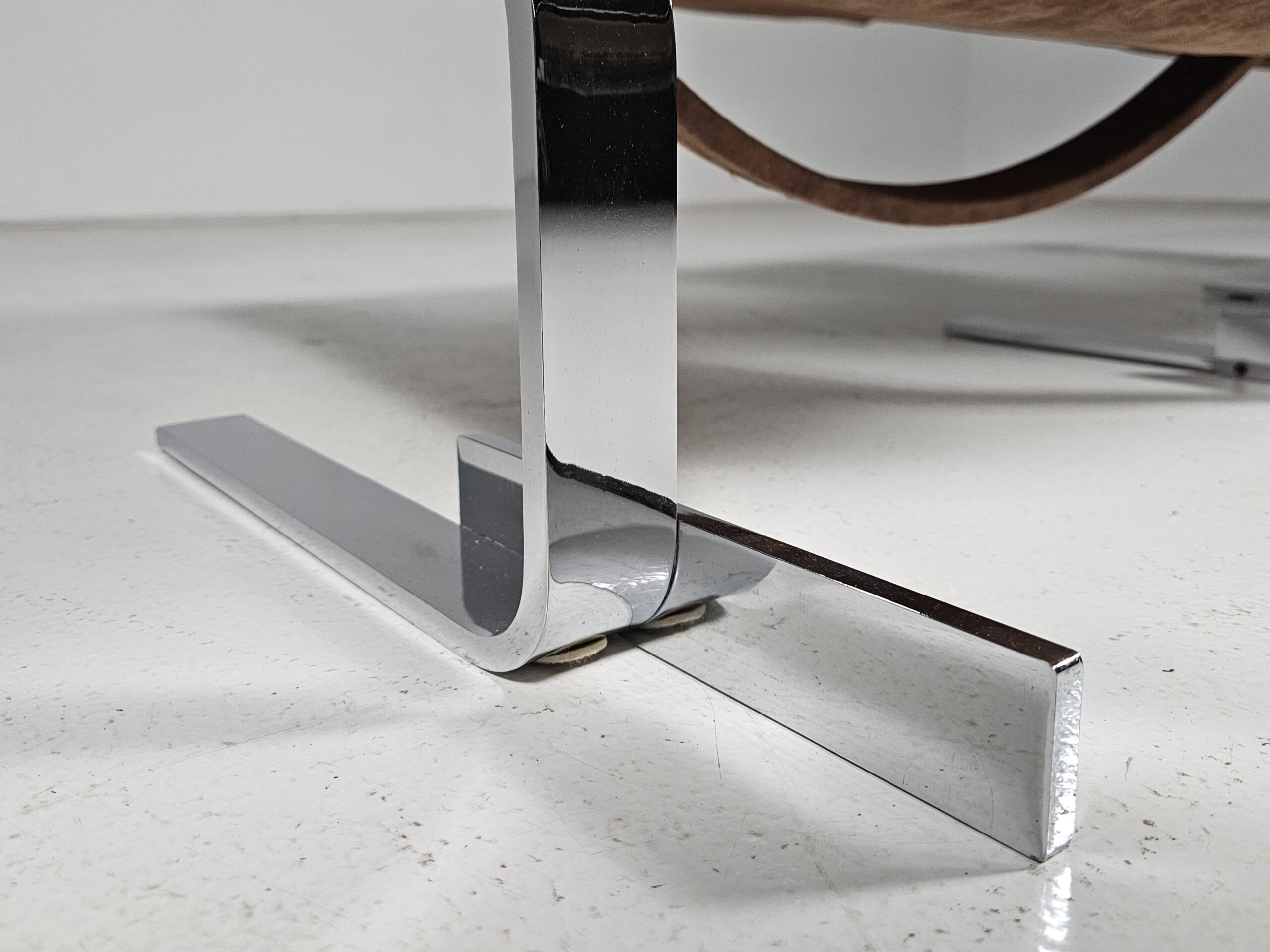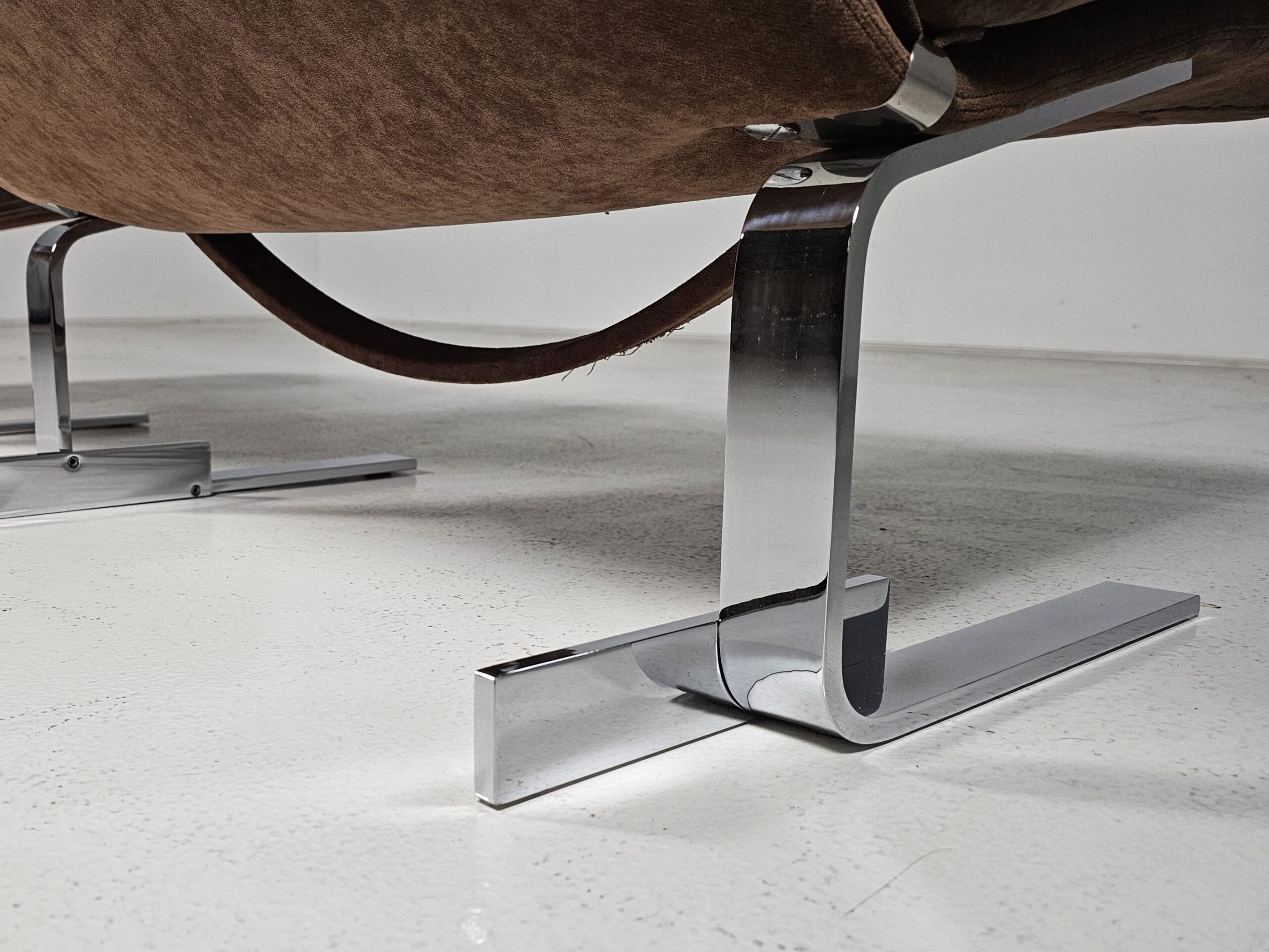 Supported by a polished chrome frame, the seat seems to float effortlessly, creating a striking visual tension between structure and comfort. The original brown upholstery is in amazing condition. Almost like never used.