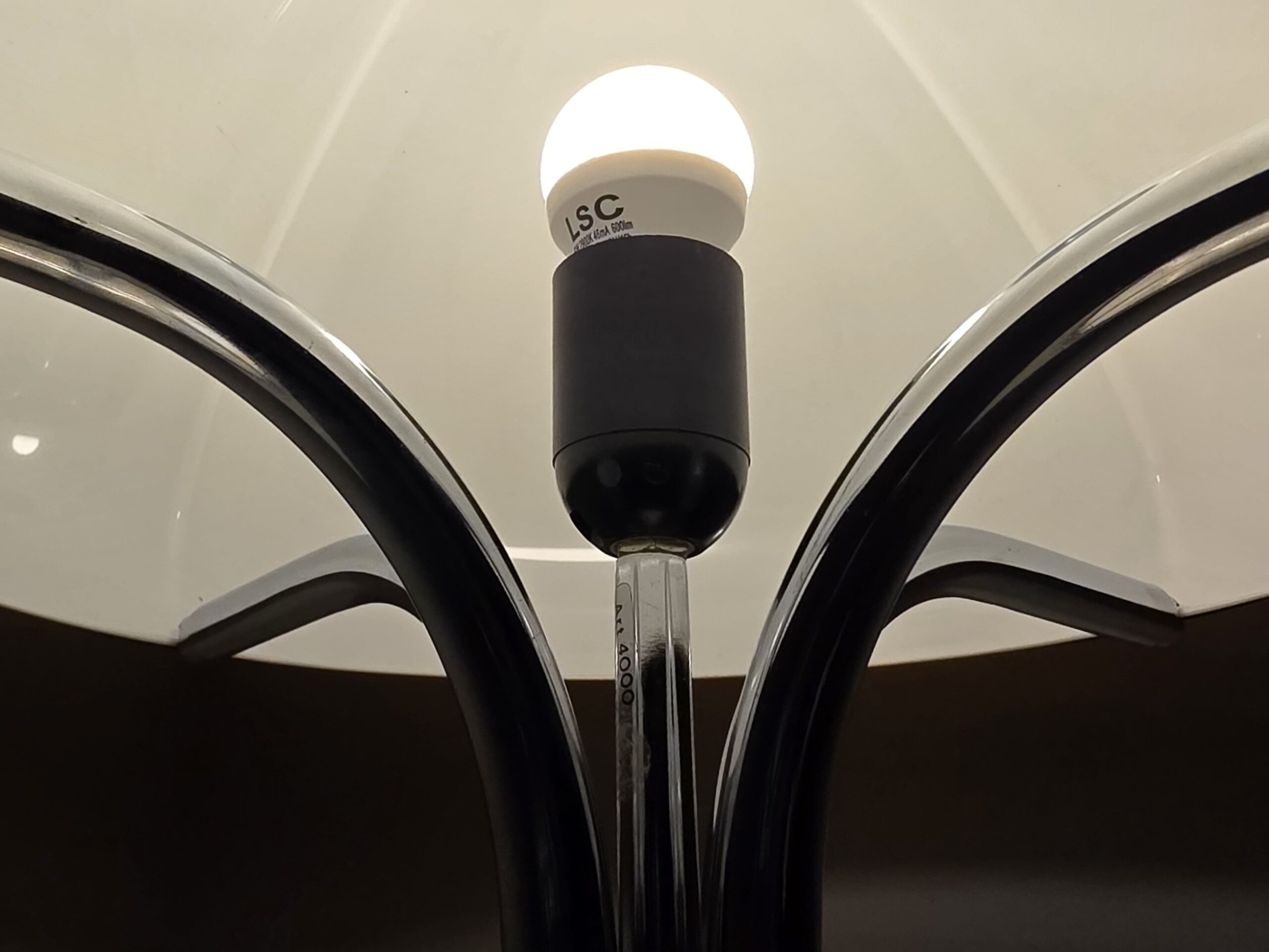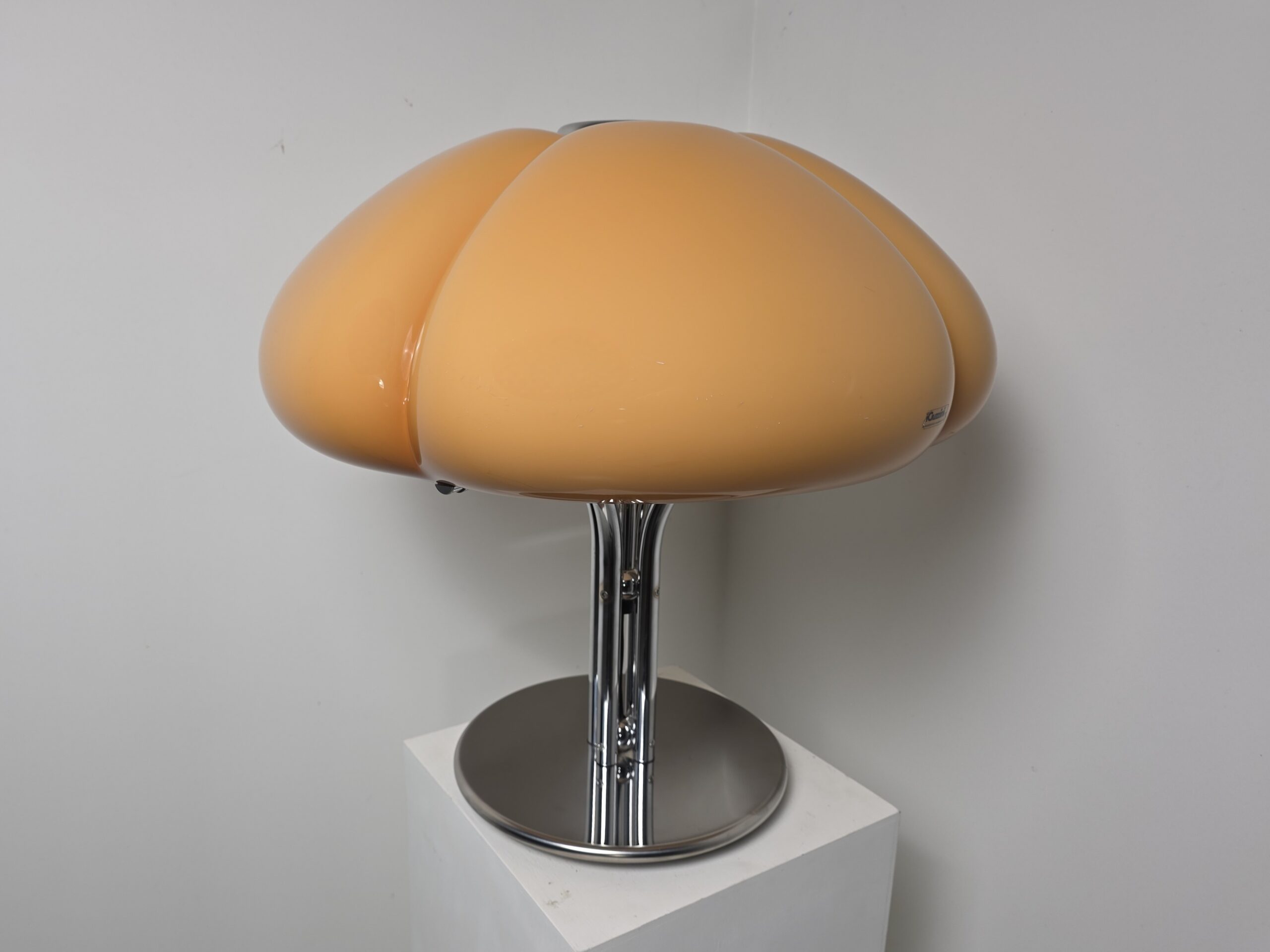 A stunning and very rare color vintage table Lamp designed by Gae Aulenti, and made by Harvey Guzzini in Italy. This model is called the ‘Quadrifoglio’ lamp. It has a lovely curvy nude/peach-pink acrylic shade and a chrome base. The Quadrifoglio Lamp embodies Gae Aulenti’s signature vision: blending architecture, art, and function into harmonious form. Created during Italy’s golden age of design, it reflects Aulenti’s fascination with light as a spatial material — something that shapes mood, emotion, and atmosphere. It is in good working order.