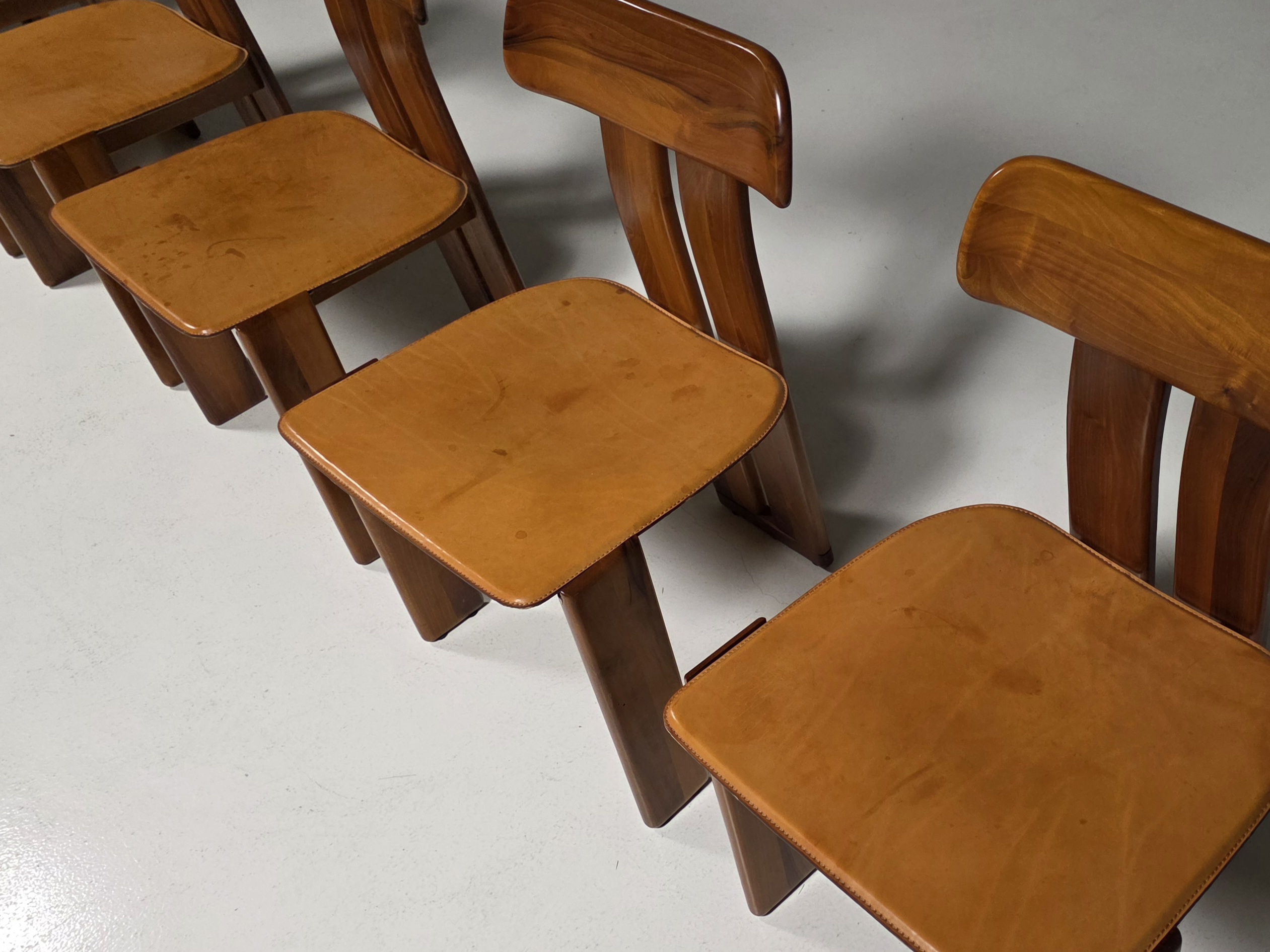 The seats are upholstered in original leather, showing a beautiful cognac / warm tan color that has developed a natural patina over time. This aging enhances the character of the chairs and reflects their authenticity.