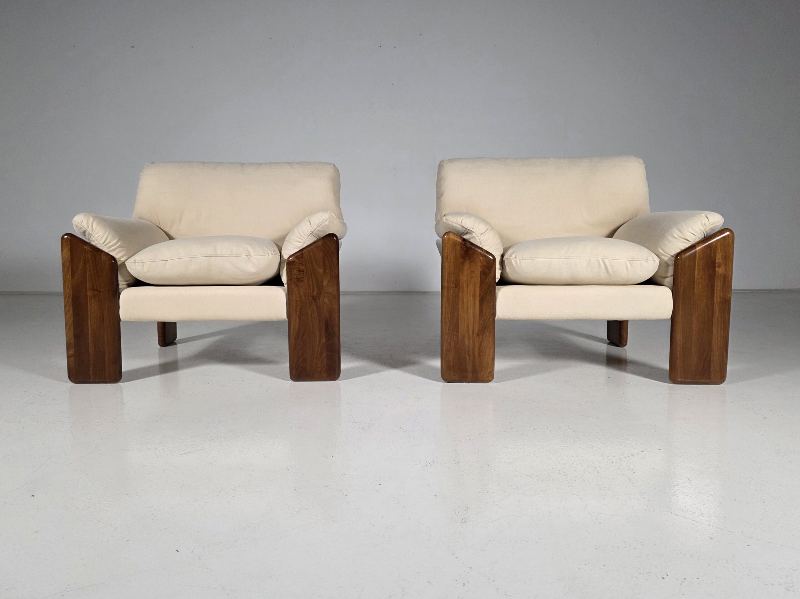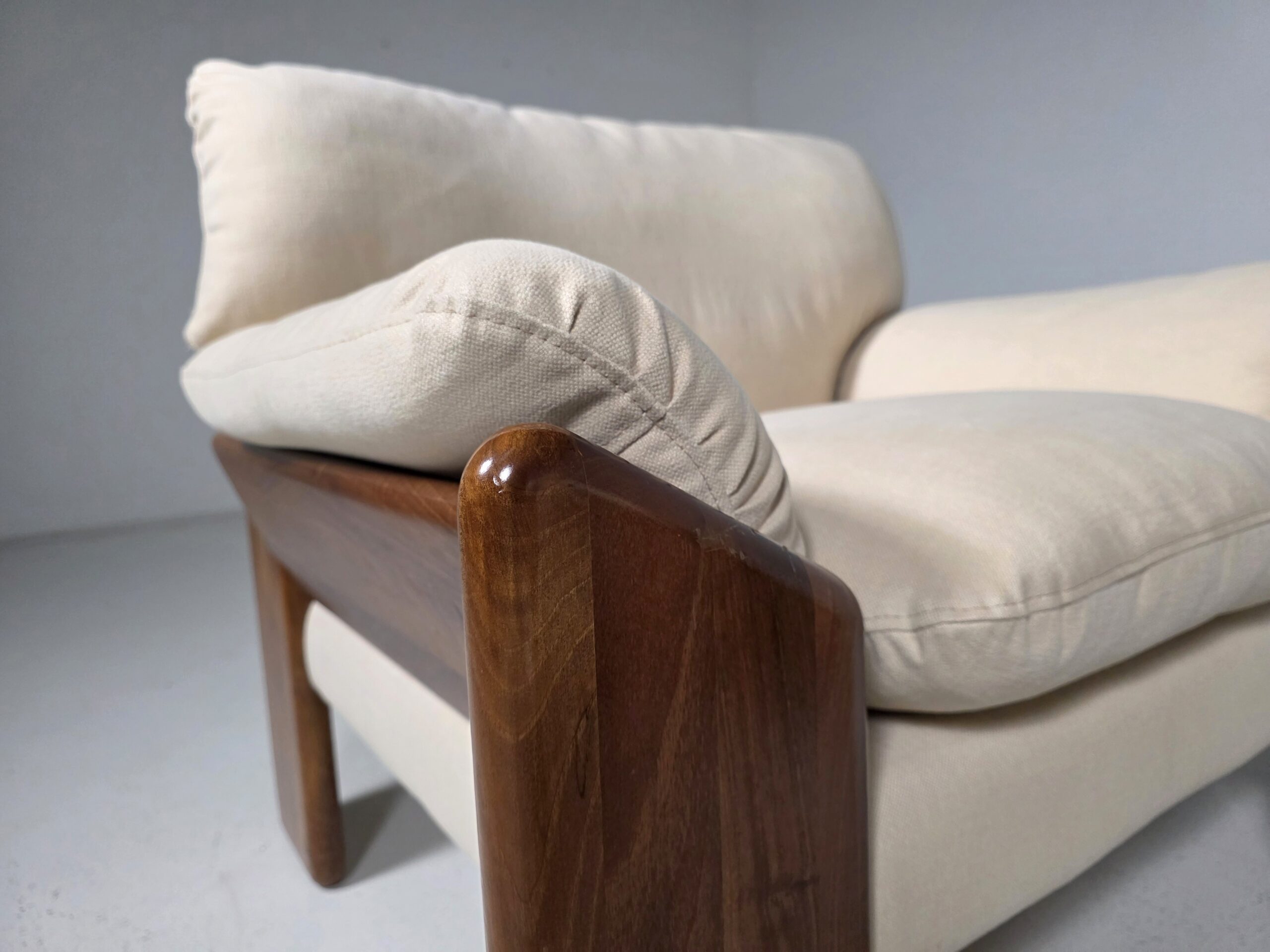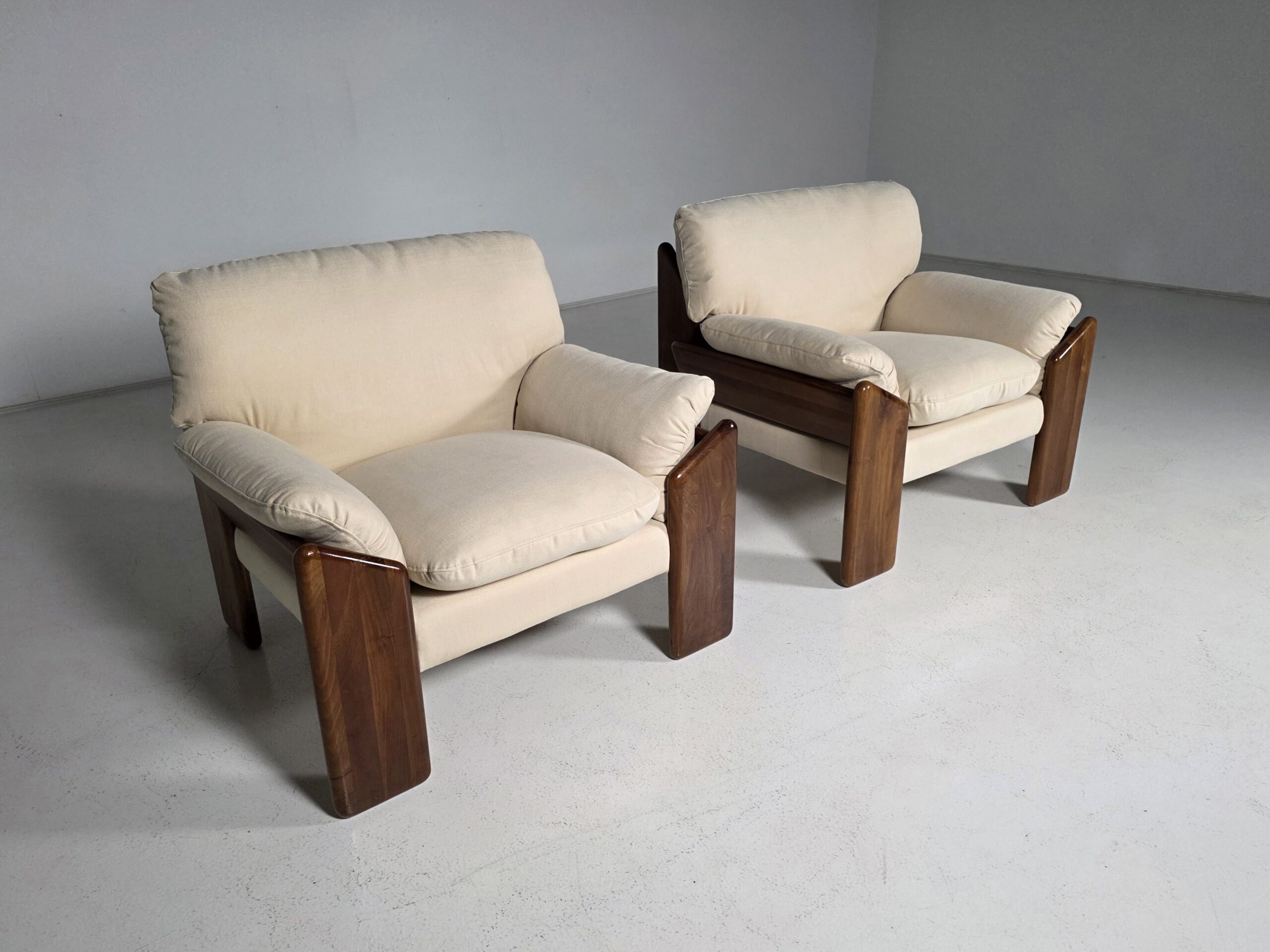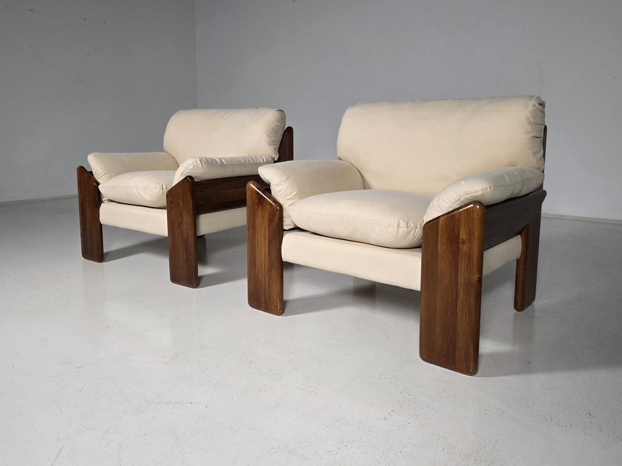 This pair of Sapporo lounge chairs represents the distinctive elegance of Italian designer Mario Marenco. Produced by Mobil Girgi, the chairs showcase Marenco’s signature balance of organic forms and relaxed comfort. The solid nutwood frames bring warmth and sculptural presence, with smooth, rounded lines that highlight the natural beauty of the wood. Newly upholstered linen cushions add a fresh, modern softness while preserving the original inviting character of the design. Generous proportions and deep seating make these chairs as comfortable as they are visually striking. A refined example of 1970s Italian craftsmanship, perfectly suited for contemporary interiors seeking authentic vintage sophistication.