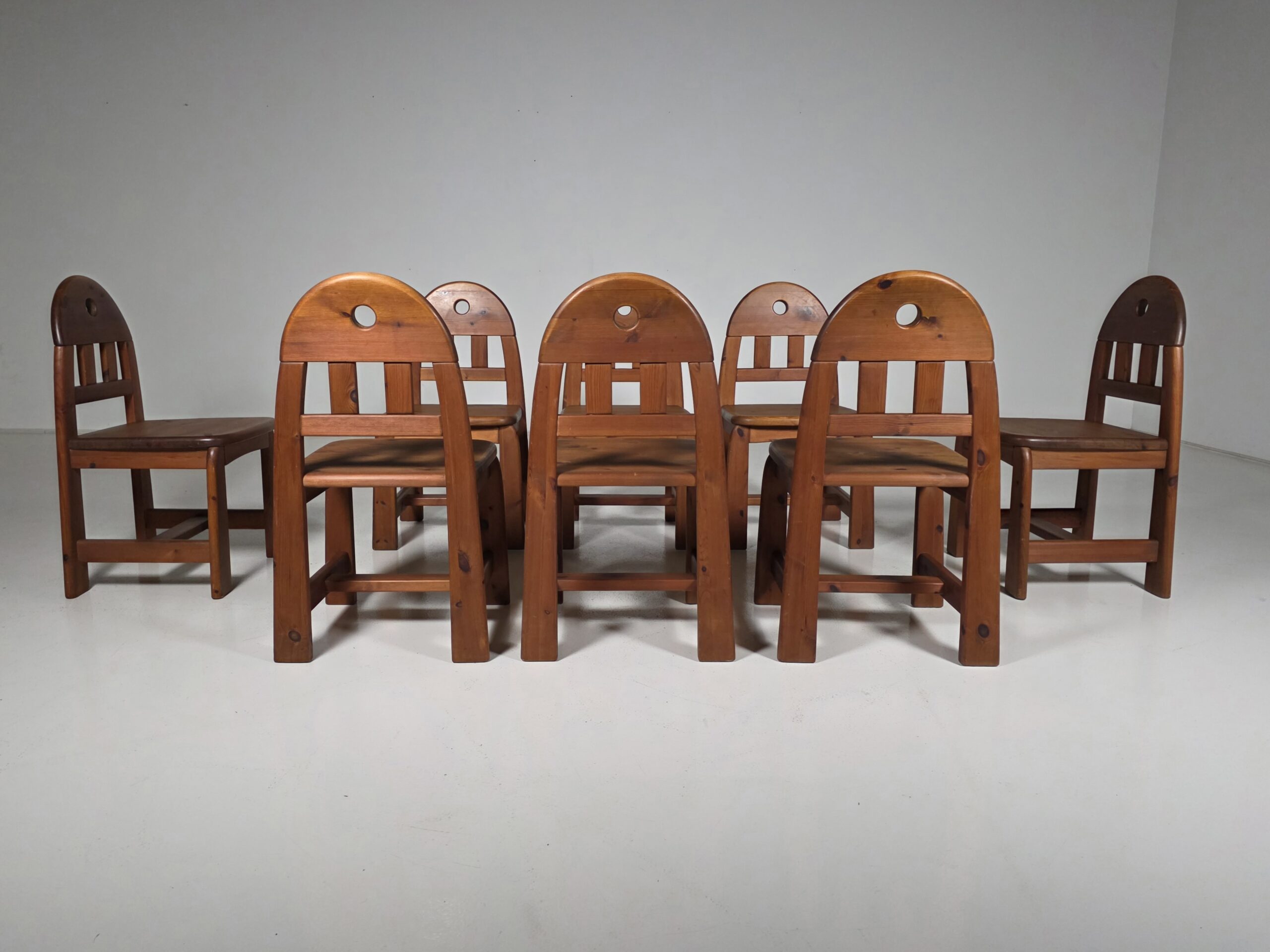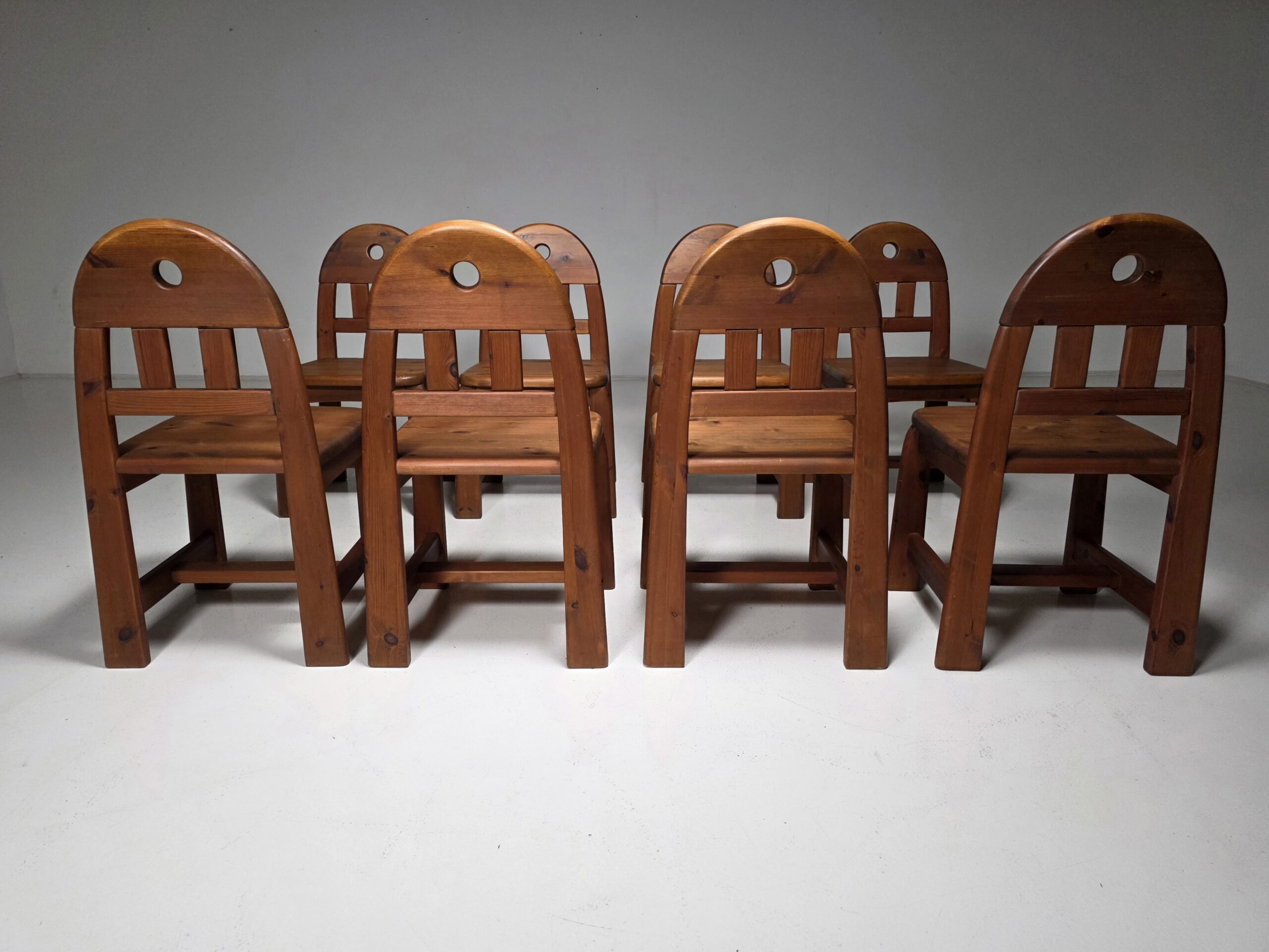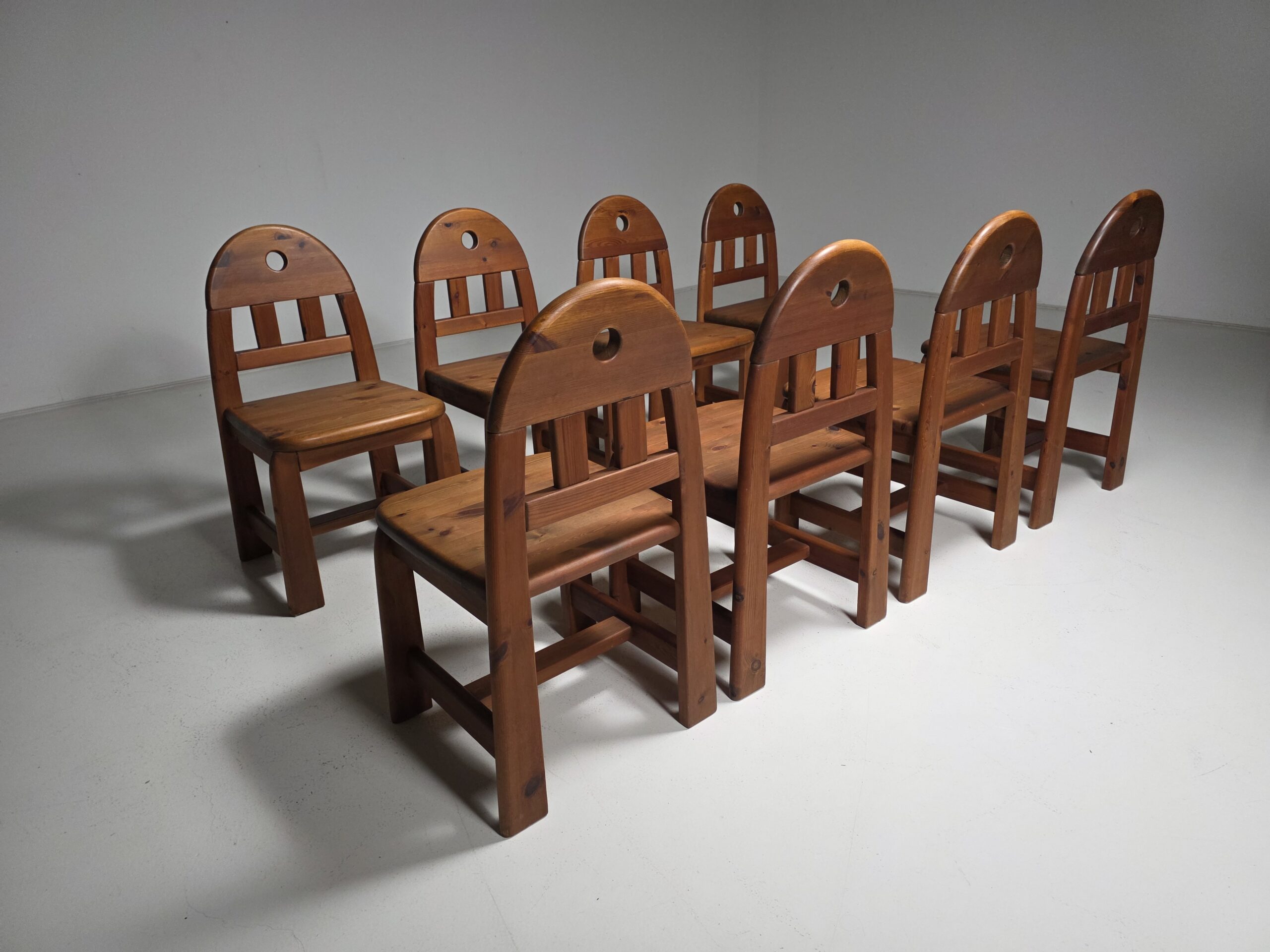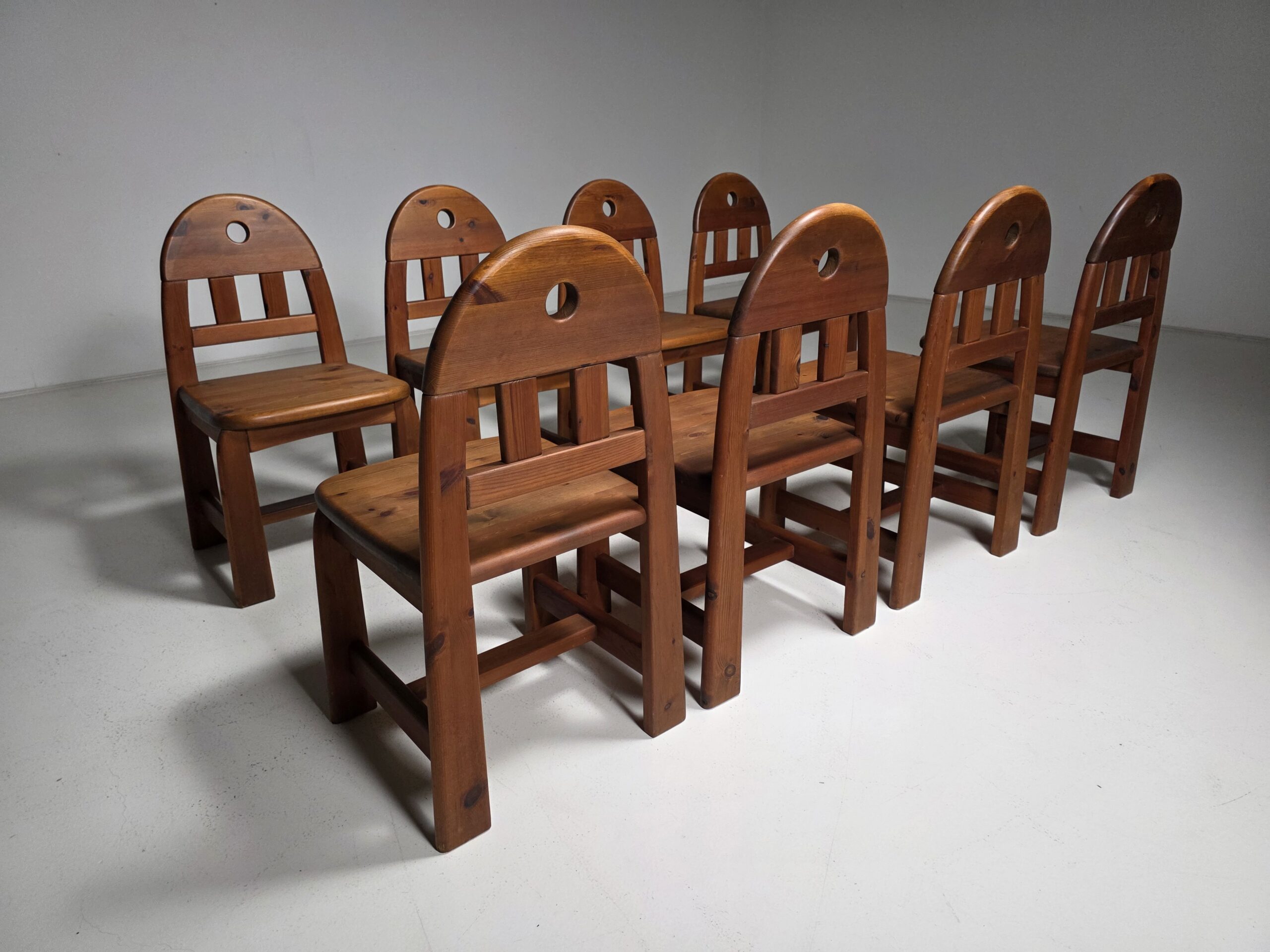 Set of 8 brutalist solid pinewood dining chairs by Wasa Mobel from the 1970s. Bulky chairs with amazing seating comfort because of the slightly curved top of the backrest.