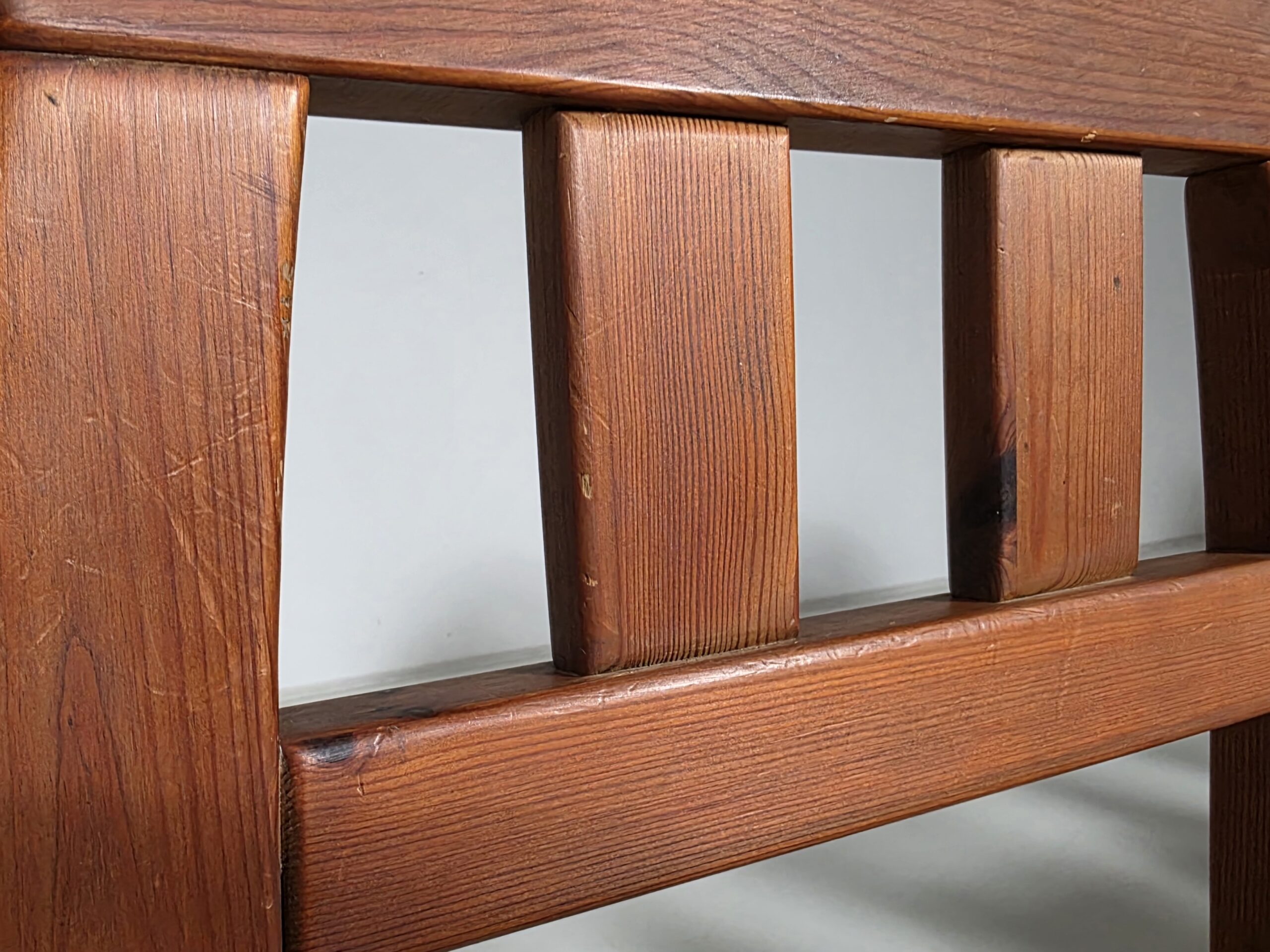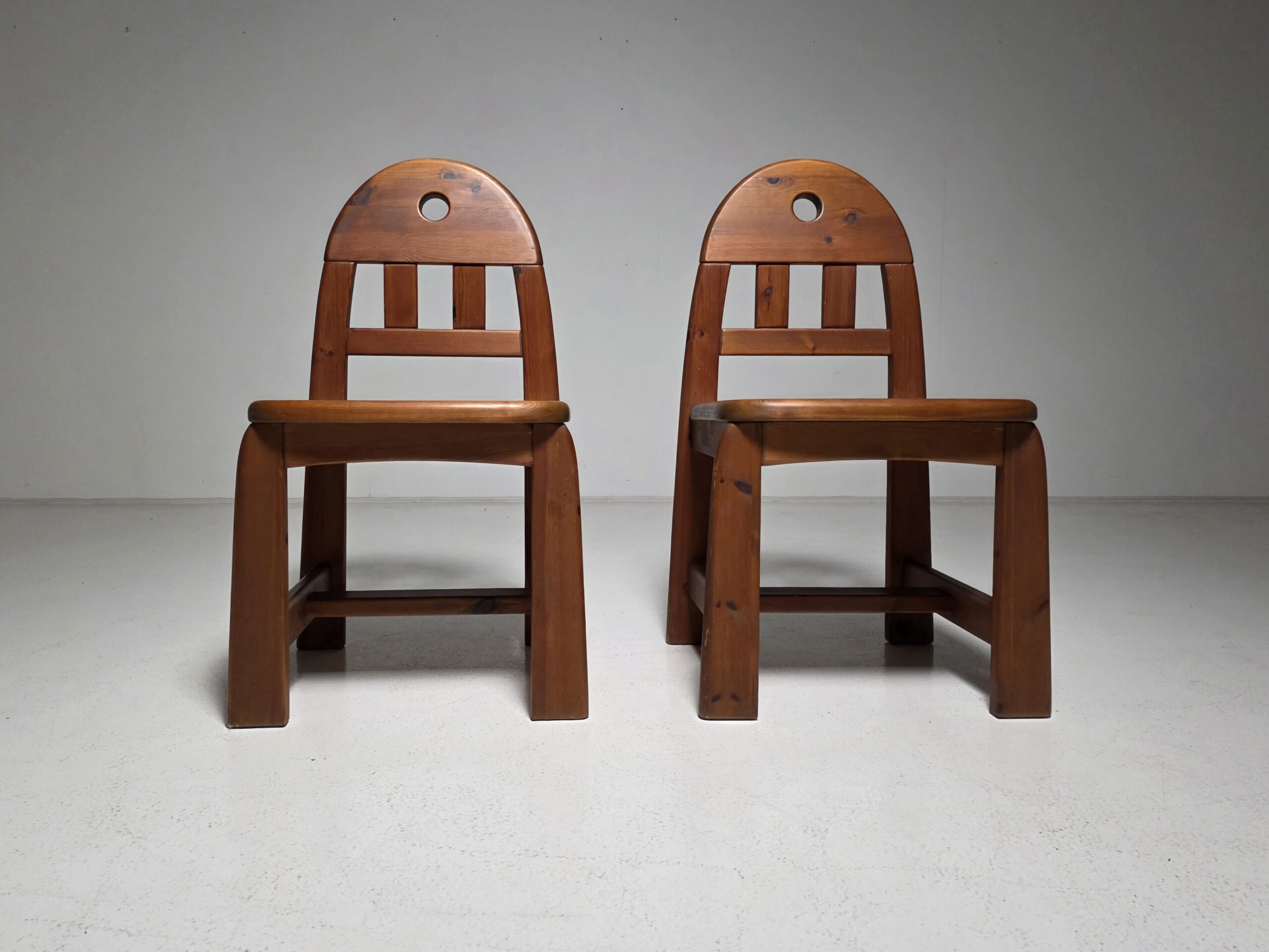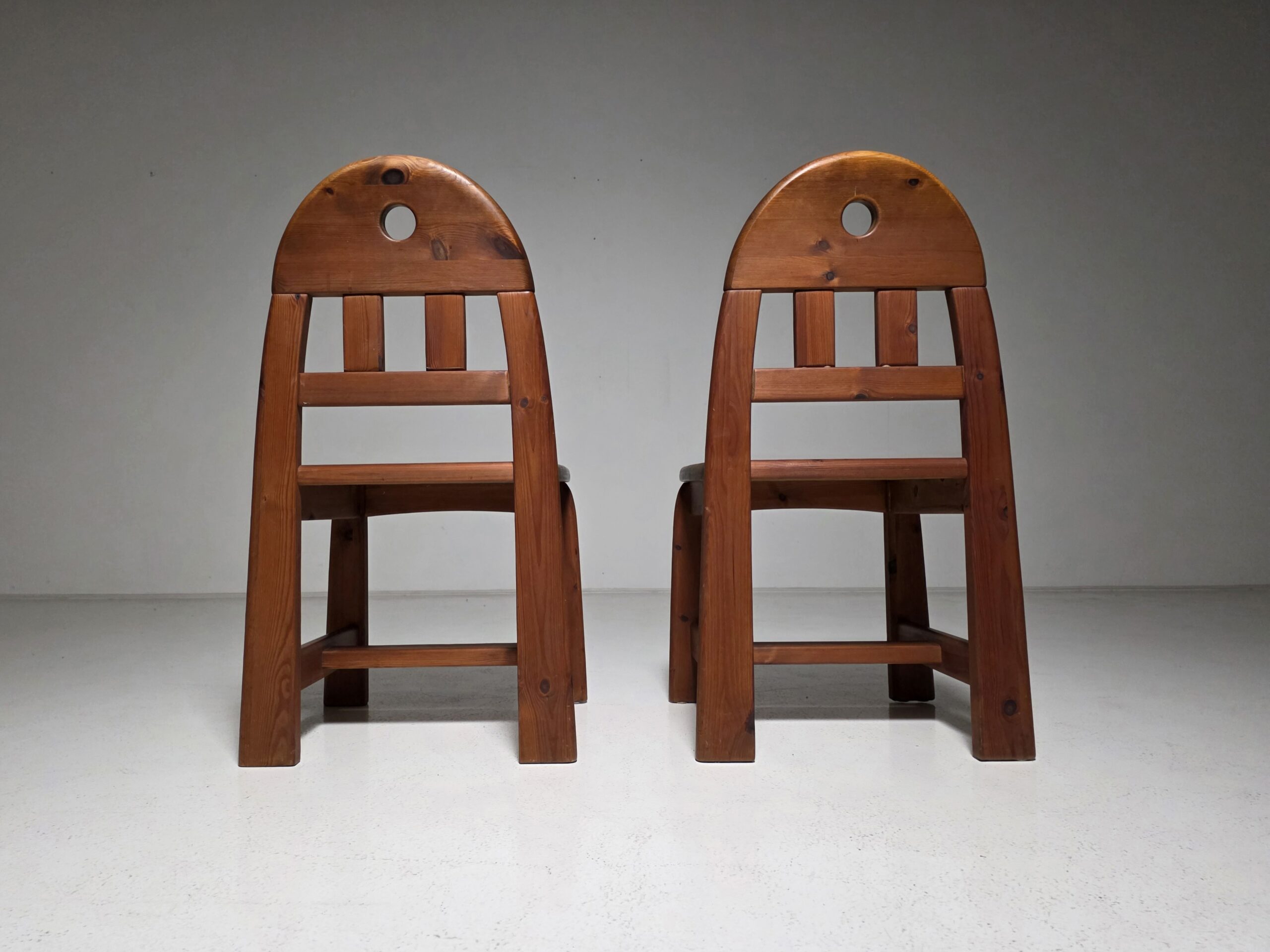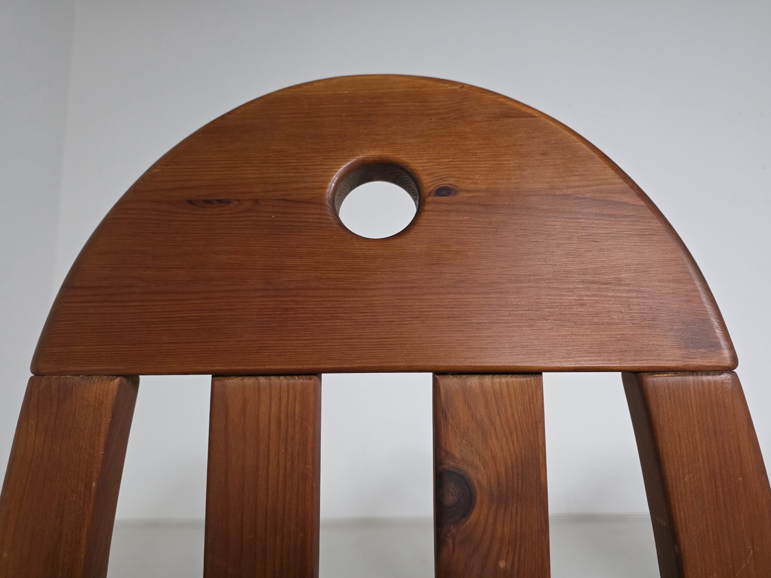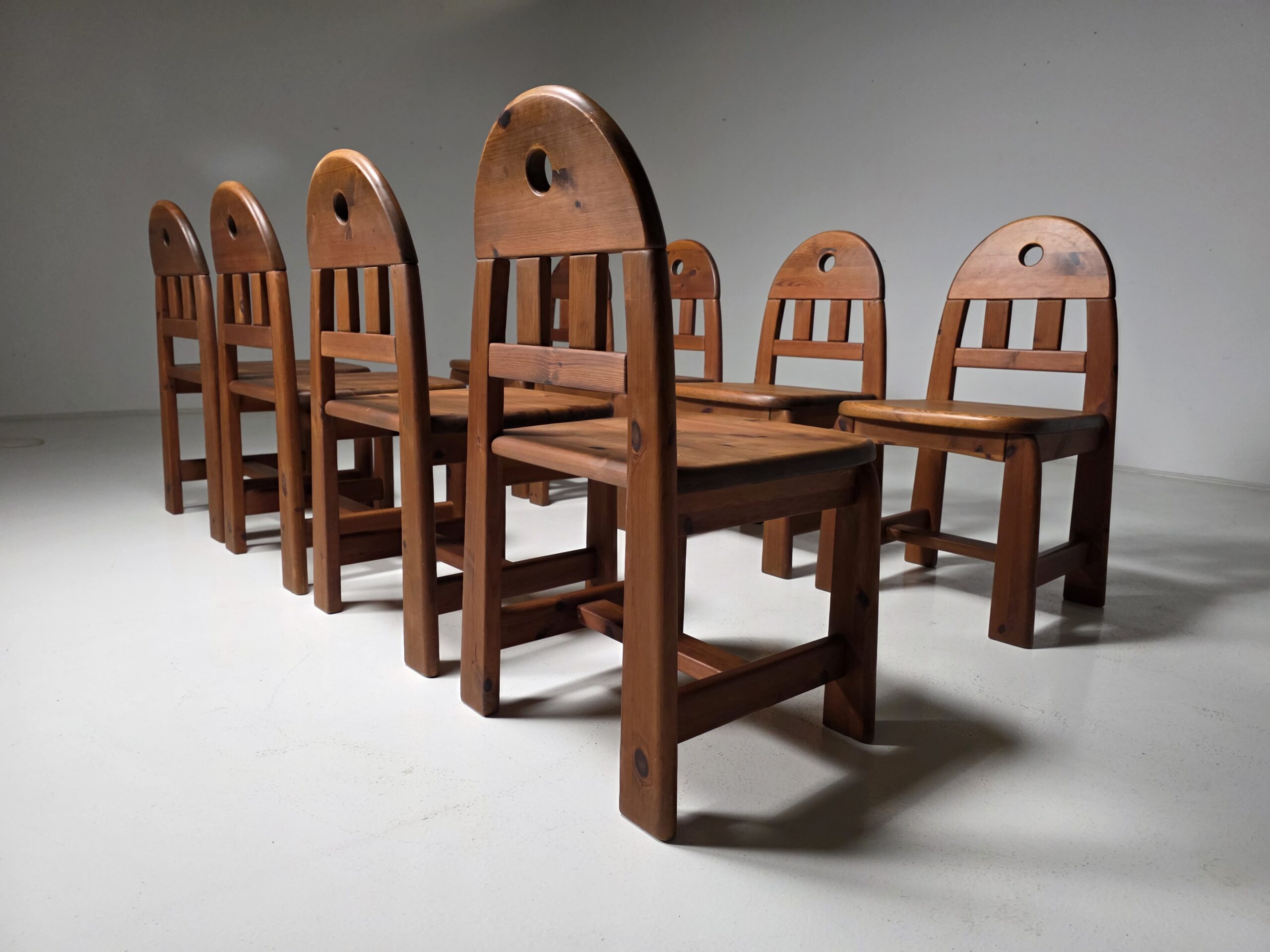Set of 8 brutalist solid pinewood dining chairs by Wasa Mobel from the 1970s. Bulky chairs with amazing seating comfort because of the slightly curved top of the backrest.