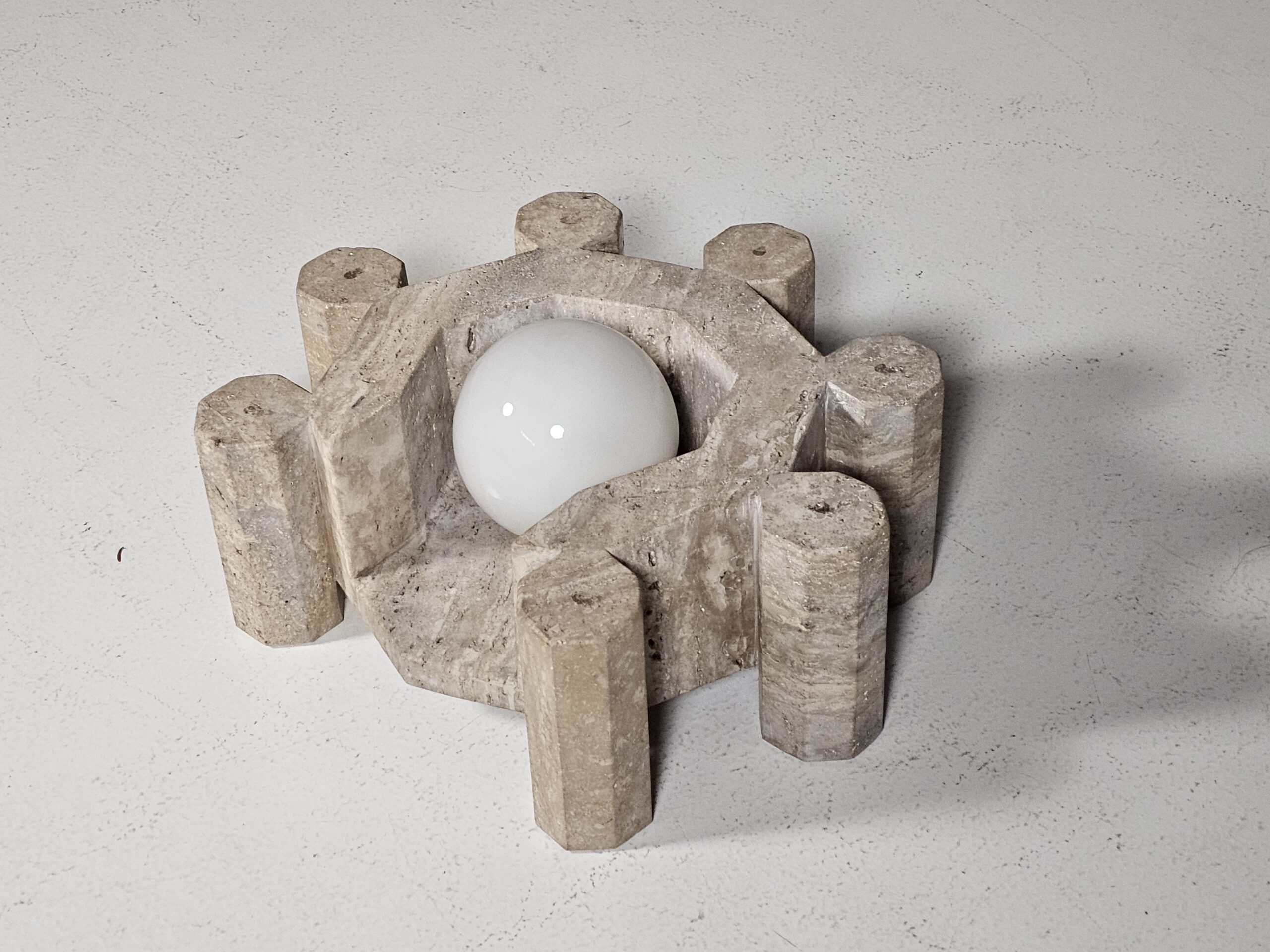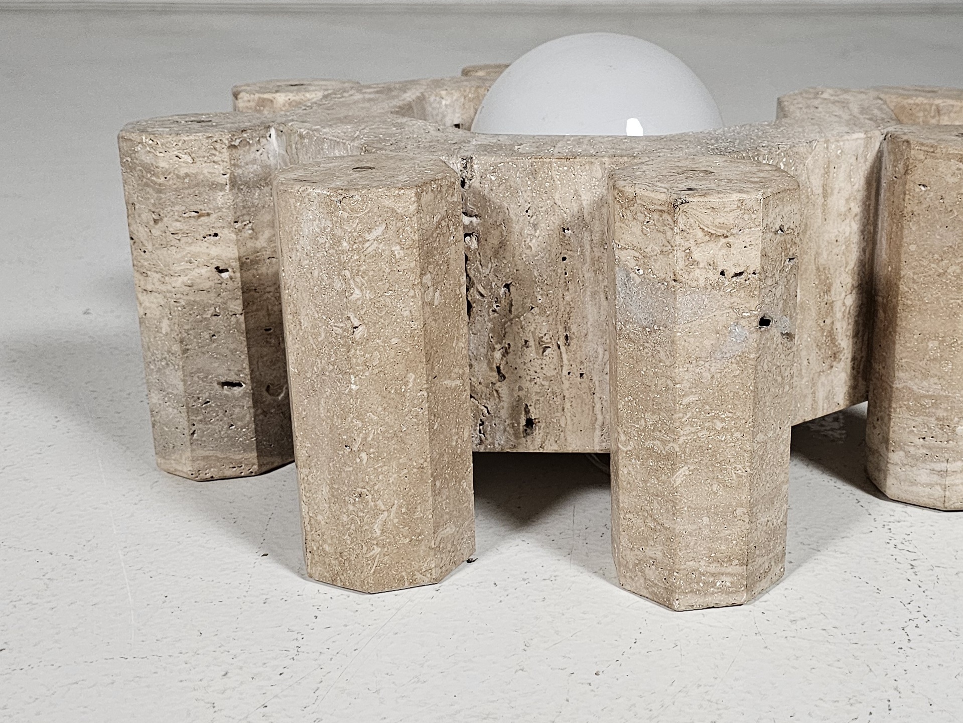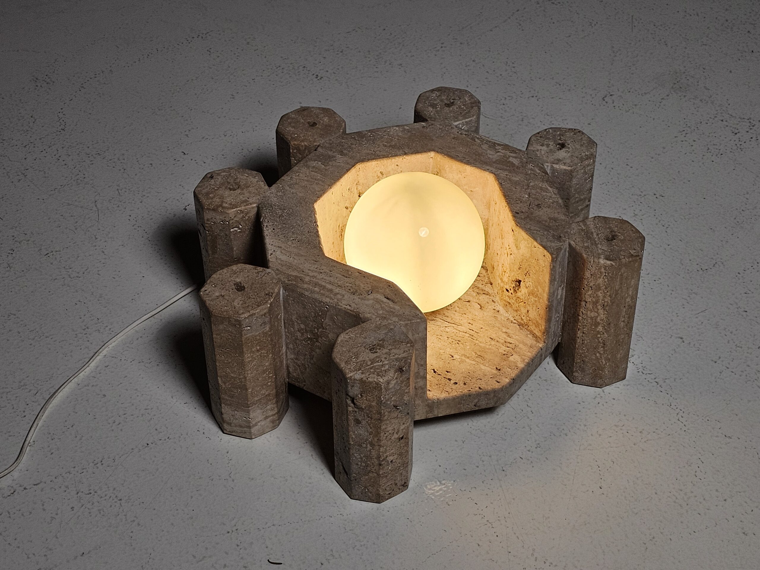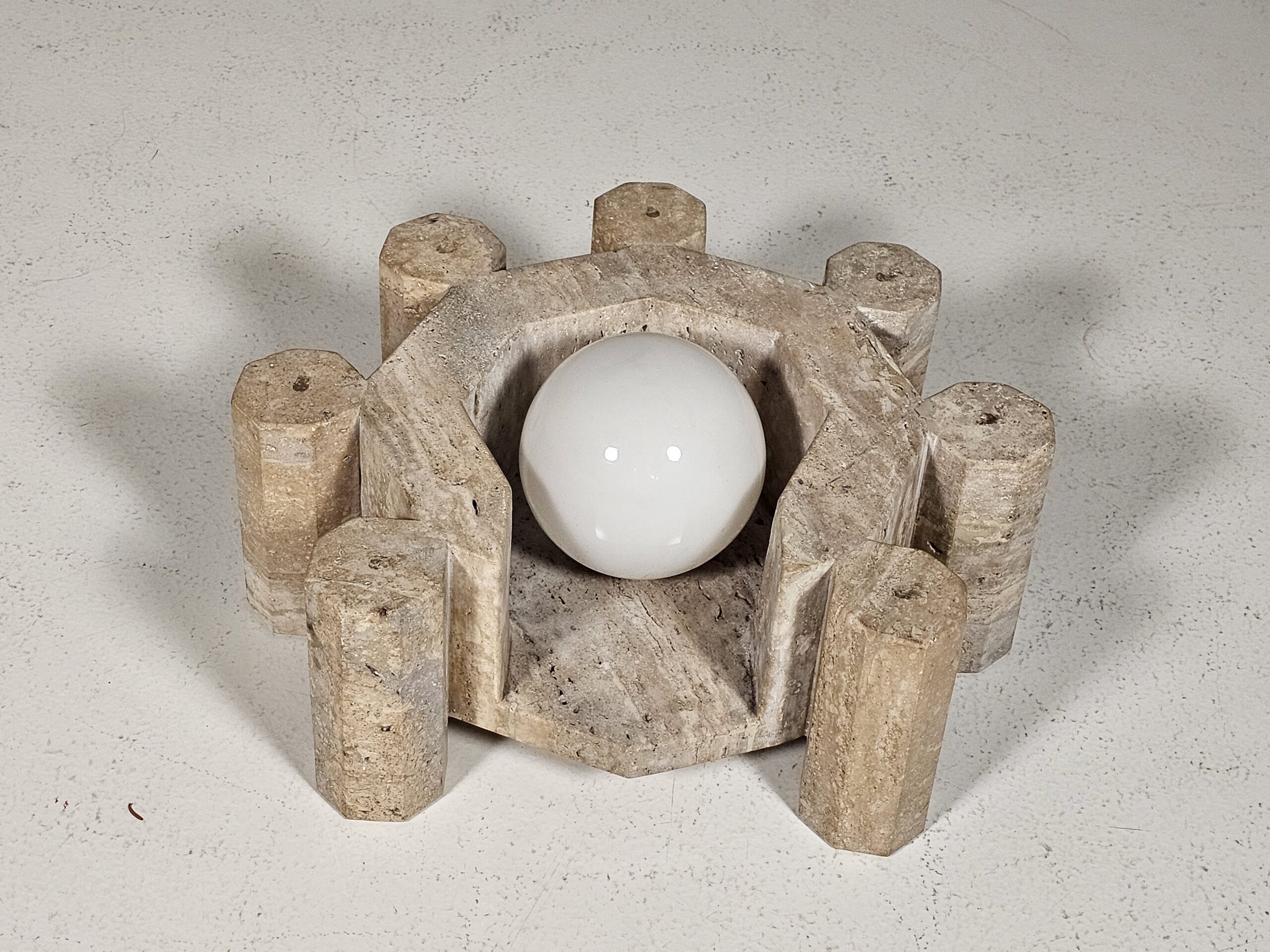 Unique vintage travertine table lamp, a one-of-a-kind piece that blends sculptural form with timeless elegance. Hand-carved from natural travertine, its bold geometric design showcases the raw beauty of stone. Soft earth tones, subtle veining, and natural imperfections. The warm textures of travertine are complemented by a smooth white glass globe, creating a harmonious balance between raw material and refined form. Unlike contemporary reproductions, this lamp carries the charm of age, with subtle patina and natural variations that make it truly unique. Its architectural presence transforms any room into a gallery-like setting, where design meets art