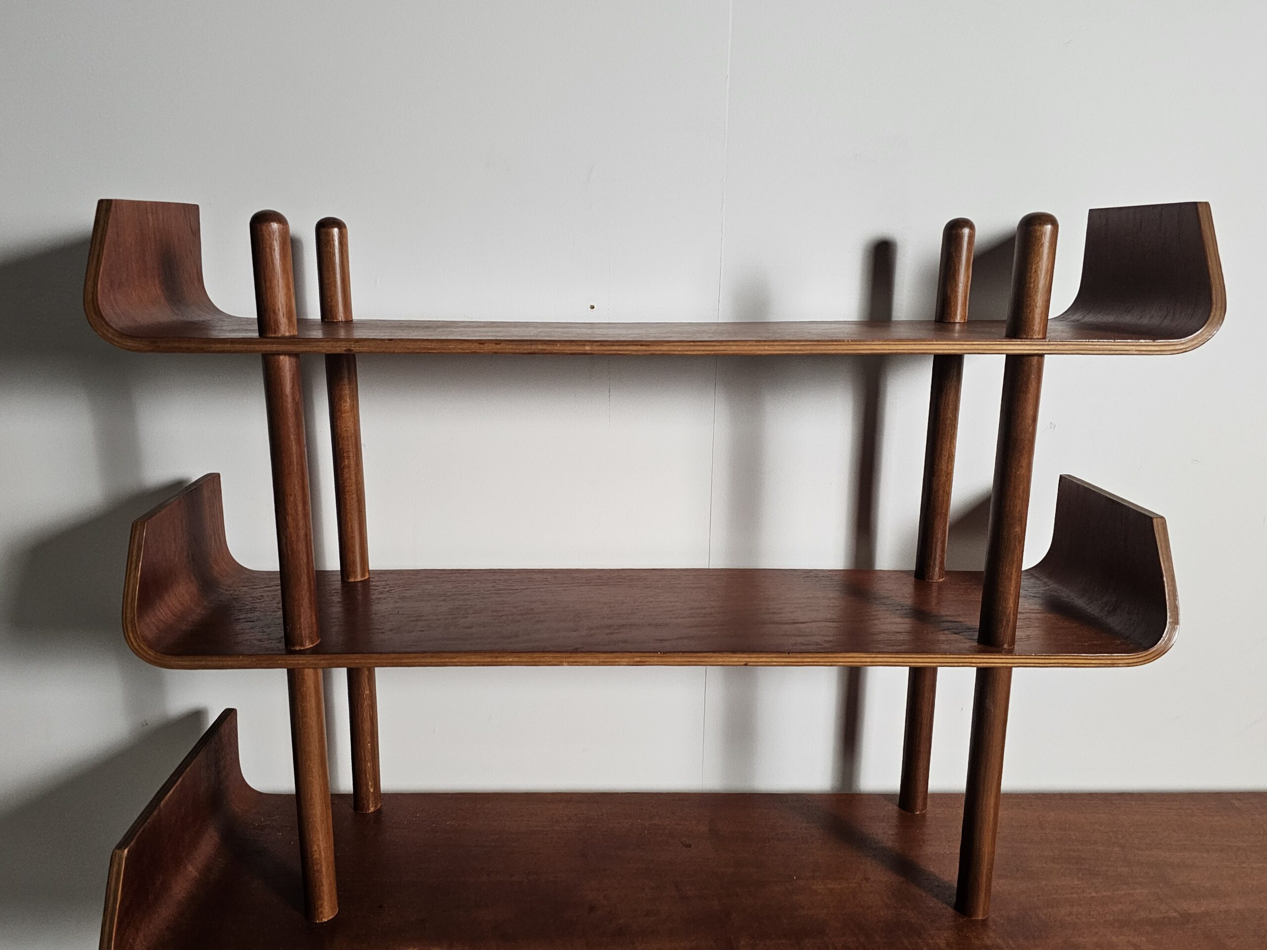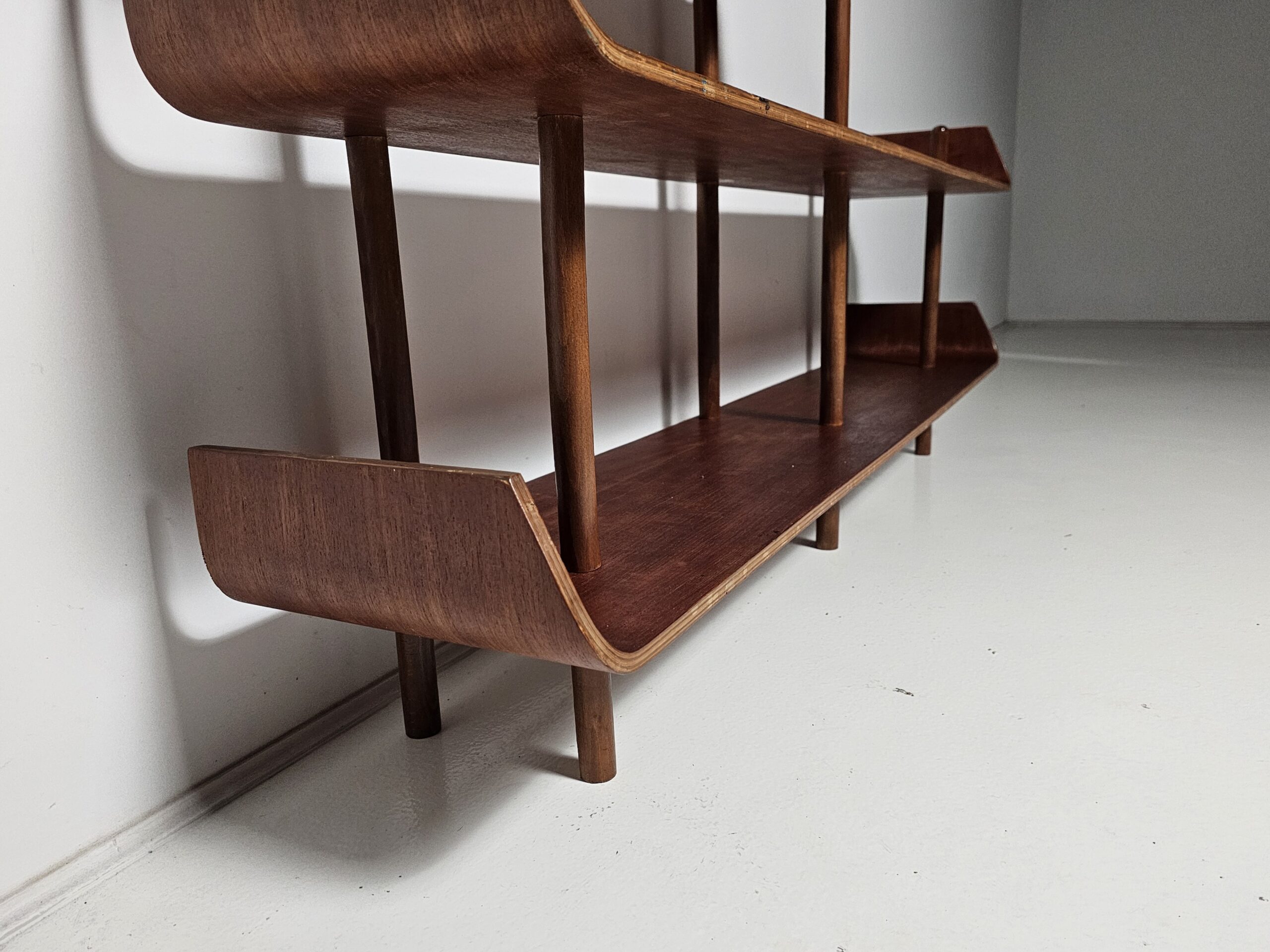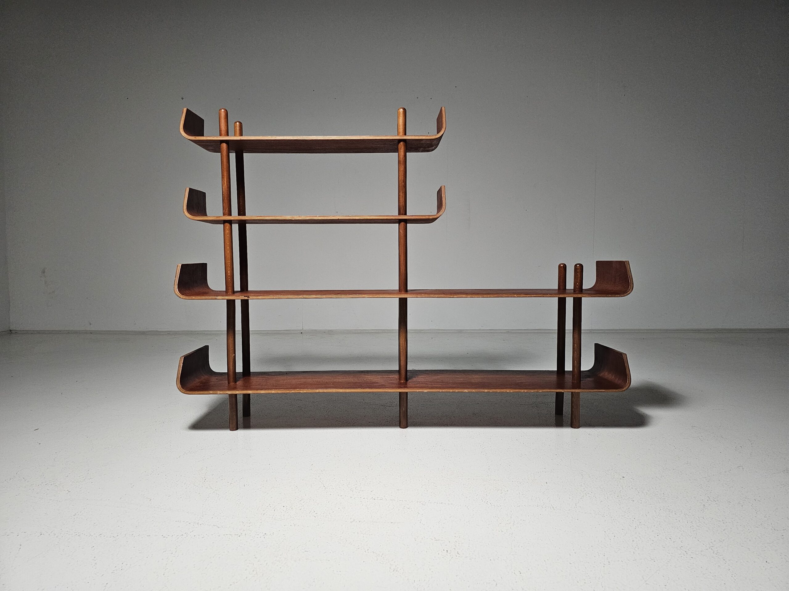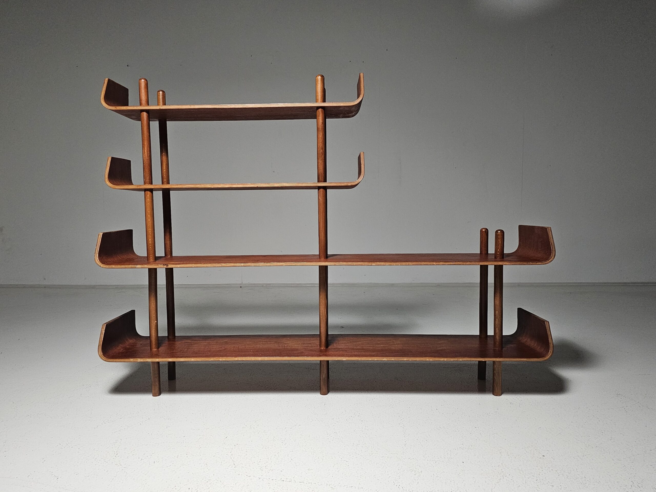 A refined example of Dutch mid-century modern design, this modular bookcase was designed by Willem Lutjens and manufactured by Gouda Den Boer in the 1950s. Lutjens is renowned for his elegant use of bent plywood and his dedication to functional simplicity. This shelving system perfectly illustrates his approach — featuring gently curved ends, interlocking vertical supports, and a balanced, architectural composition that feels both light and sculptural. Crafted from teak veneer plywood, the bookcase combines warmth and precision craftsmanship. Its timeless silhouette makes it ideal for displaying books, ceramics, or decorative objects in a refined modern interior.