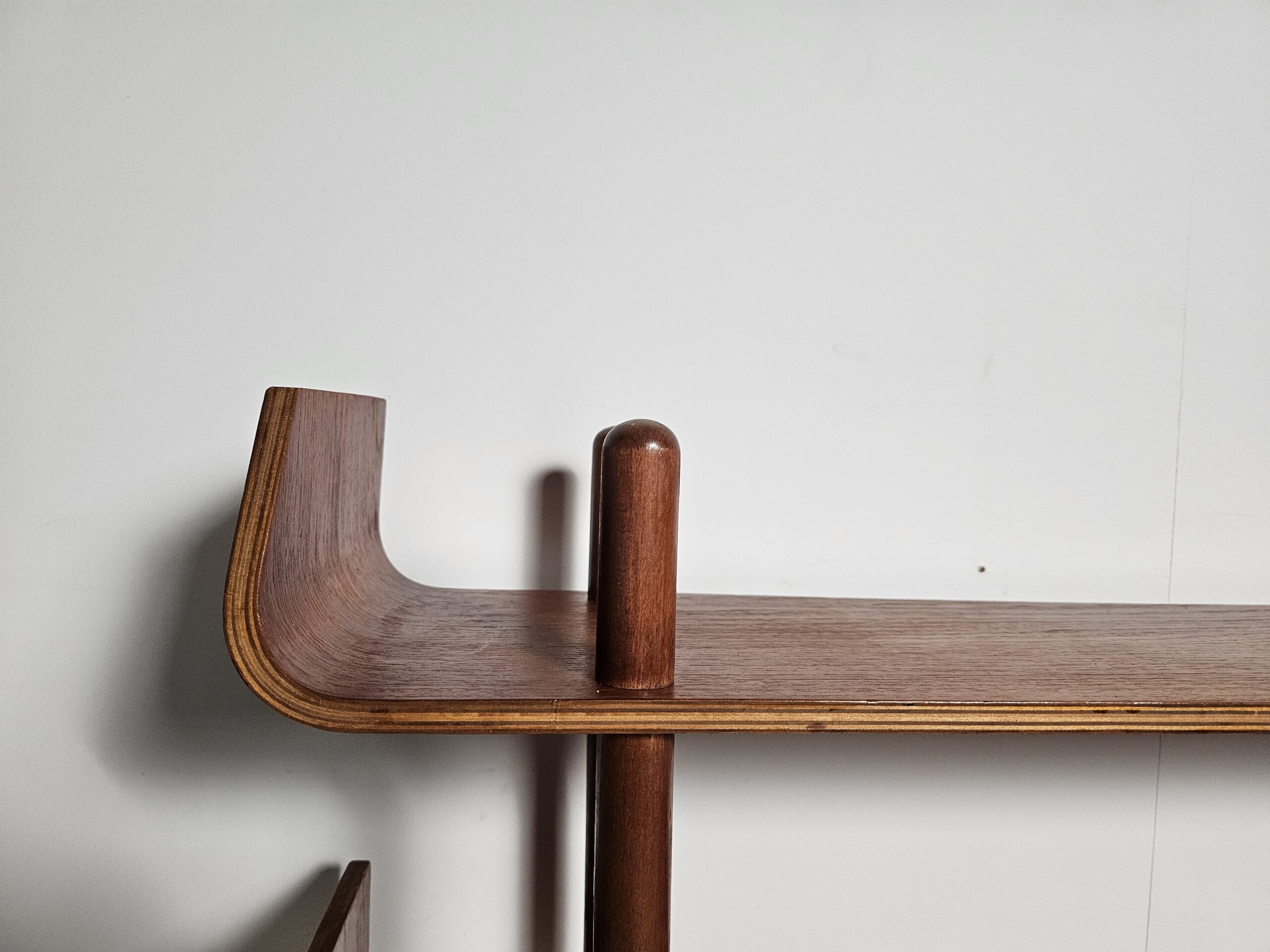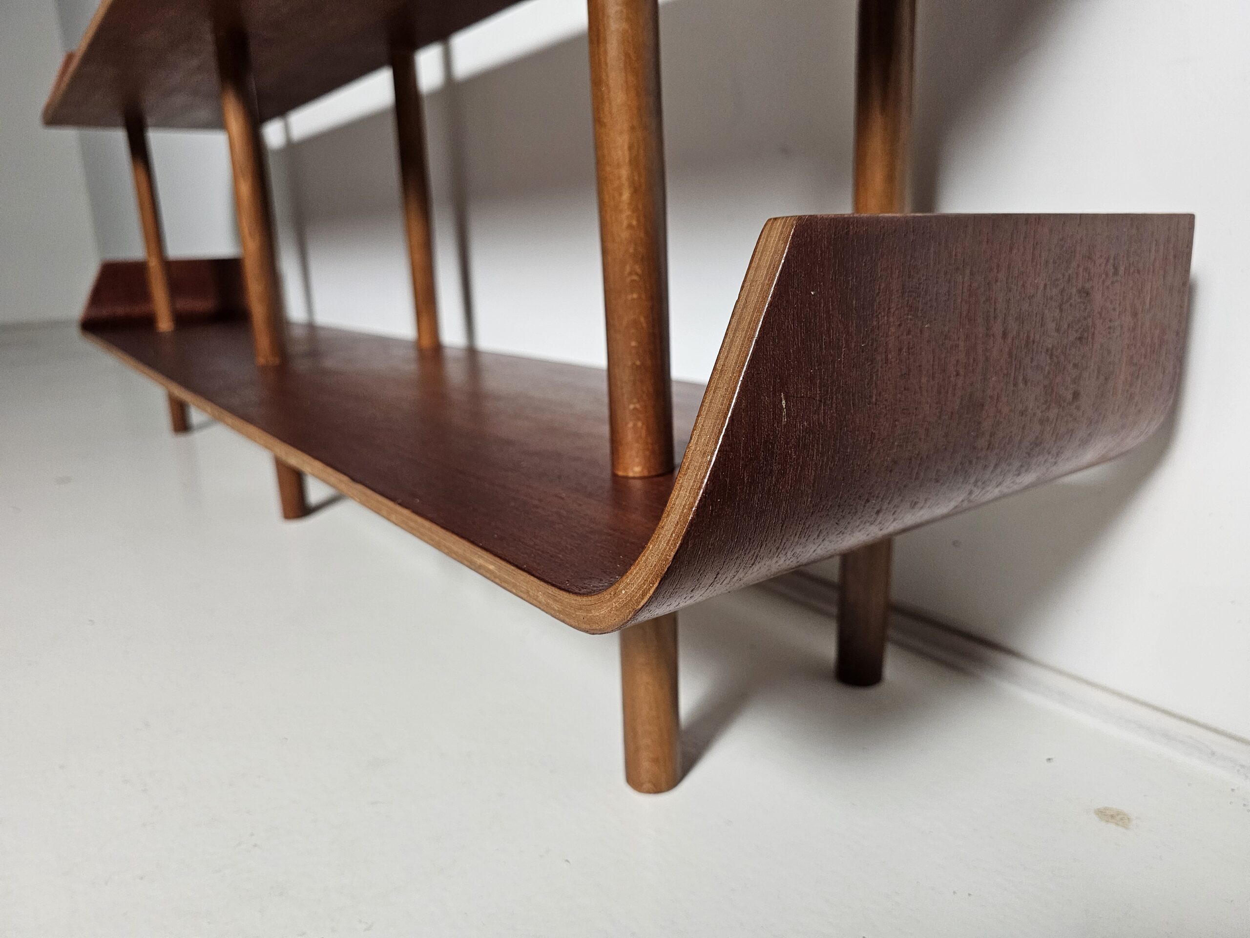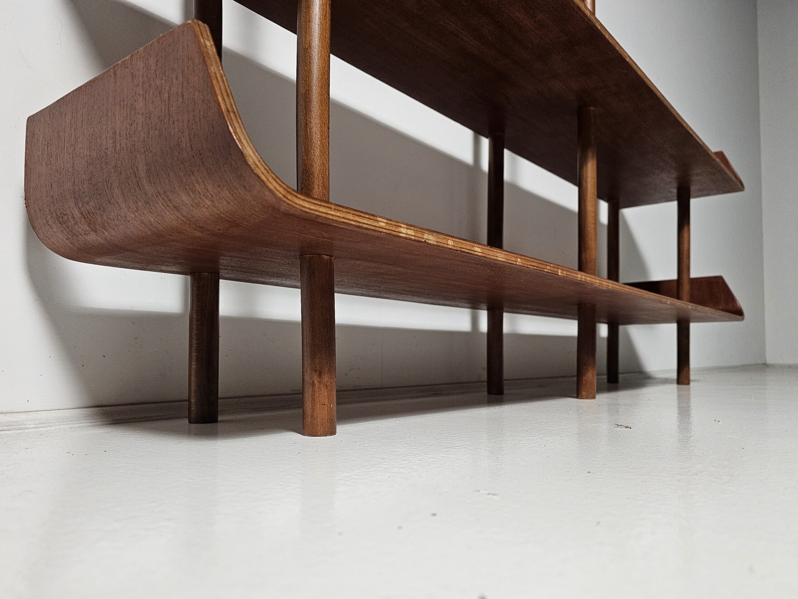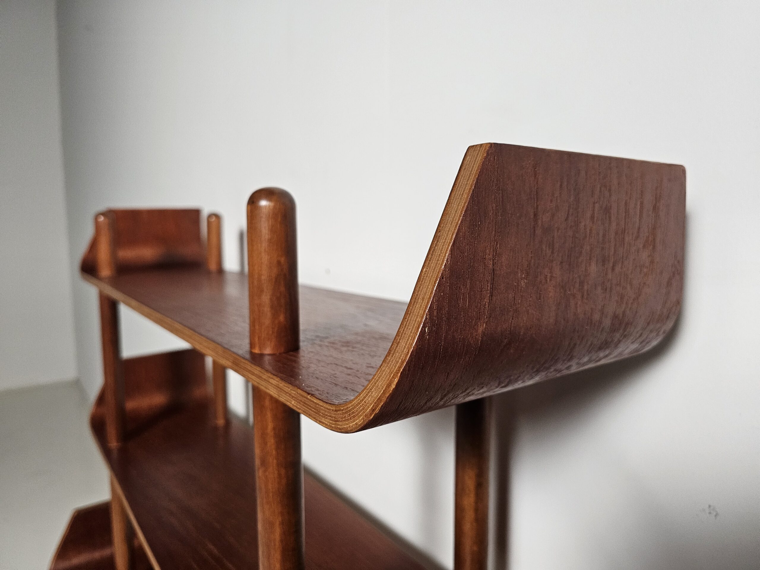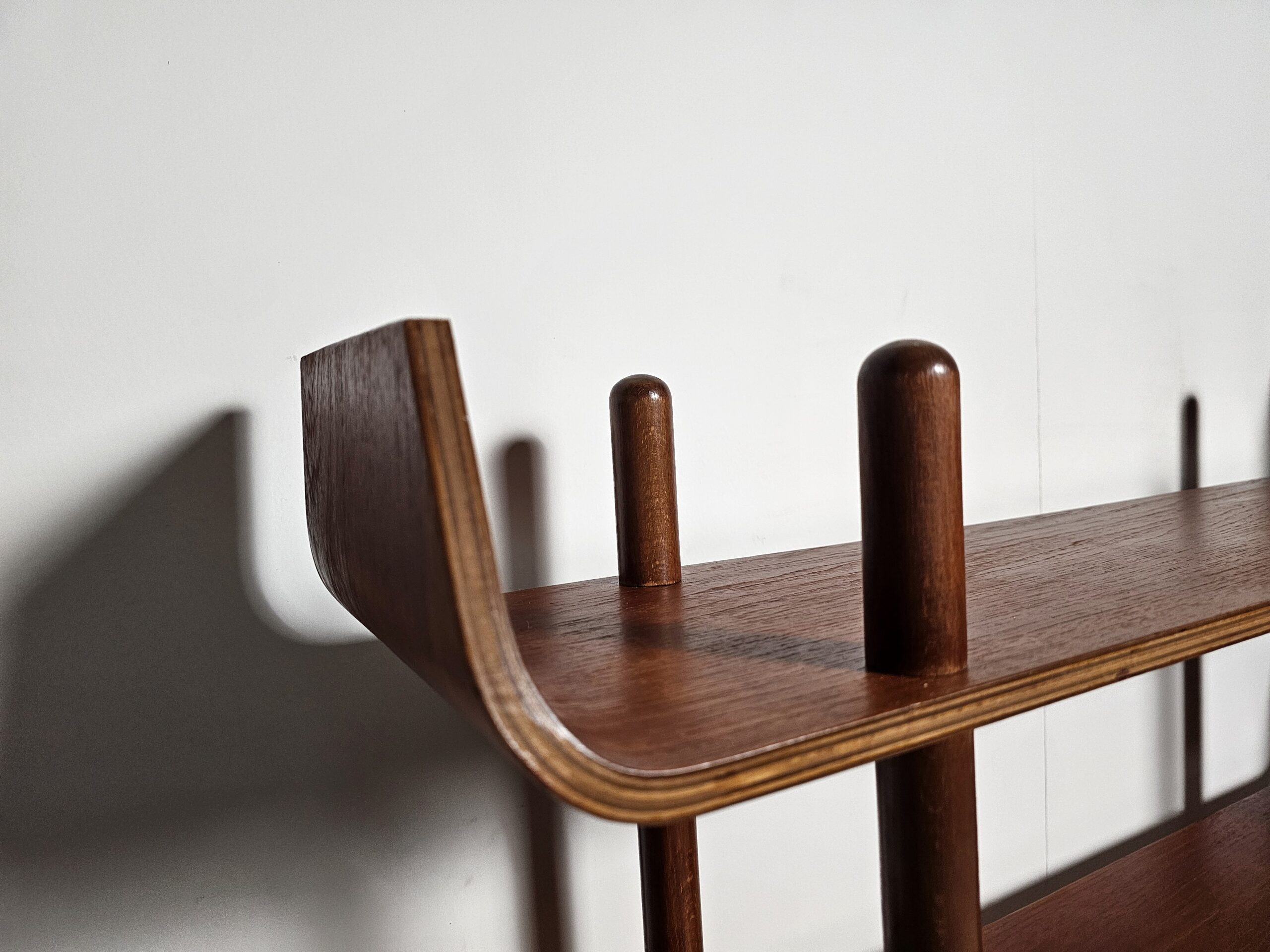 A refined example of Dutch mid-century modern design, this modular bookcase was designed by Willem Lutjens and manufactured by Gouda Den Boer in the 1950s. Lutjens is renowned for his elegant use of bent plywood and his dedication to functional simplicity. This shelving system perfectly illustrates his approach — featuring gently curved ends, interlocking vertical supports, and a balanced, architectural composition that feels both light and sculptural. Crafted from teak veneer plywood, the bookcase combines warmth and precision craftsmanship. Its timeless silhouette makes it ideal for displaying books, ceramics, or decorative objects in a refined modern interior.