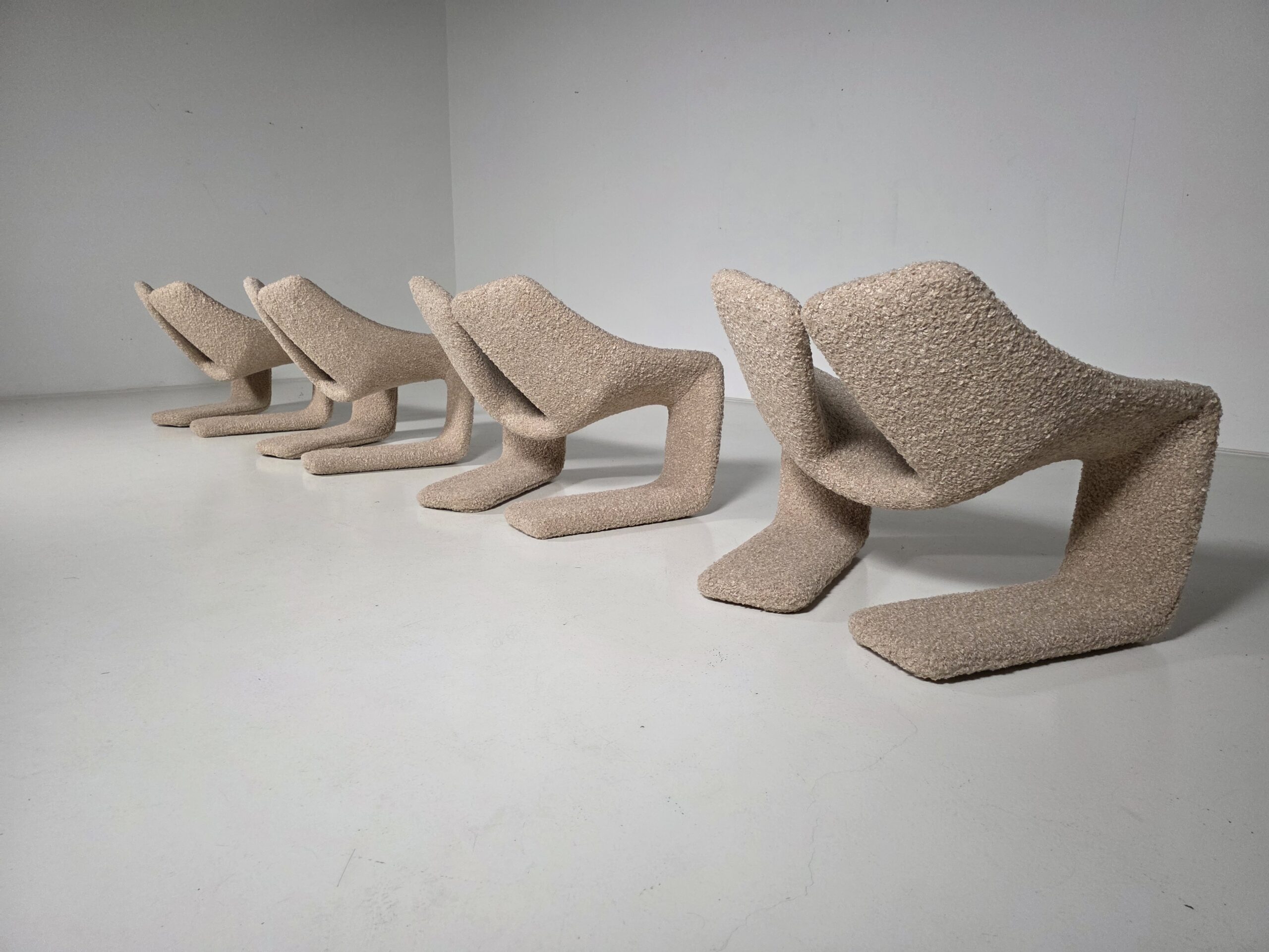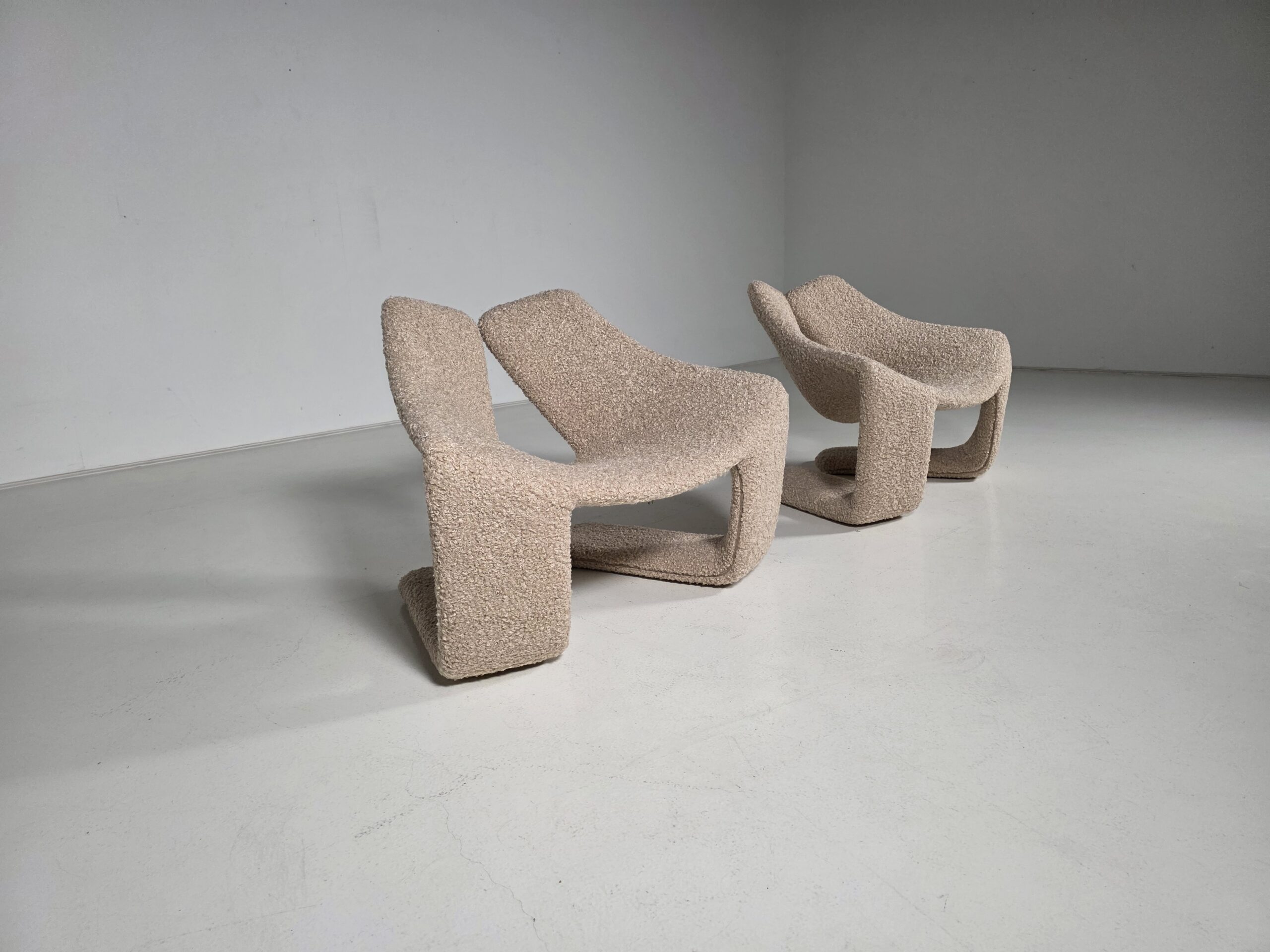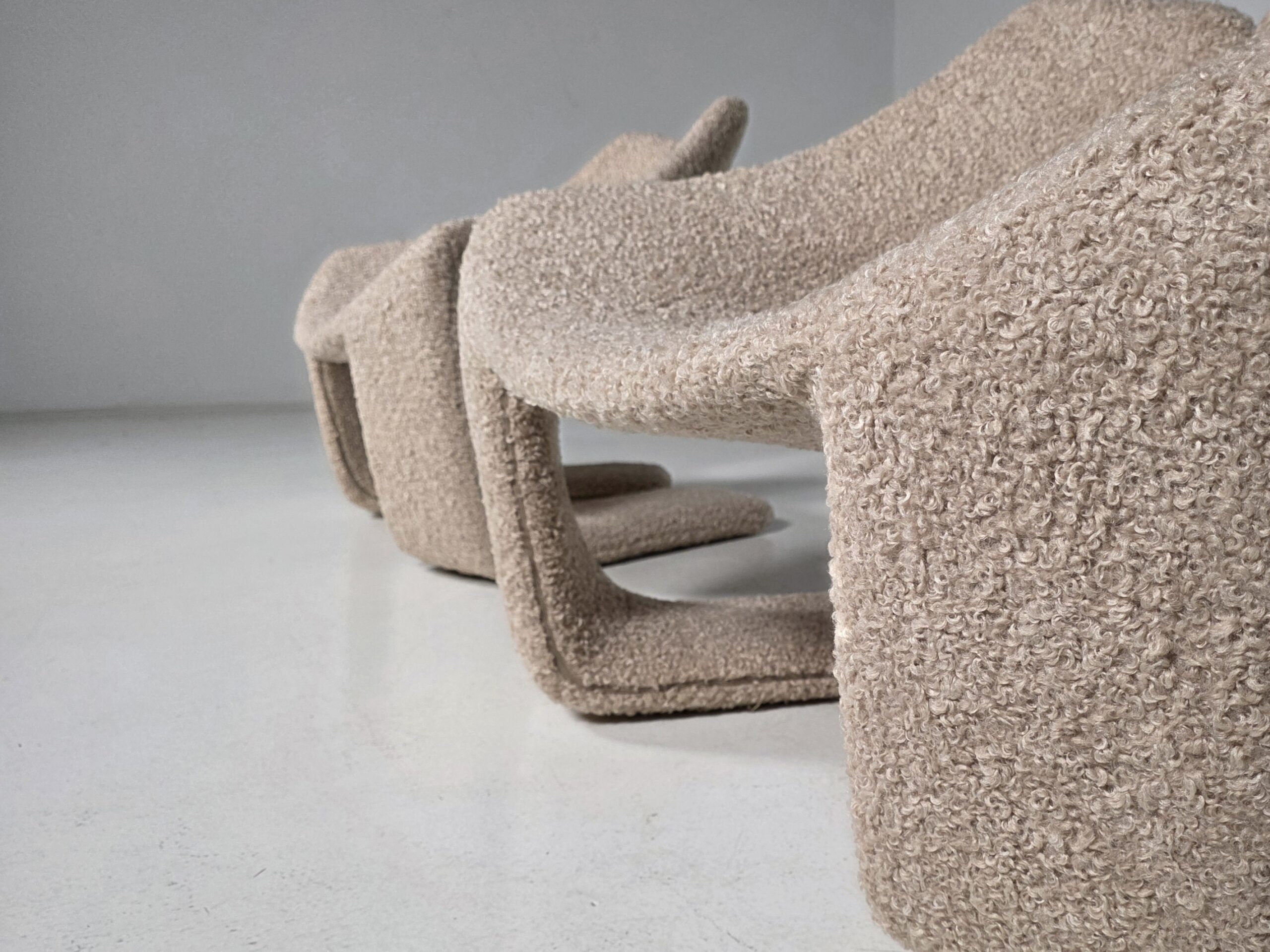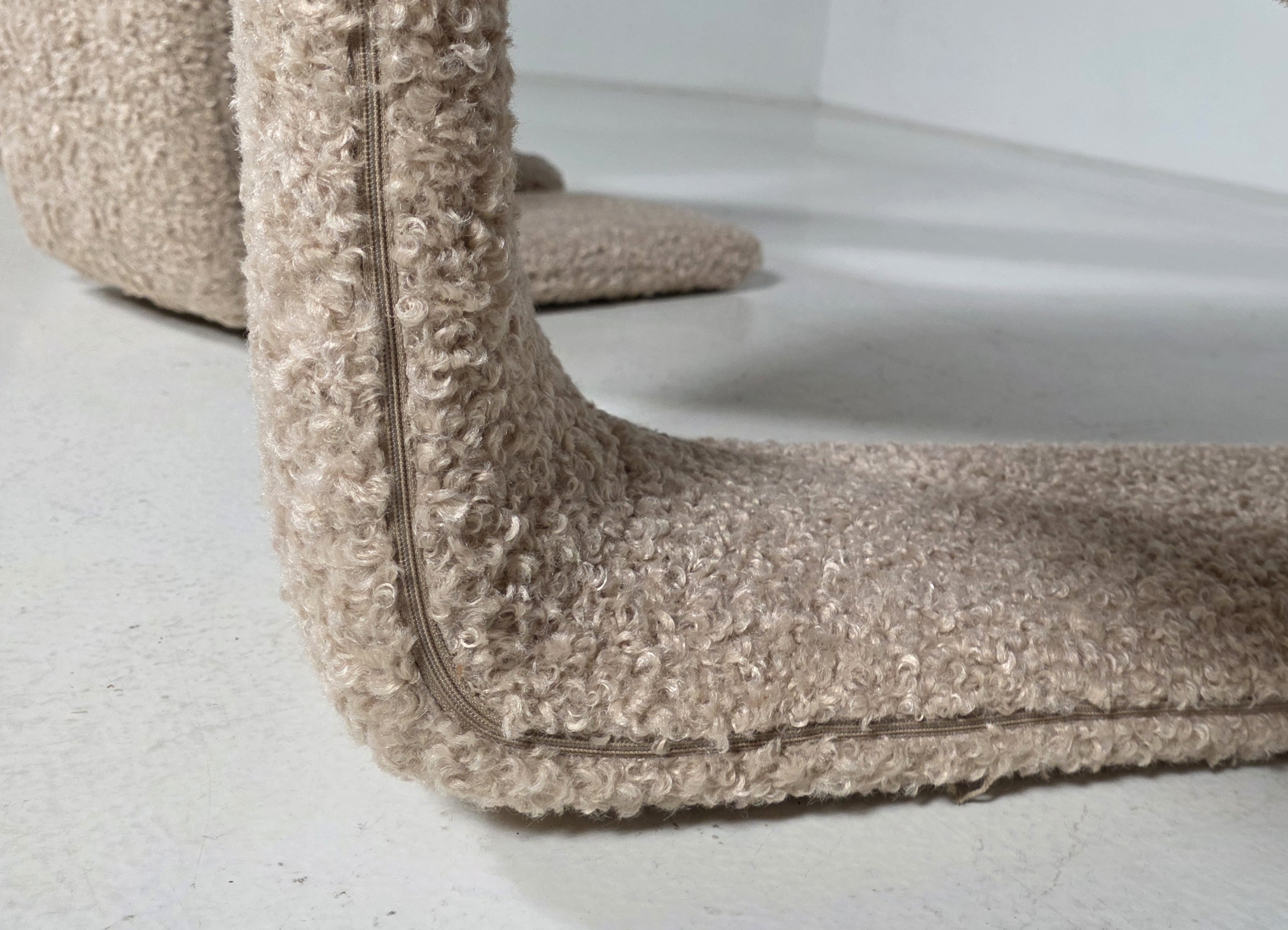 These chairs are a true masterpiece of minimalist design and exceptional craftsmanship. Reupholstered in a stunning beige colour teddy fabric.