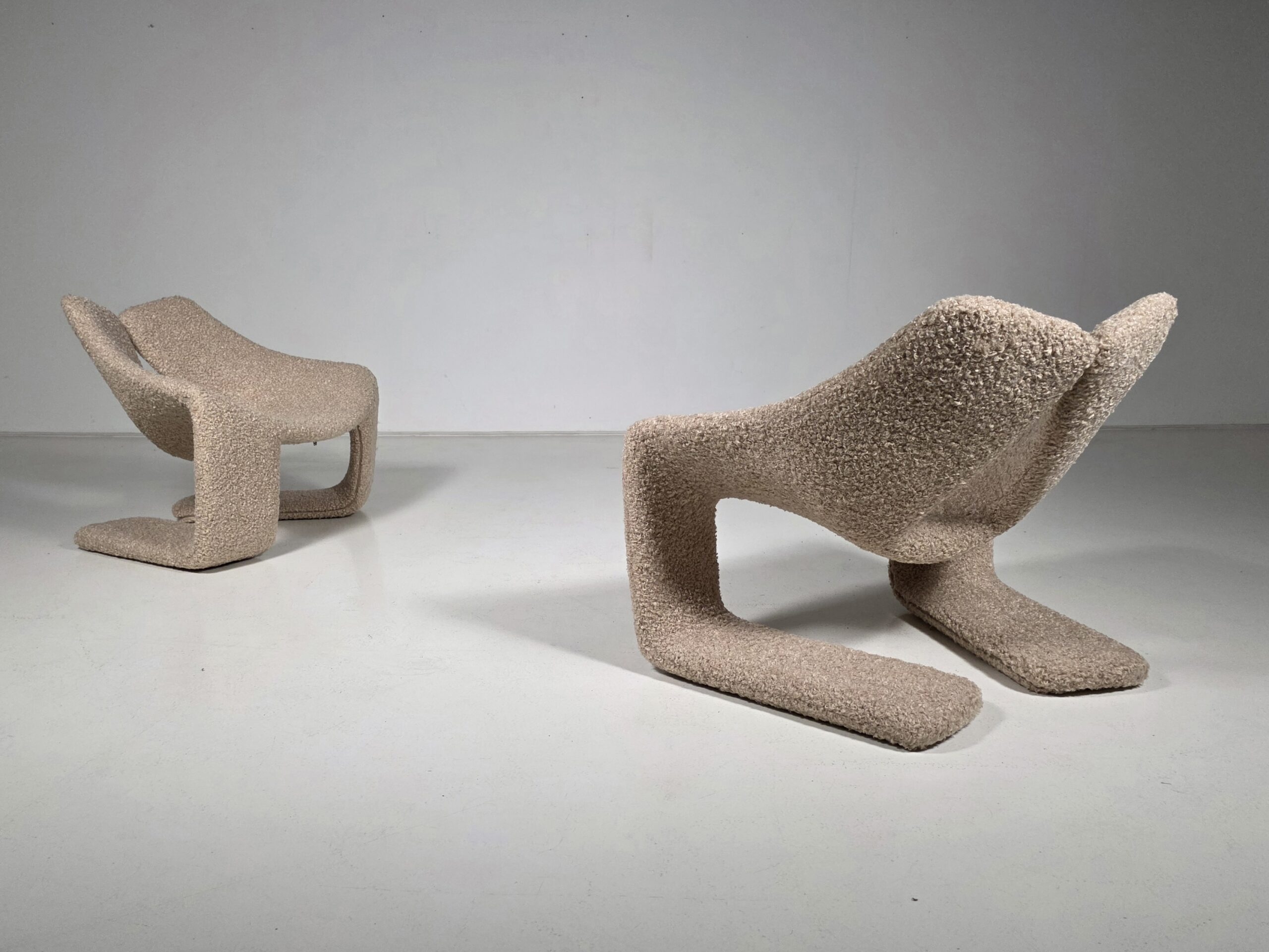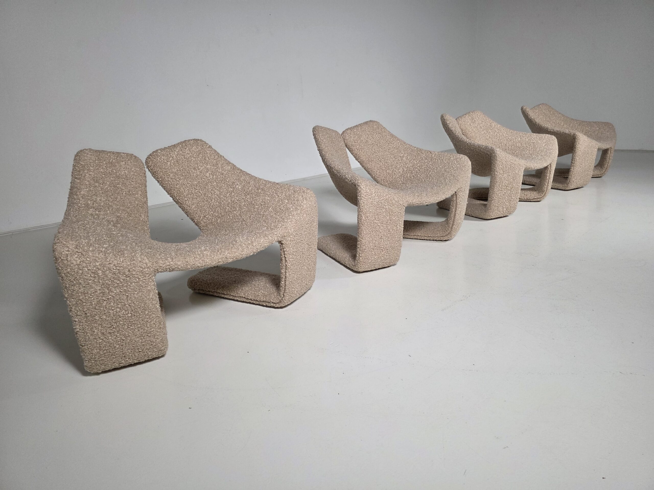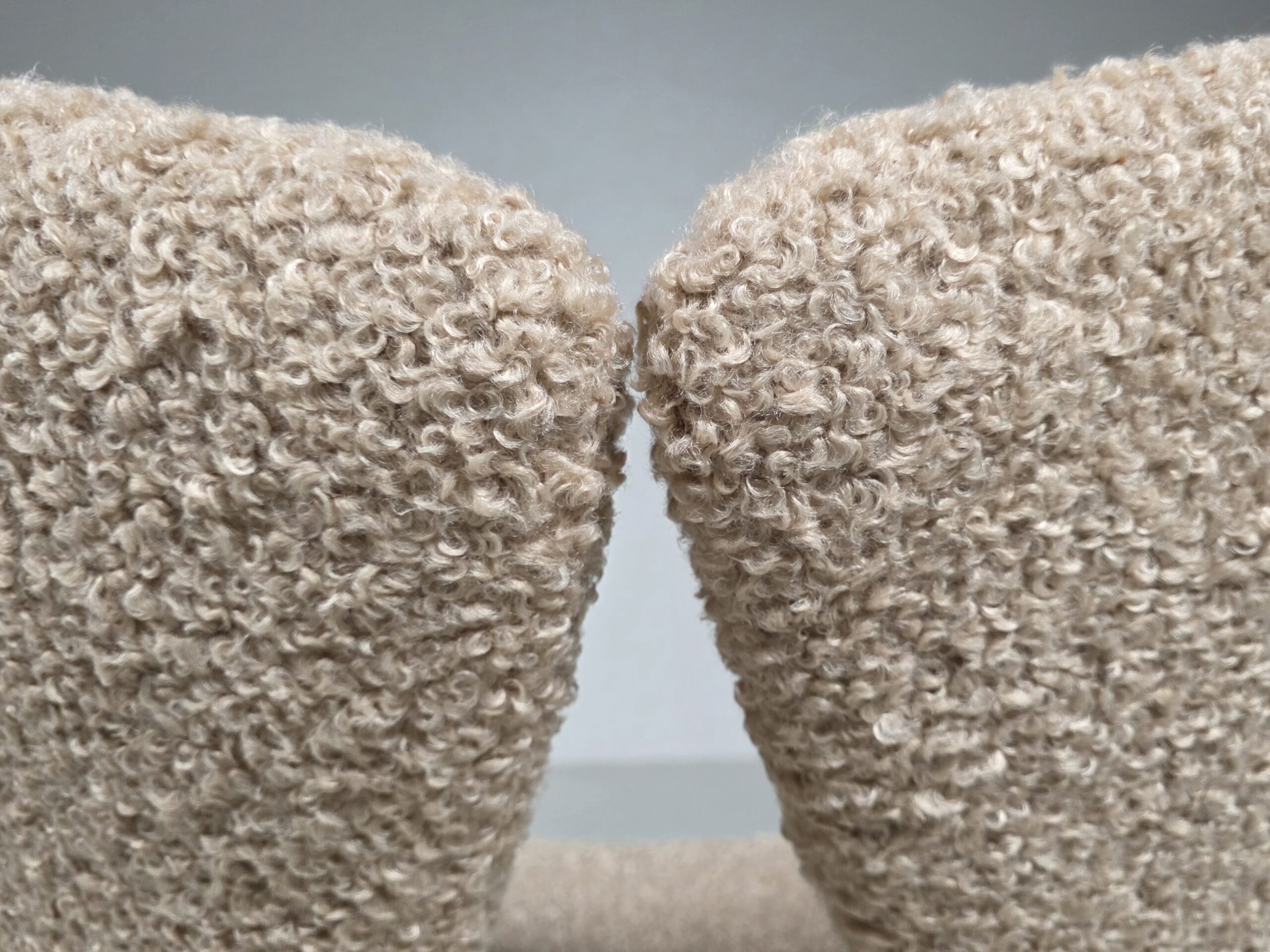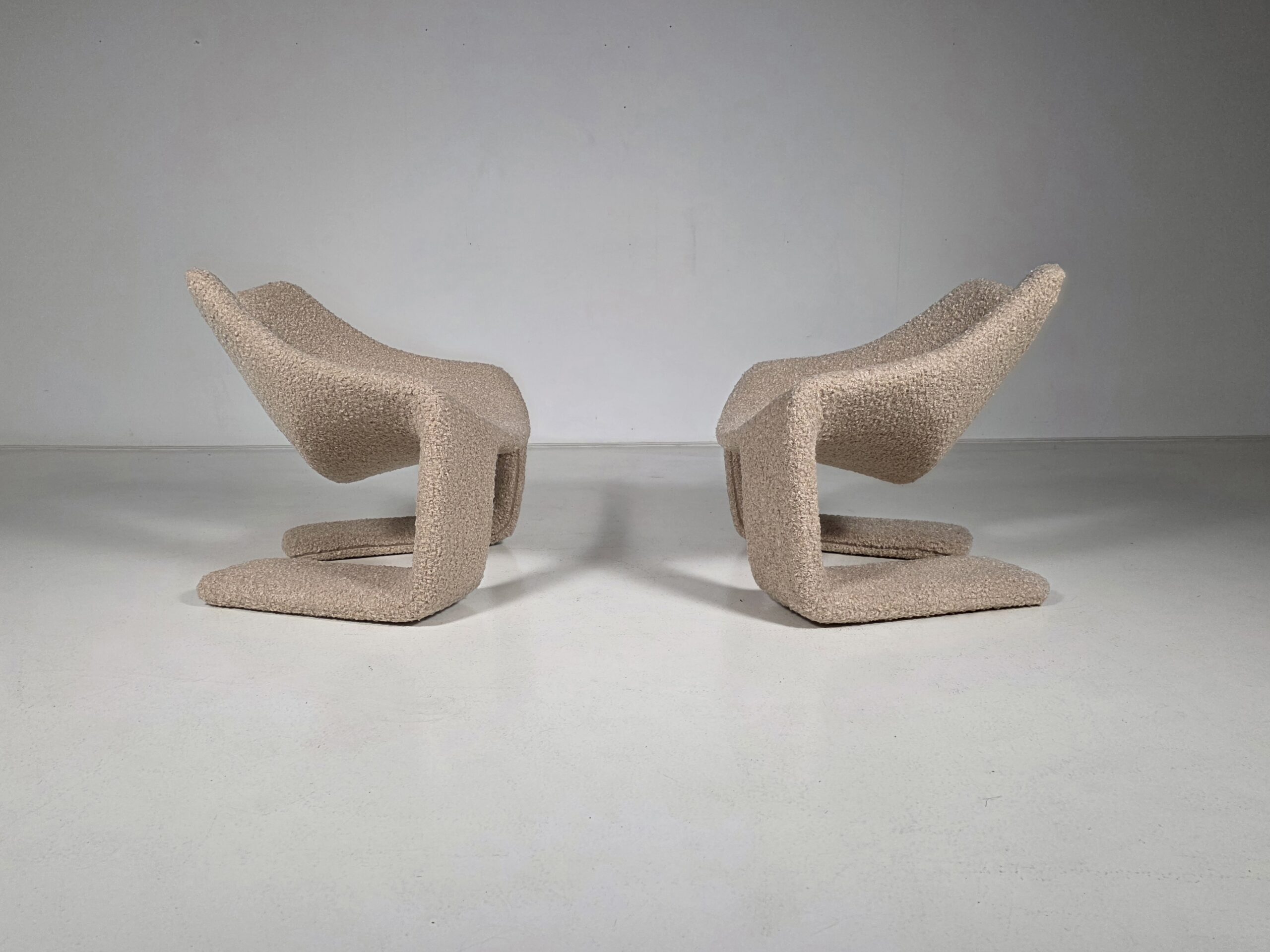 These chairs are a true masterpiece of minimalist design and exceptional craftsmanship. Reupholstered in a stunning beige colour teddy fabric.